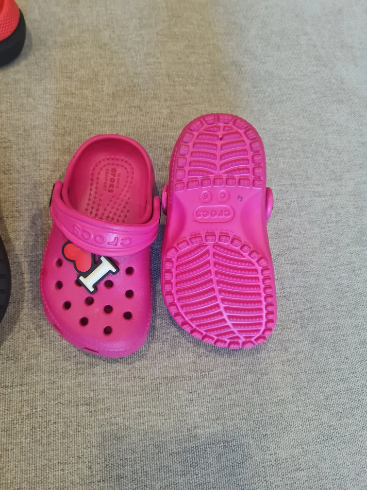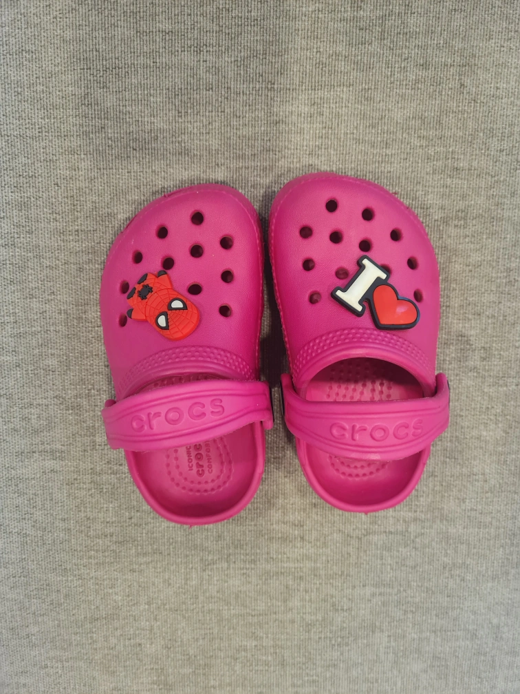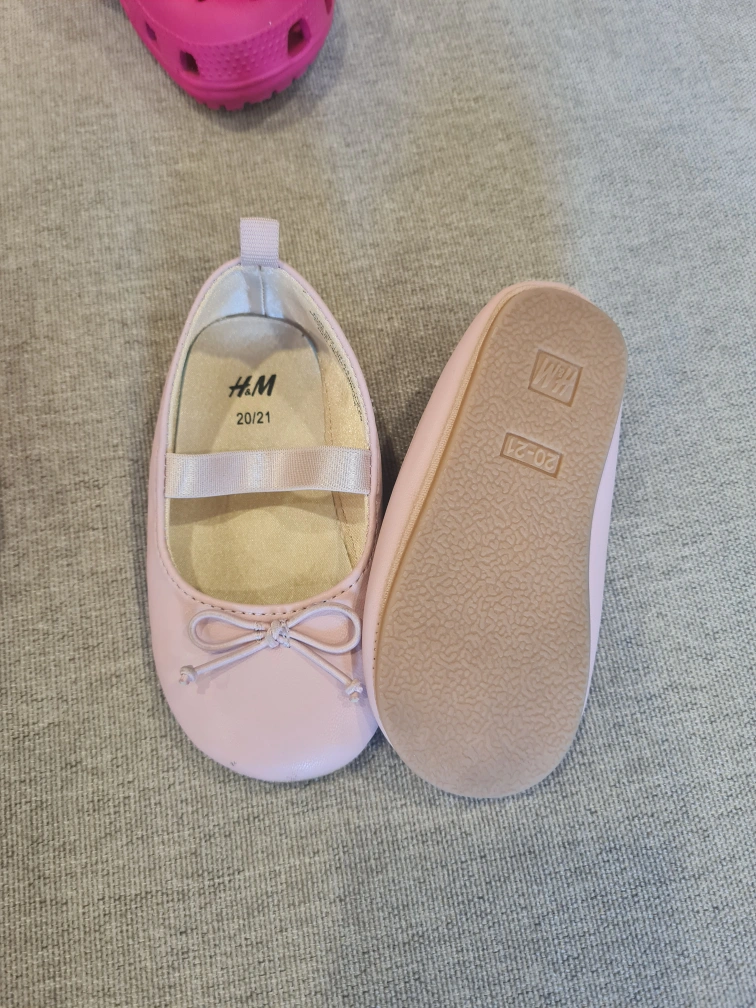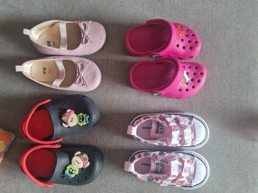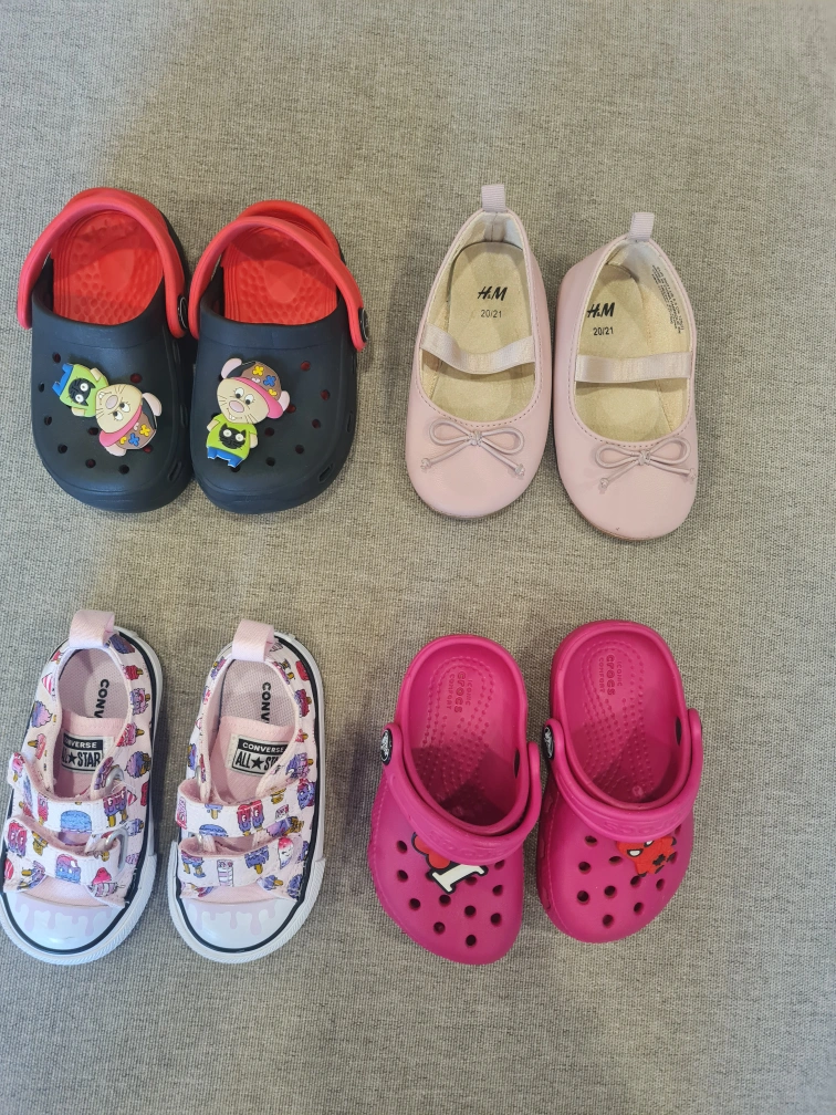 A bundle of baby girl shoes, including a pair of pink H&M ballet flats, two pairs of Crocs (one pink with a Spiderman Jibbitz and one black with a Paw Patrol Jibbitz), and a pair of pink Converse. They are all new