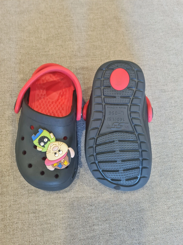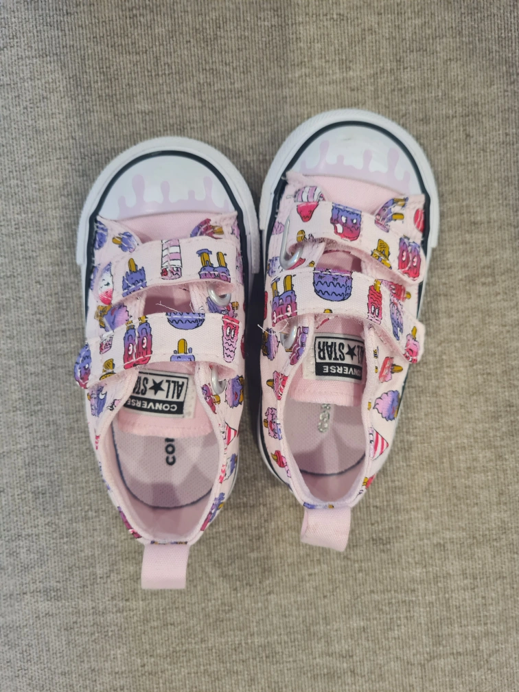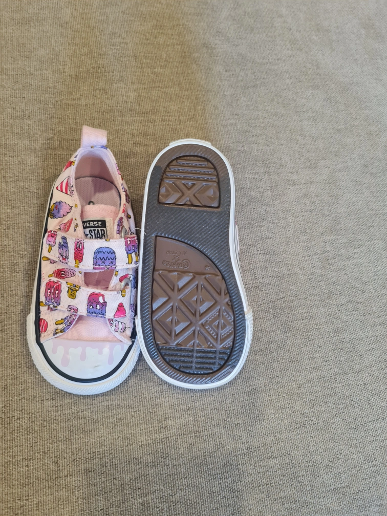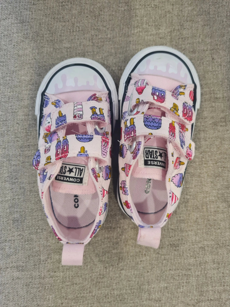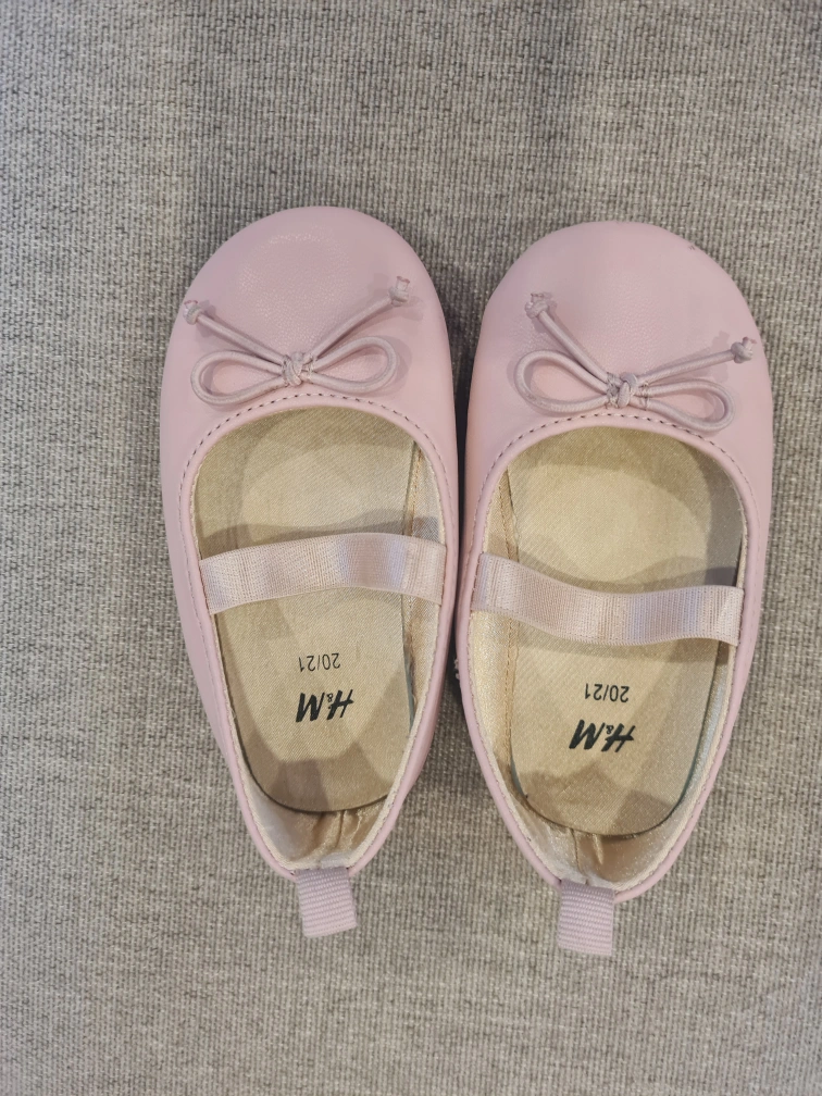A bundle of baby girl shoes, including a pair of pink H&M ballet flats, two pairs of Crocs (one pink with a Spiderman Jibbitz and one black with a Paw Patrol Jibbitz), and a pair of pink Converse. They are all new