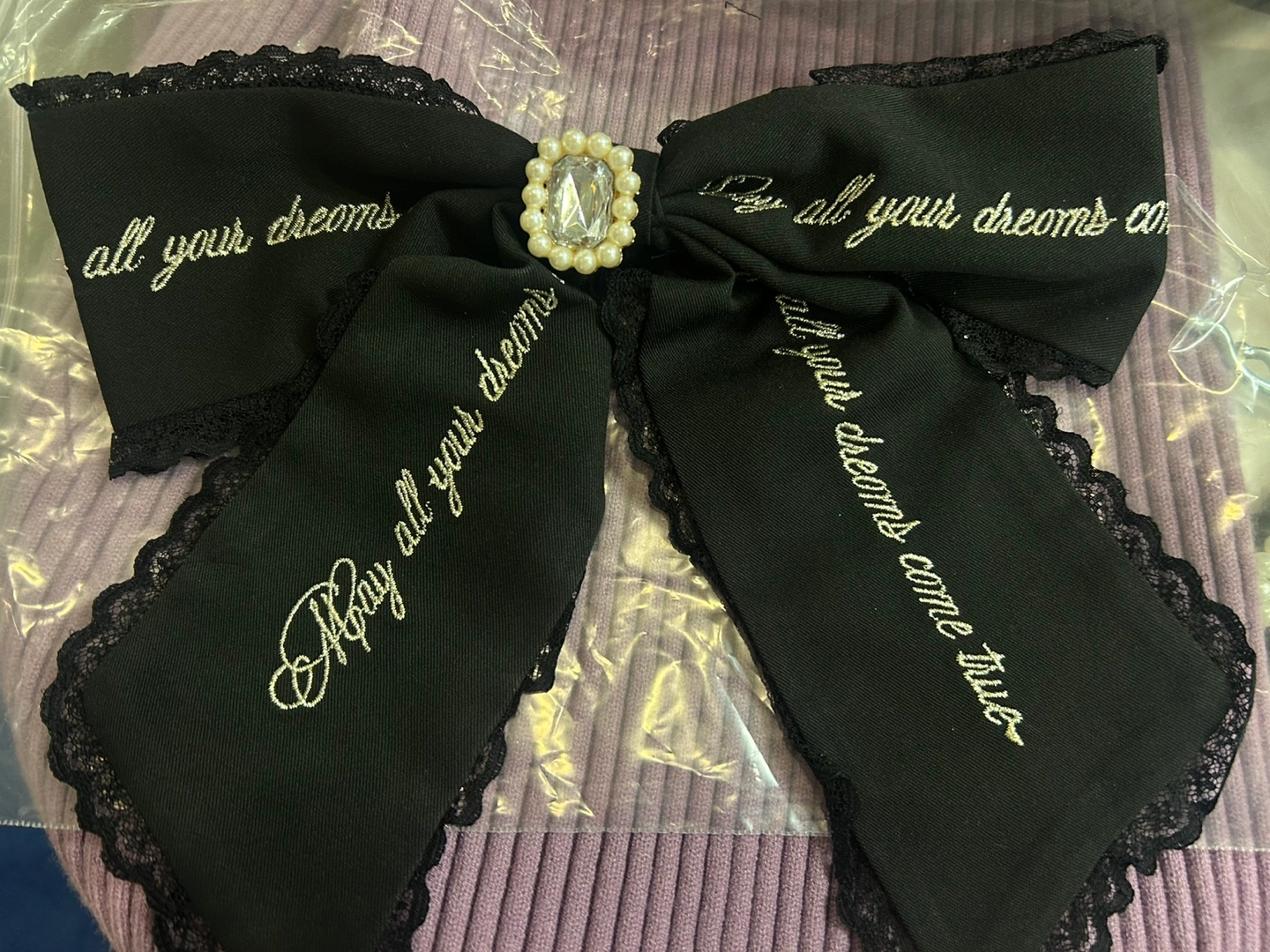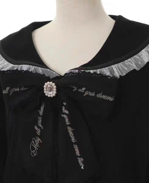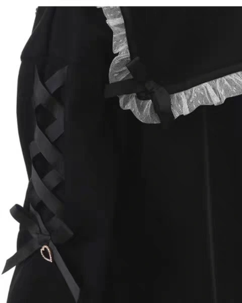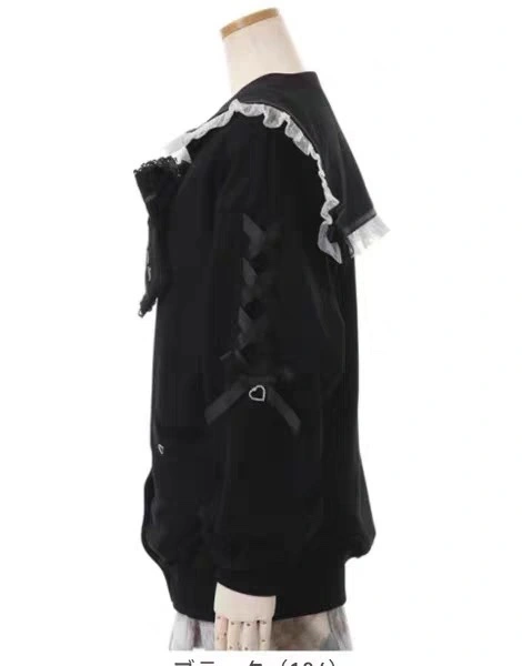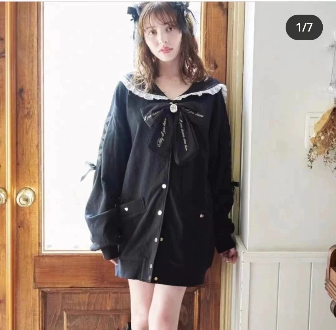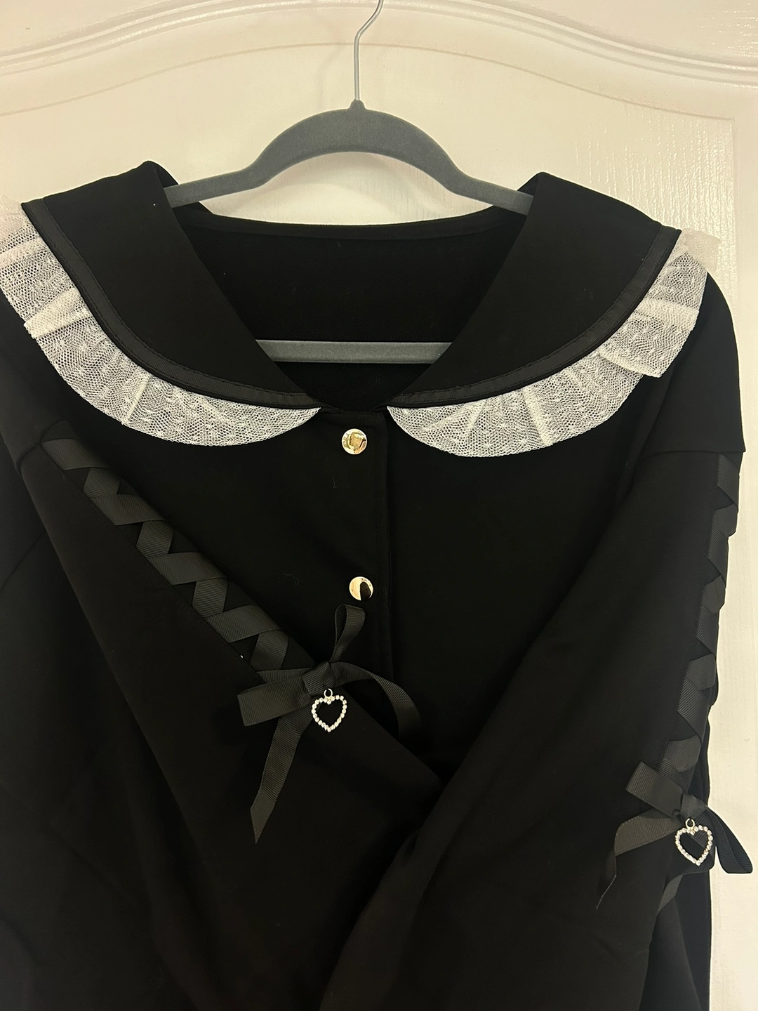 Black cardigan with sailor collar, lace trim, and a large bow. The sleeves have black ribbons that tie at the wrists. Rare find. Size M. Brand new in package.