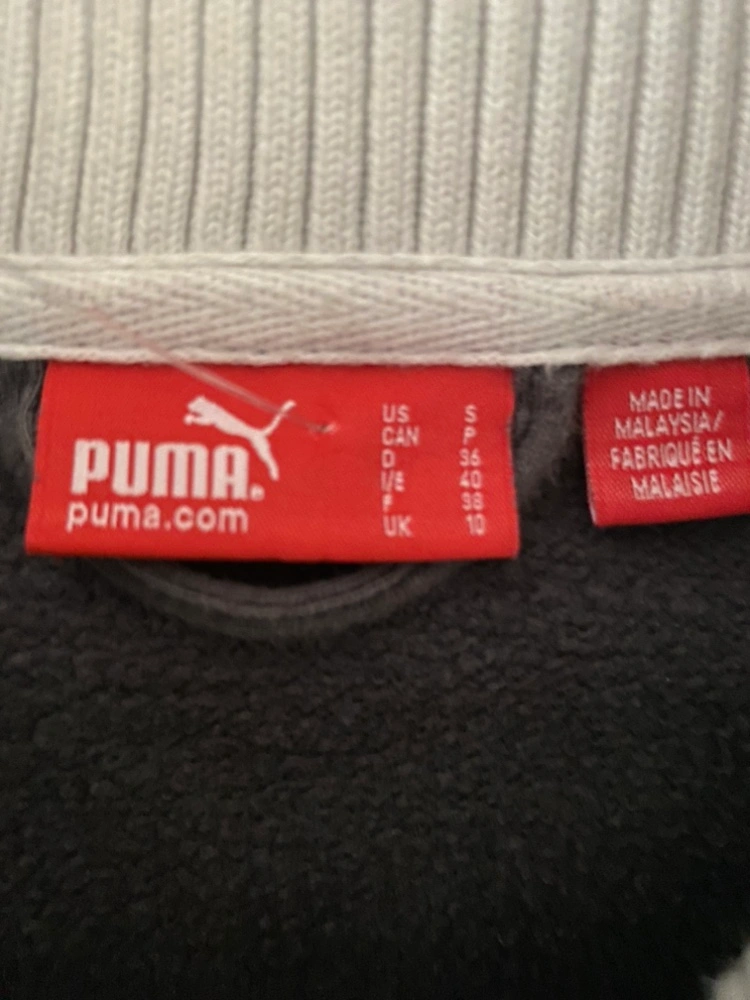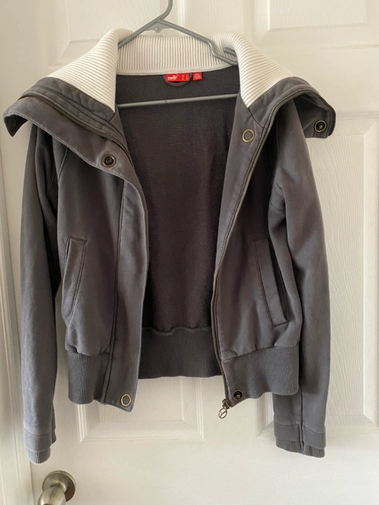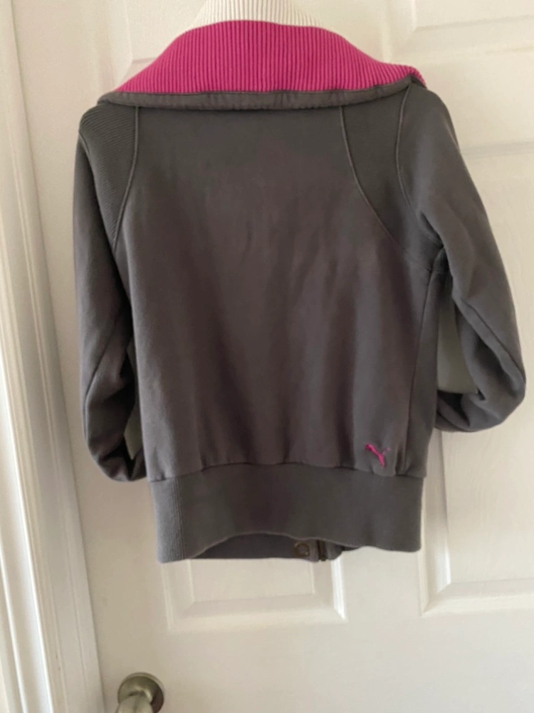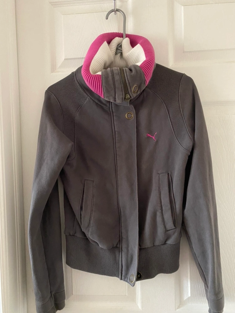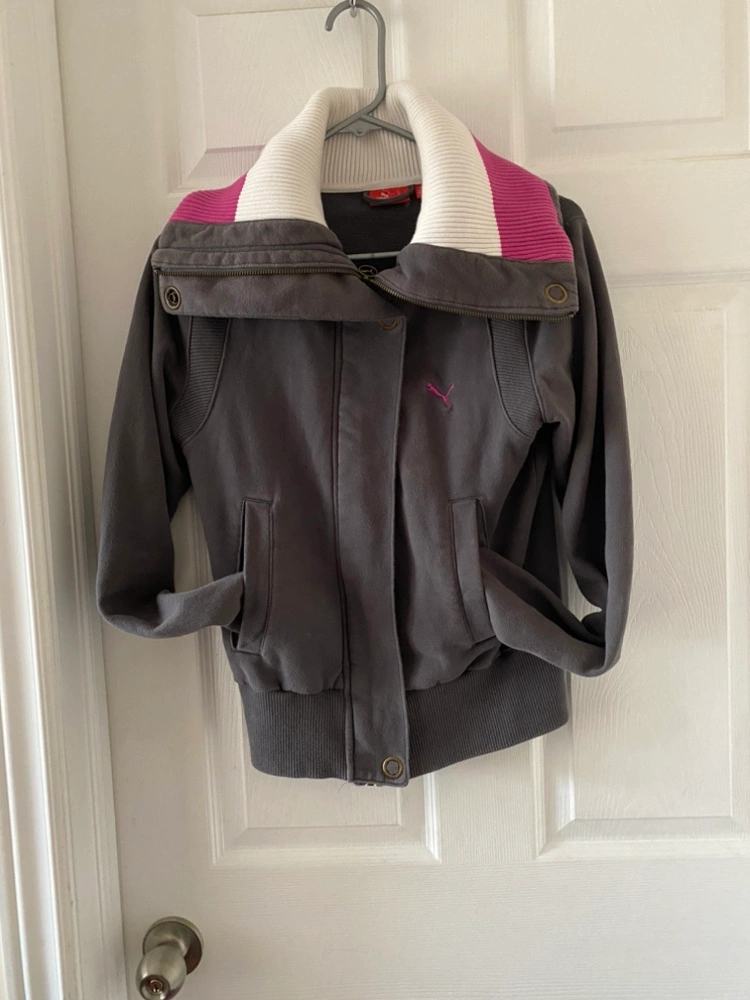 Grey jacket with pink detailing. The collar is white with a pink trim. The jacket has a zip up front. The jacket has a Puma logo on the front and back. Size: S Cash only