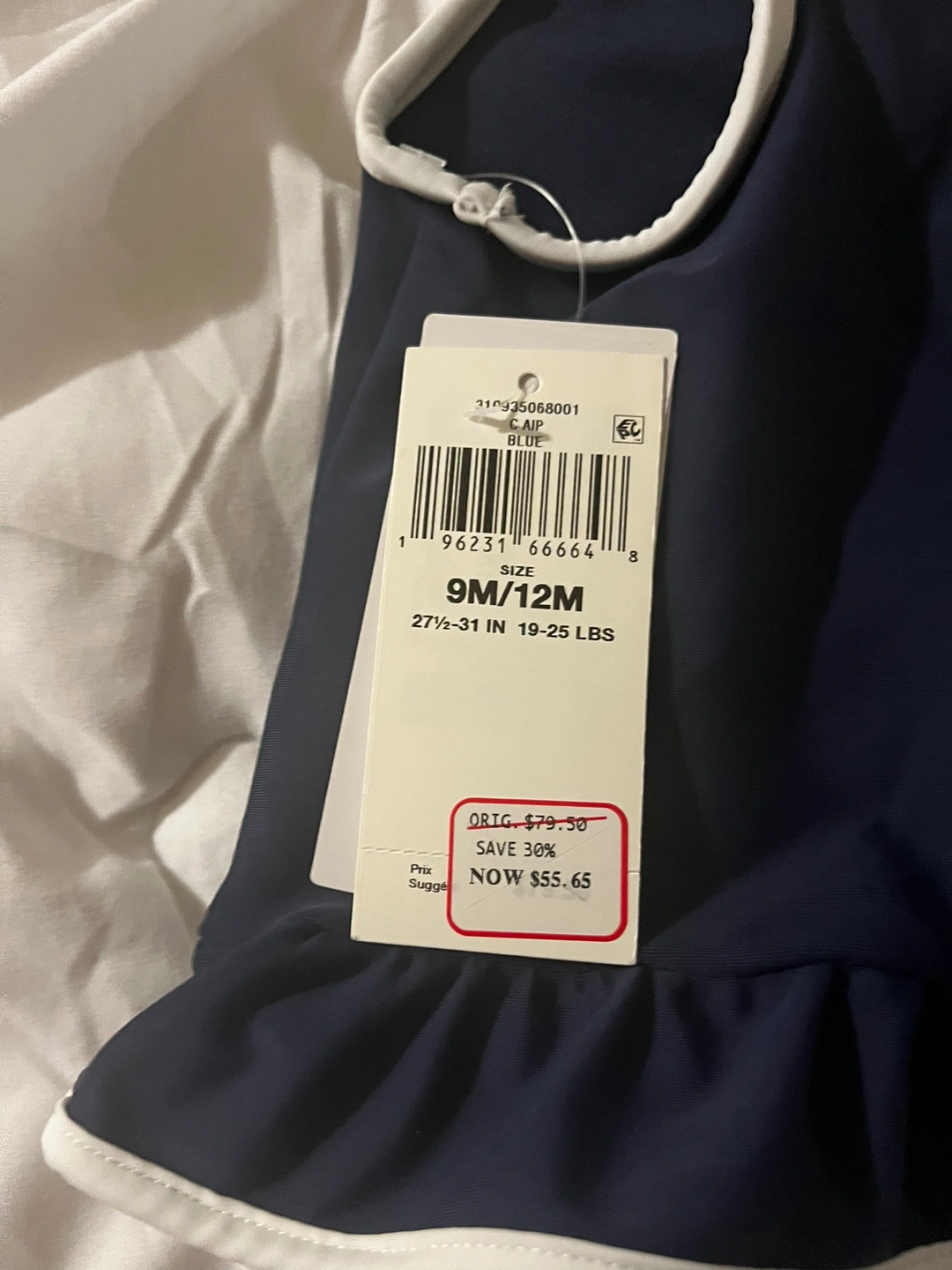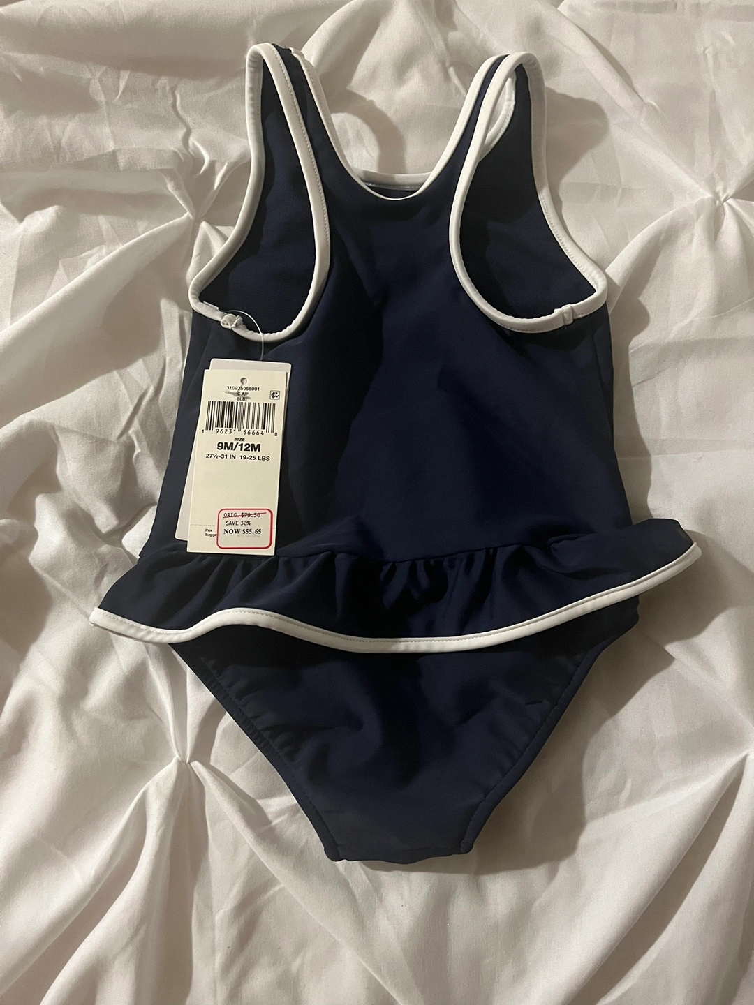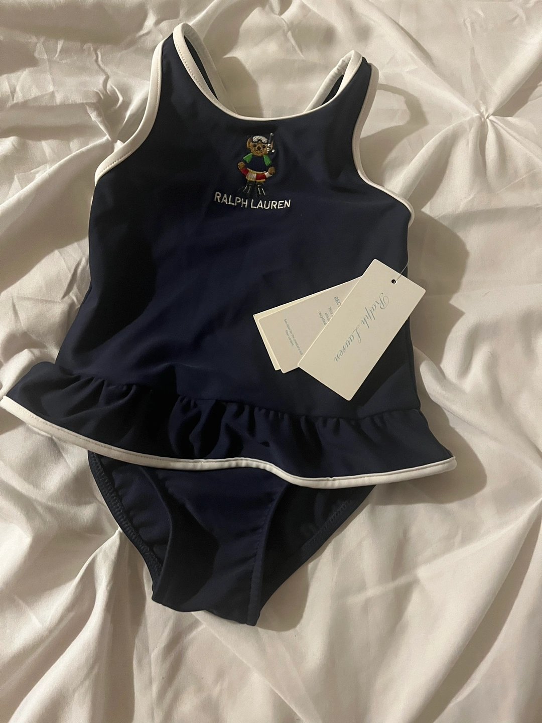 Navy blue one-piece swimsuit with a bear graphic and ruffle trim. Size 9-12 months.