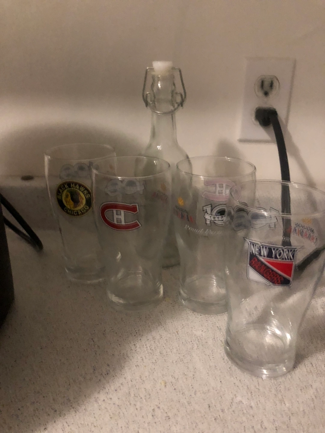 Set of four glasses, each featuring a different hockey team logo. They are made of glass.