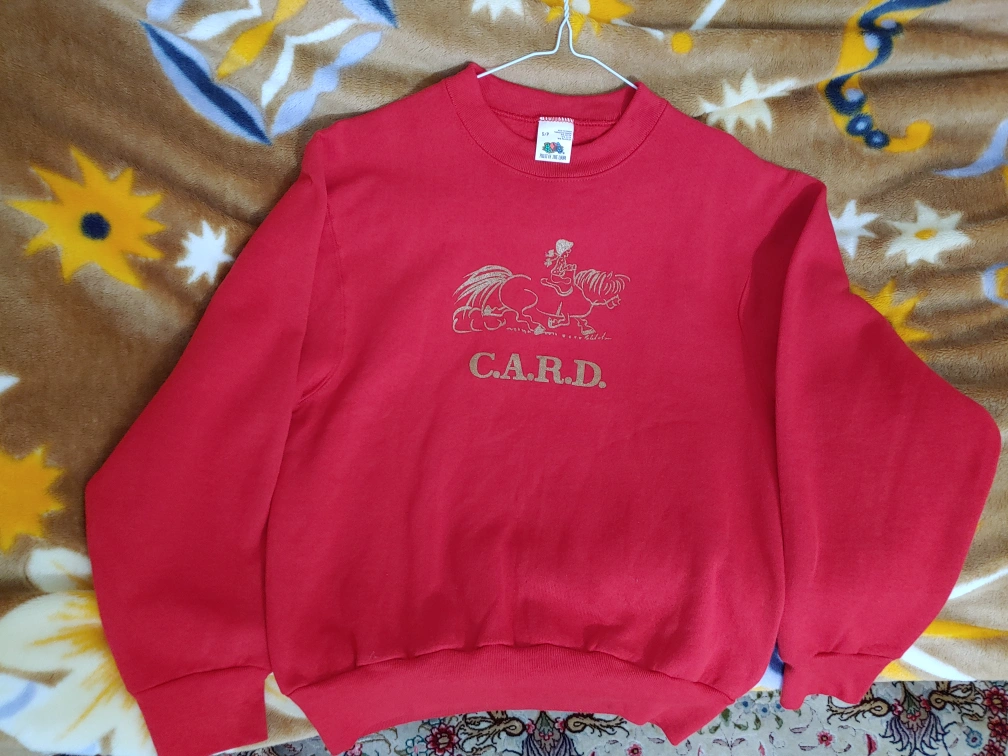 Red C.A.R.D. sweatshirt with a gold embroidered logo. It has a crew neck and long sleeves.