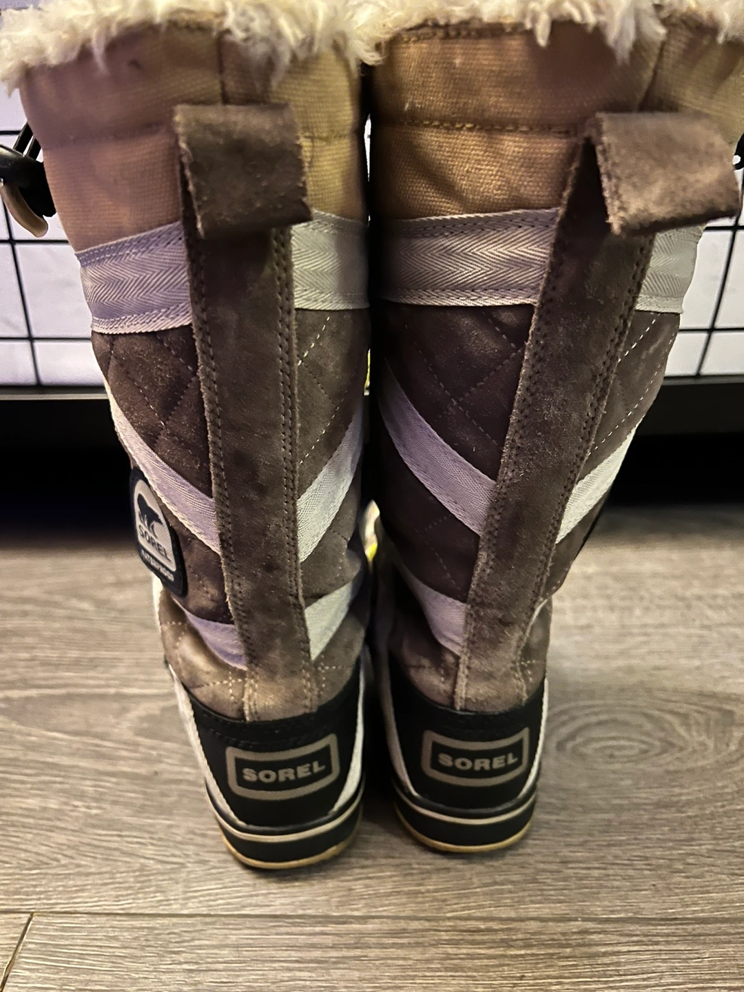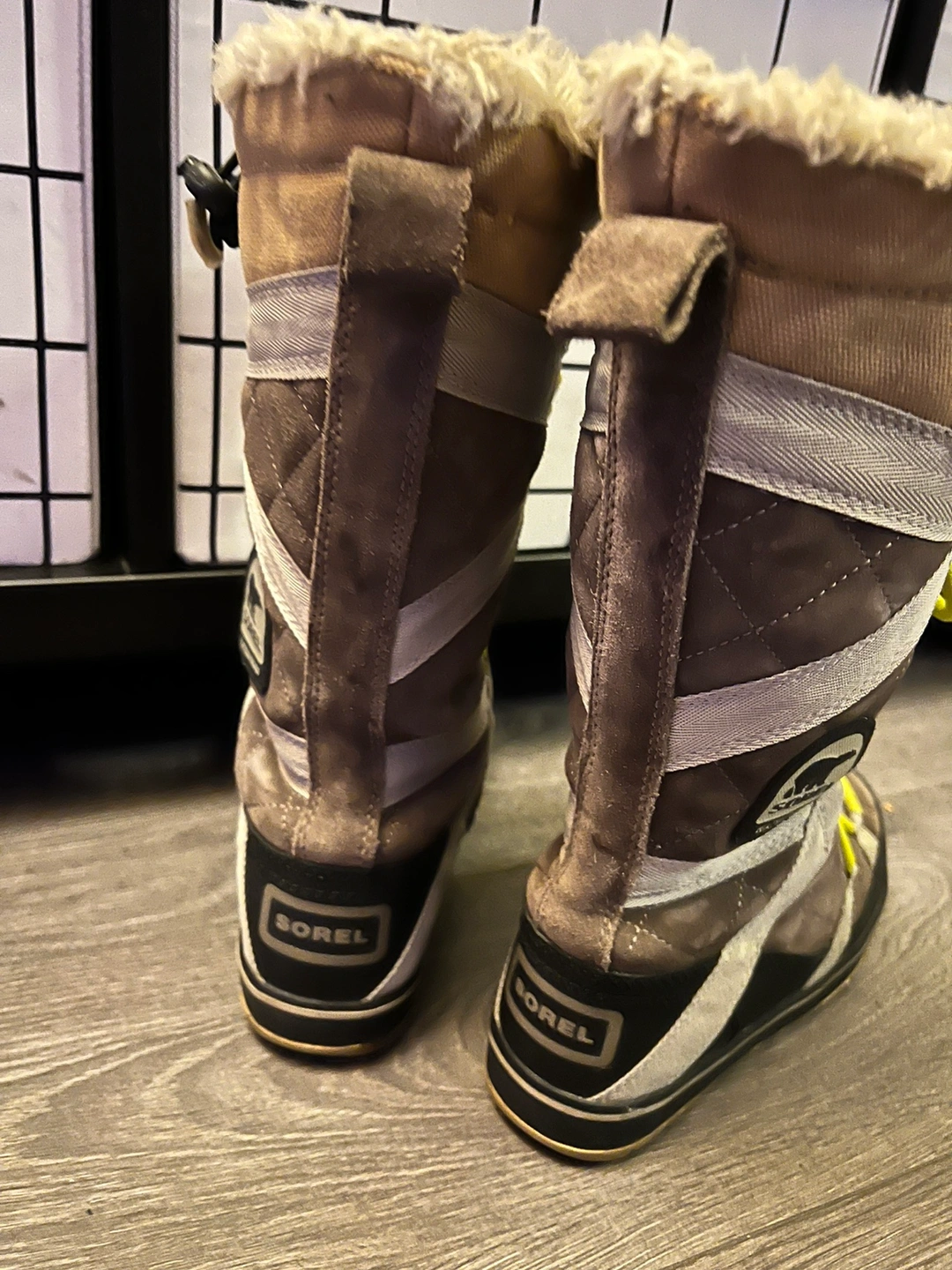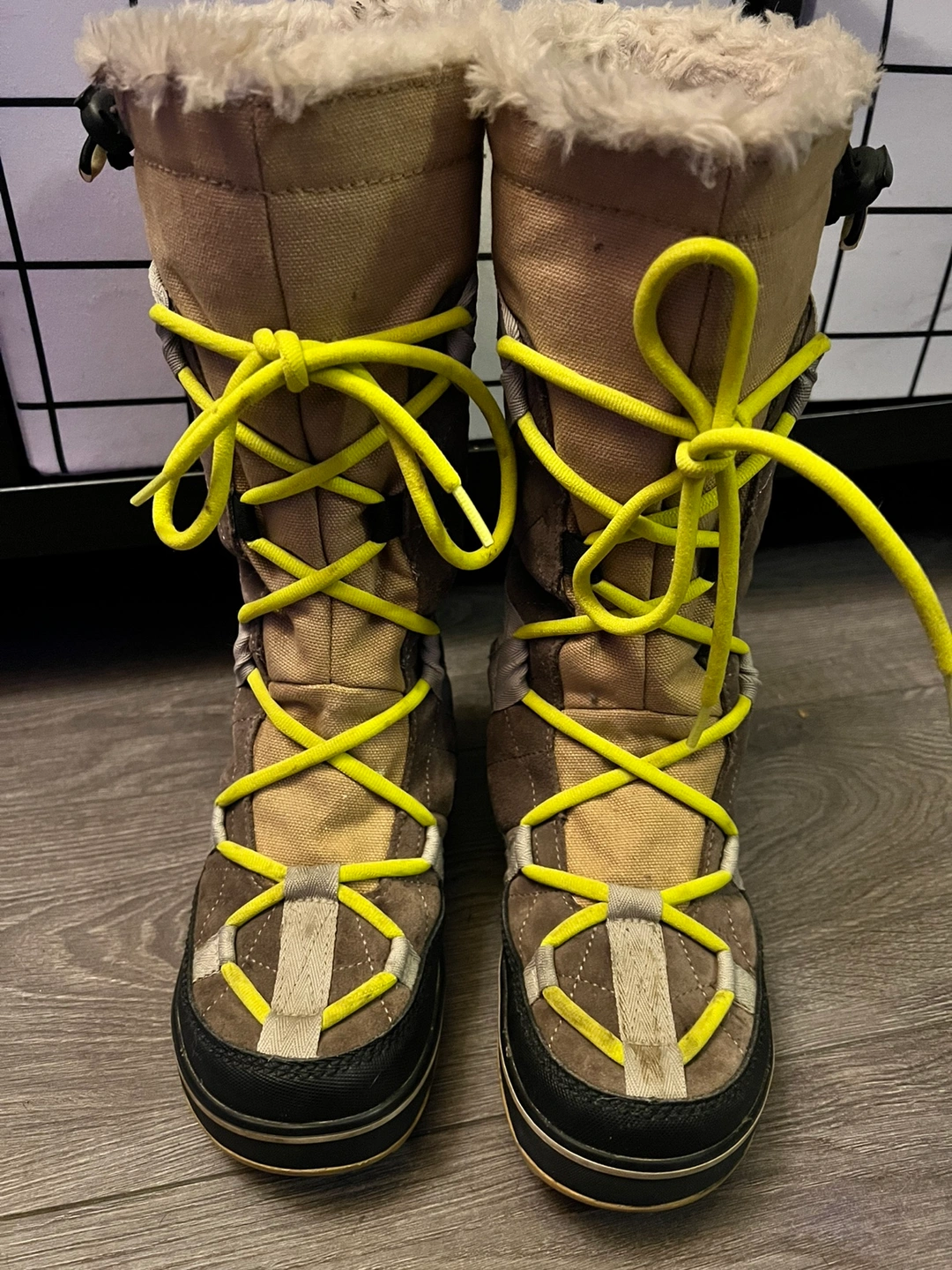 Women's size 5 Sorel winter boots with a warm, faux fur lining. The boots have a grey suede upper and a black rubber sole. They feature a neon yellow lace and a white accent strip on the back.