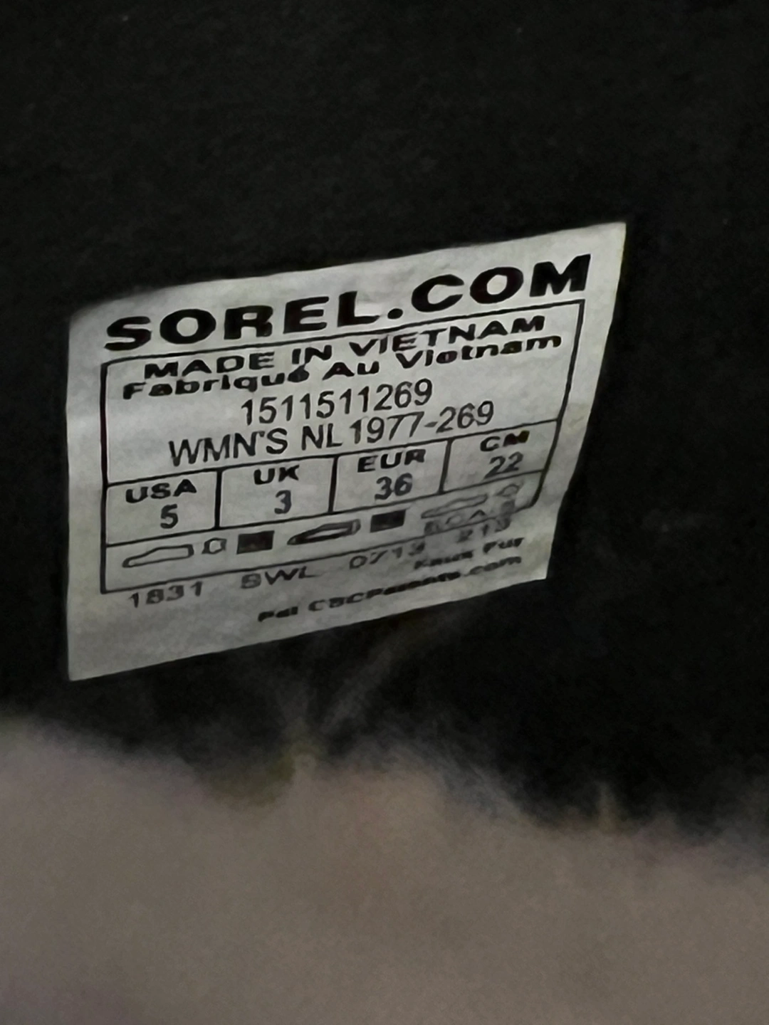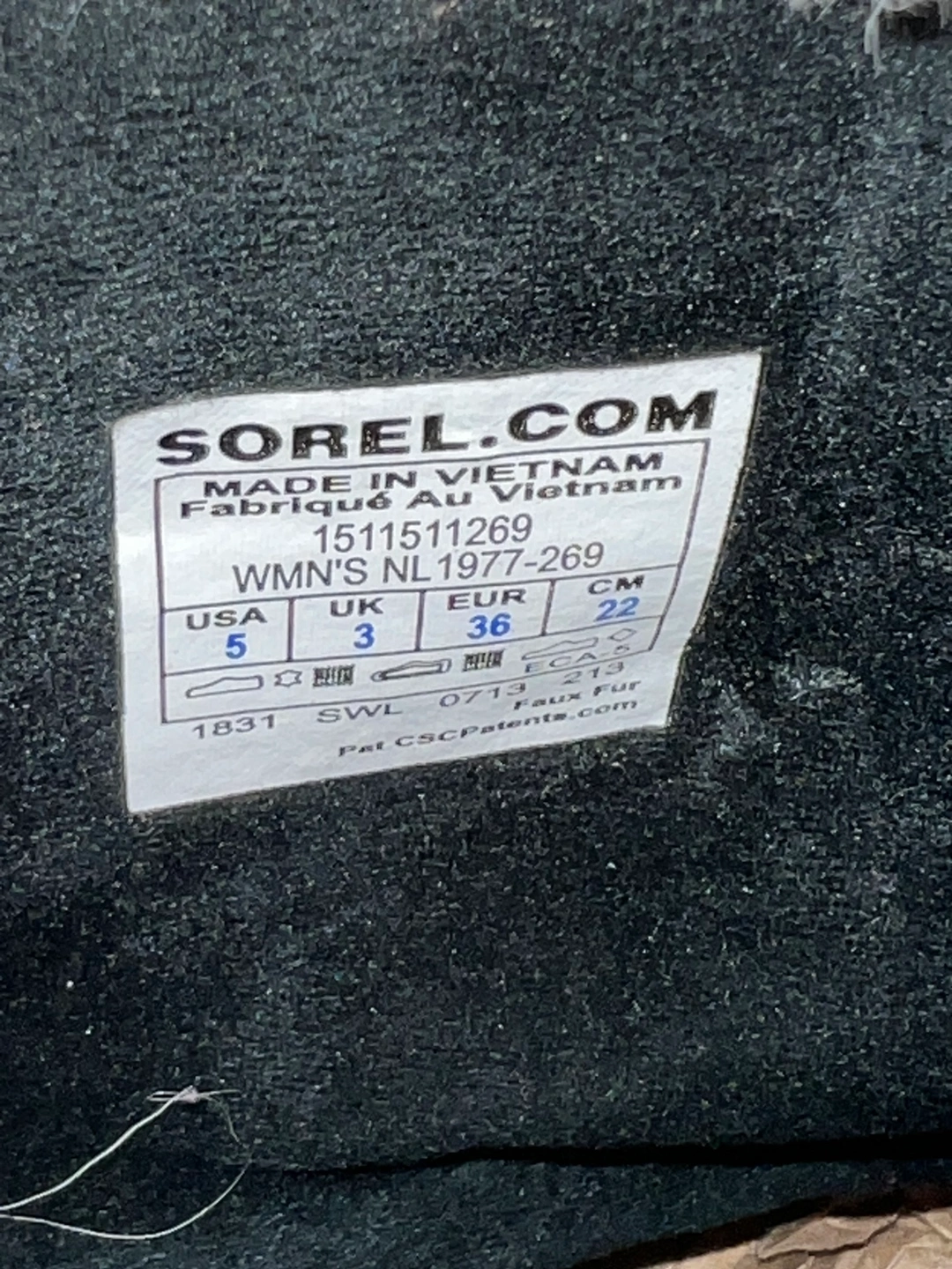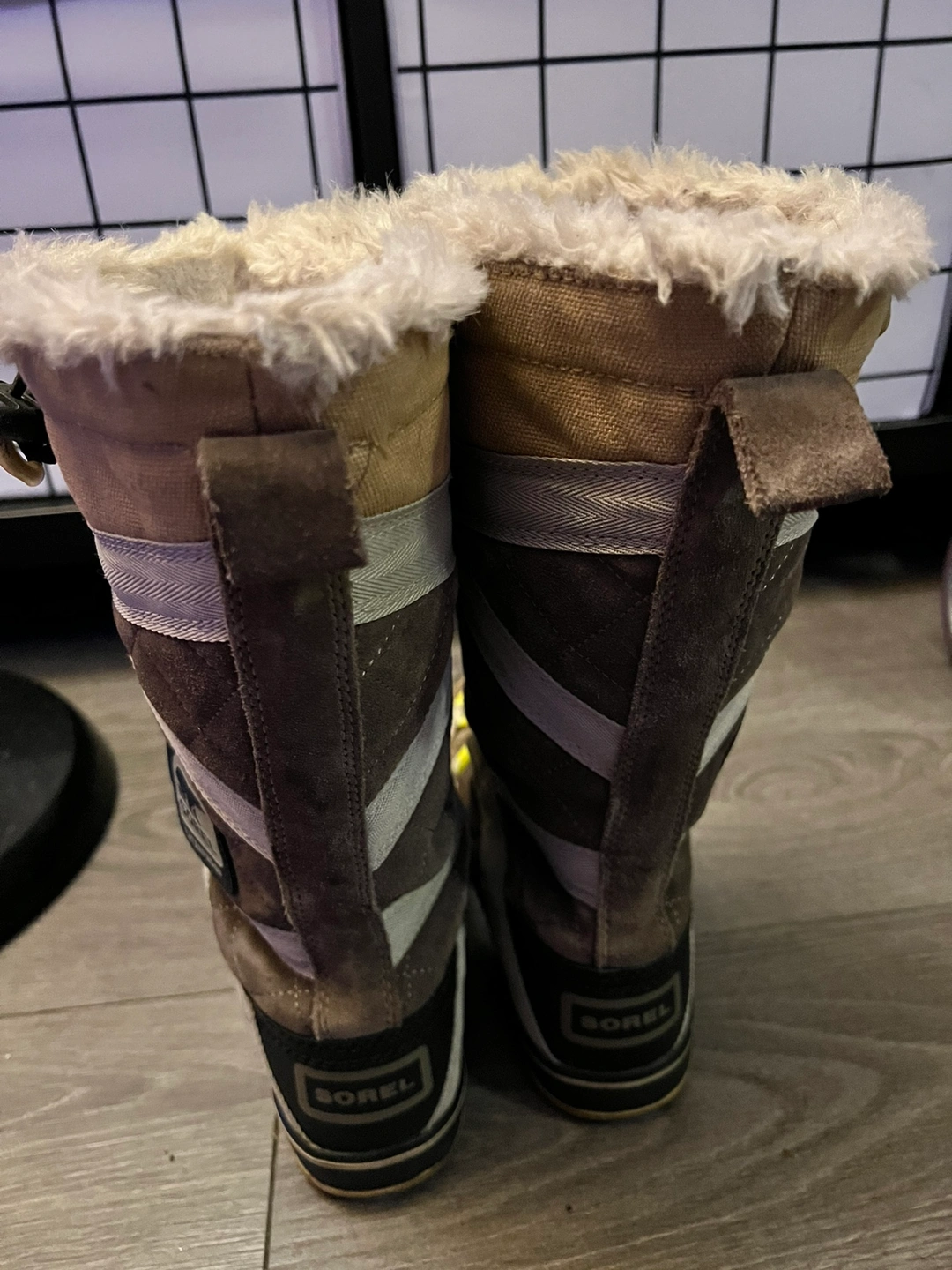 Women's size 5 Sorel winter boots with a warm, faux fur lining. The boots have a grey suede upper and a black rubber sole. They feature a neon yellow lace and a white accent strip on the back.