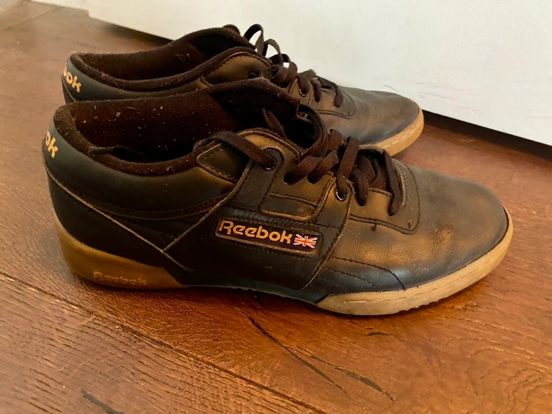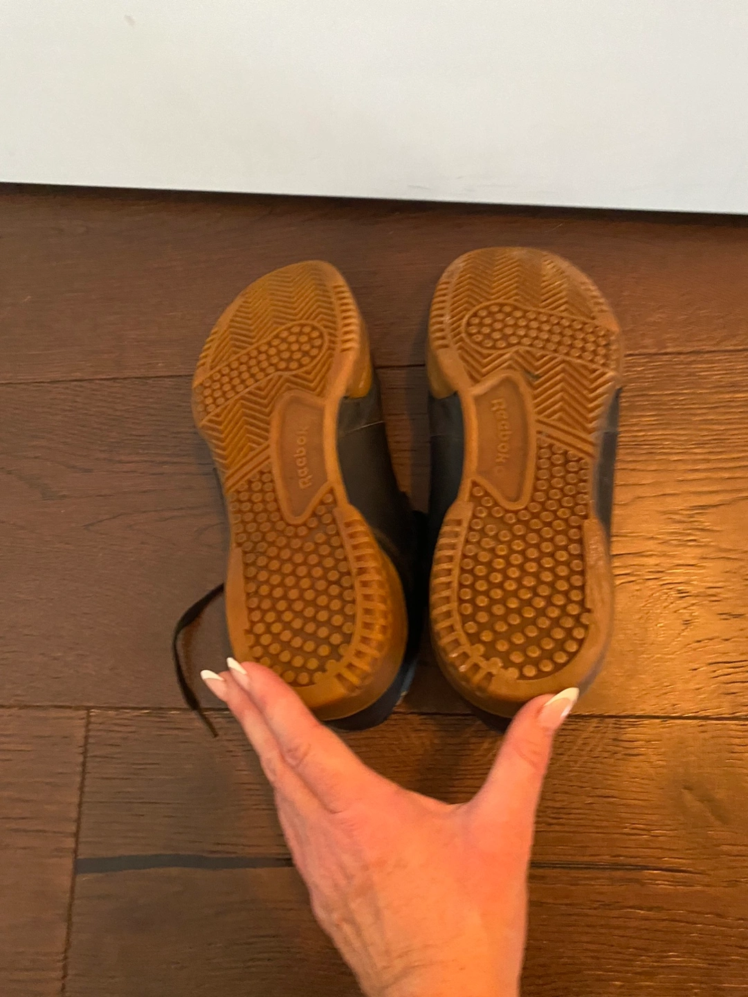 Men’s Size 10.5 Reebok sneakers in black leather with a gum sole. The shoes have a vintage look. My son wore these a couple times but hasn’t worn them in a few years so I decided it is time for them to find a new home.