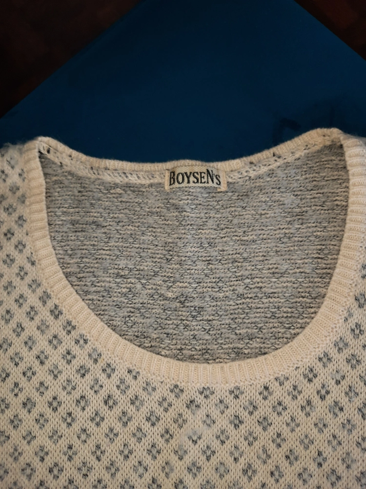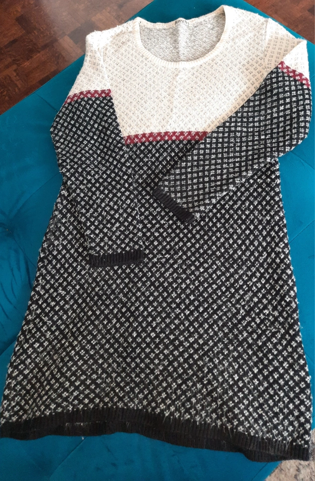 Long-sleeved sweater dress with a black, white and red colour scheme. It has a round neckline and a fitted silhouette.