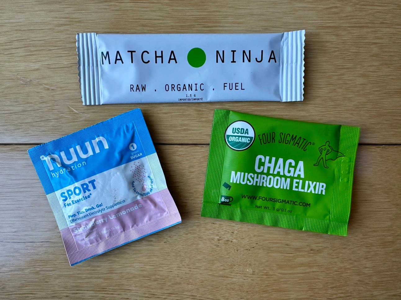 One Matcha Ninja energy bar, one nuun Sport hydration tablet and one Four Sigmatic Chaga Mushroom Elixir packet. CHAGA Mushroom Elixir. nuun hydration, Strawberry Lemonade.