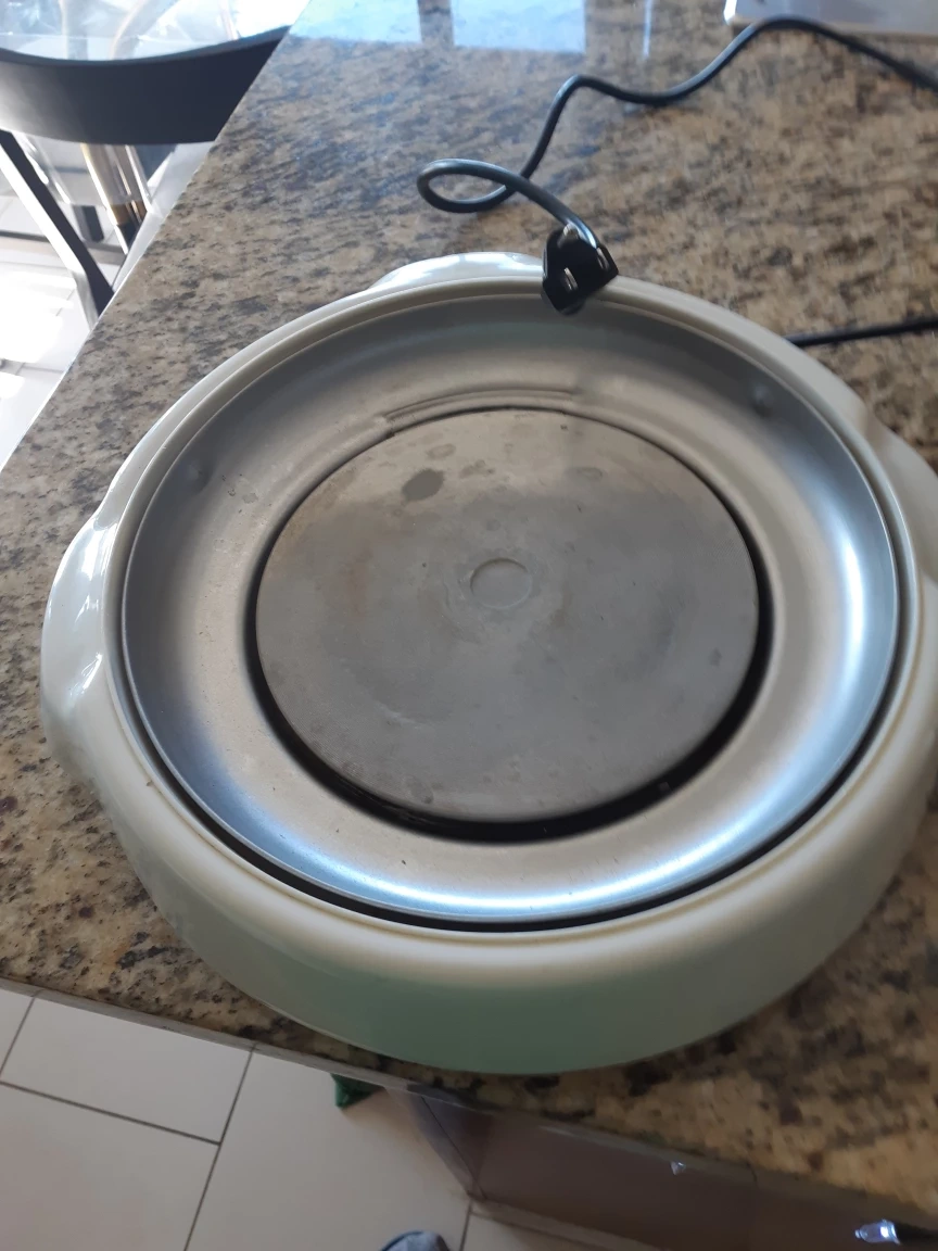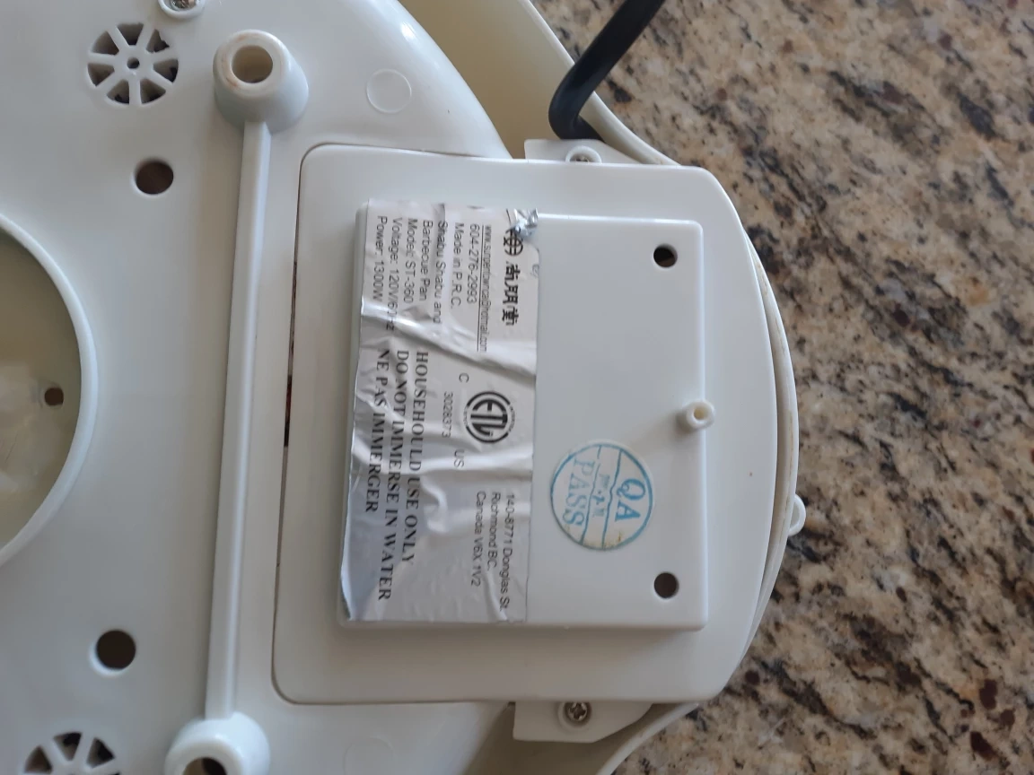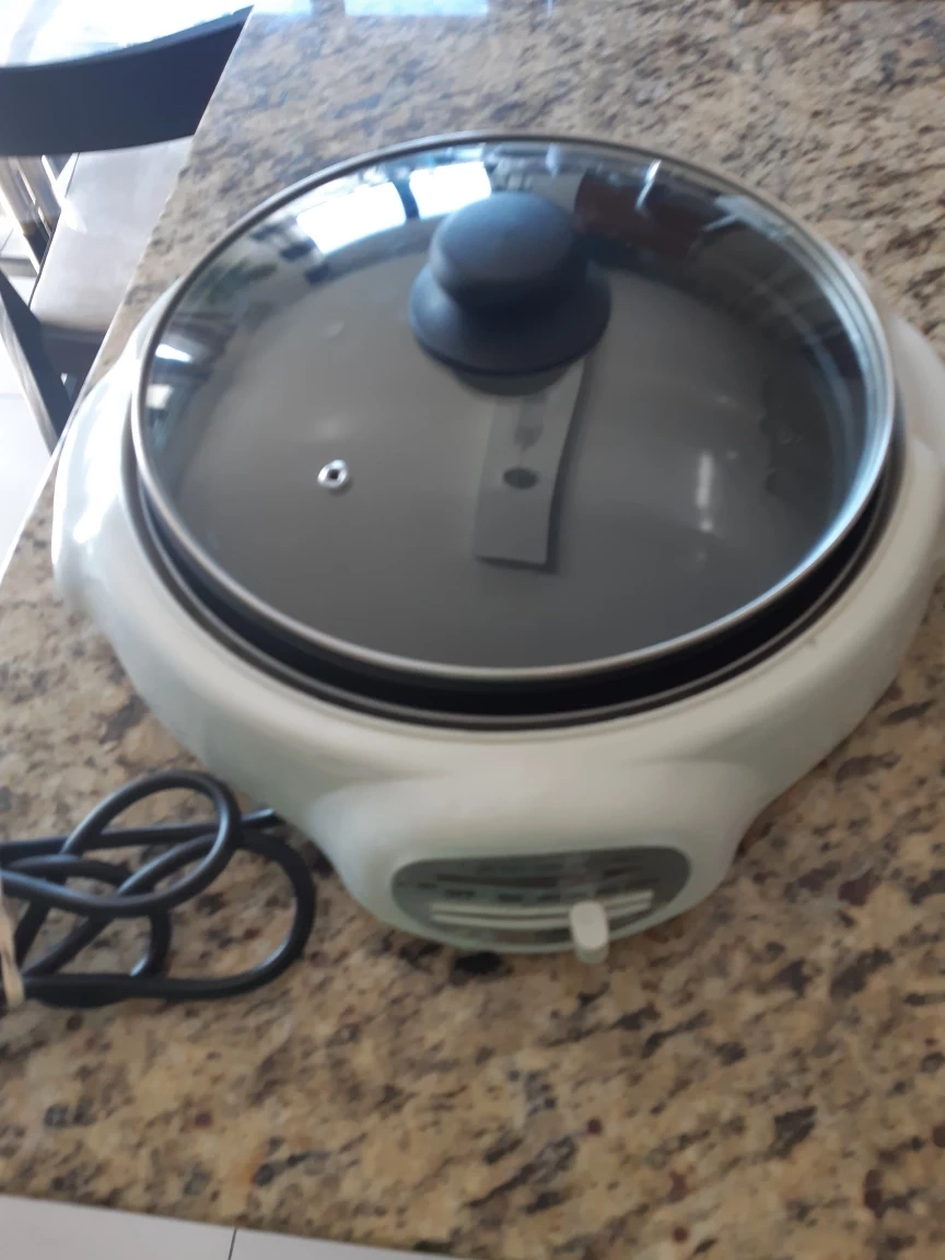 A small, round electric skillet with a glass lid and temperature control heat knob. Heat is from 160 degree C to 230 degree with OFF/ON, and has warming.. The skillet is white with a metal base and a black cord. It has a 1300 watt power output. The power cord is approximately 55 inch long. The skillet has a handle on either side. Model ST-360 Voltage 120V/60HZ