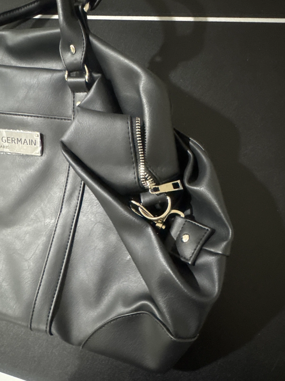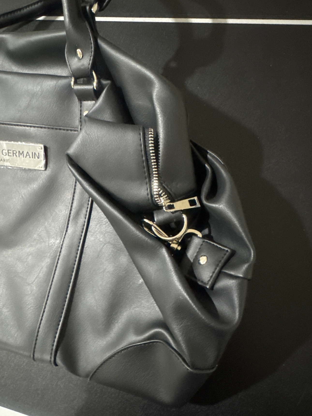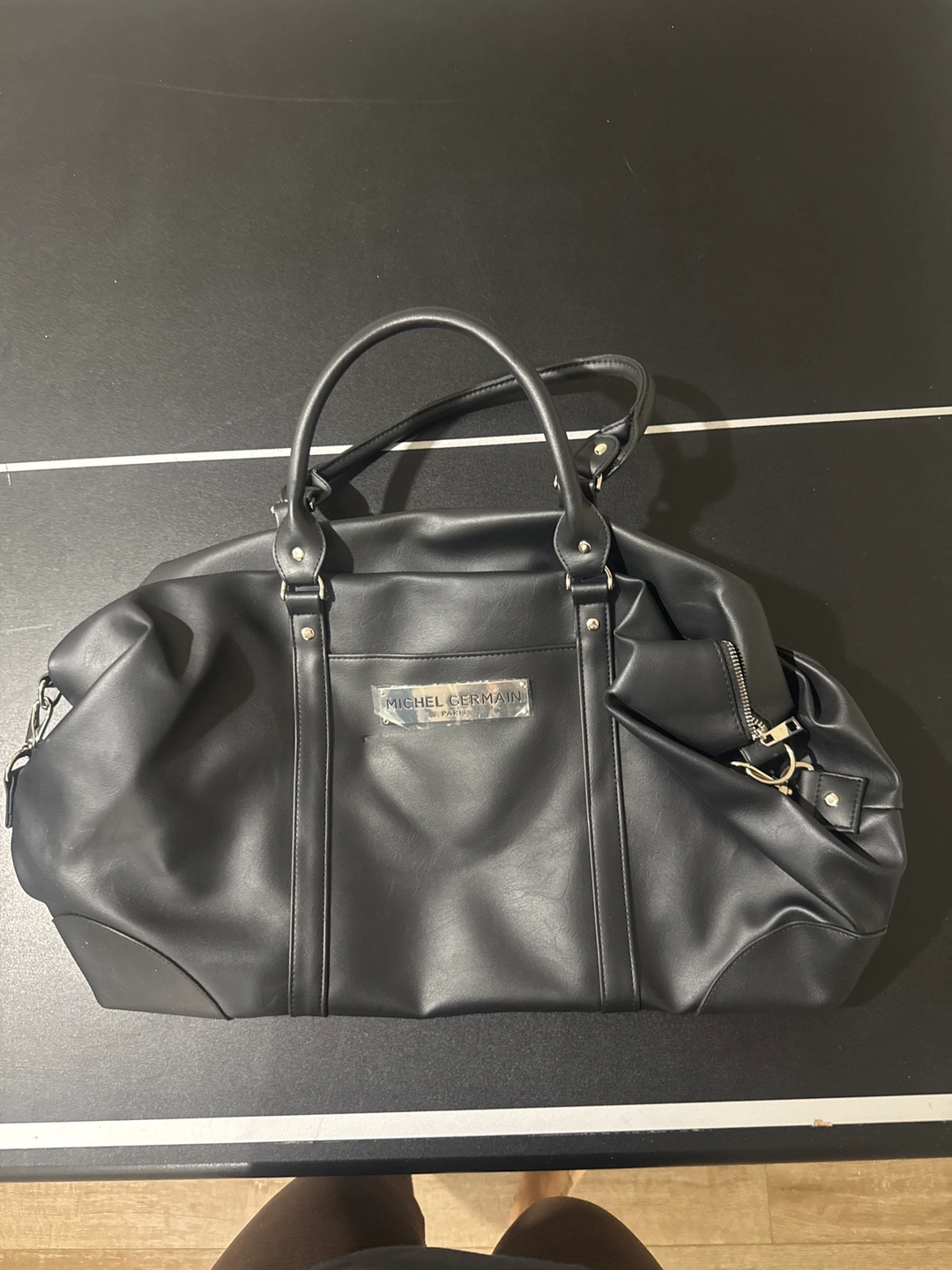 Black weekender bag with a silver metal nameplate. The bag has a zipper closure and two top handles. There is a small zippered pocket on the side of the bag.