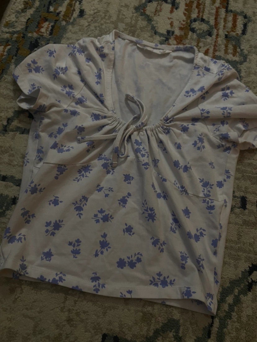 Cute top. Short cropped length. Short sleeve top. The strings middle are adjustable ! Size XS. Does stretch well. Been worn a few times and has been washed. Clean. Great condition. Smoke Free & Pet Free Household. Pick Up Only, No Delivery. Cash Only. Only reach out if interested in purchasing the item. Do not waste my time.