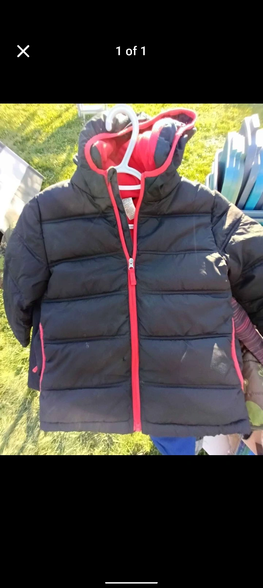 Nice black winter coat with cherry red trim. Cute with red hat and mitts.