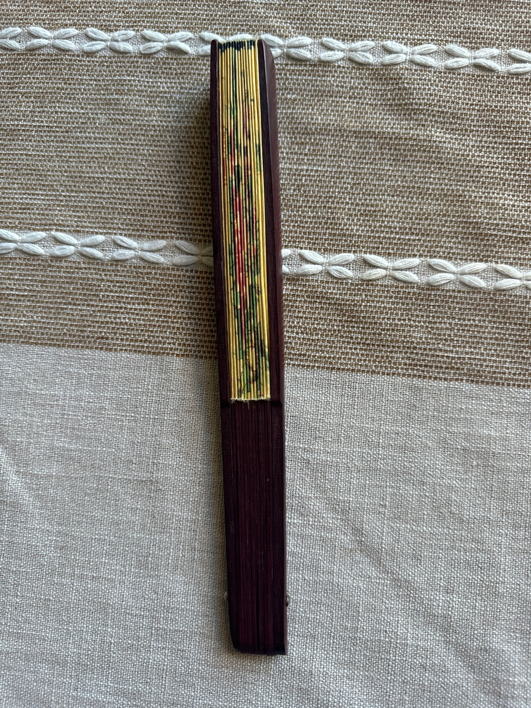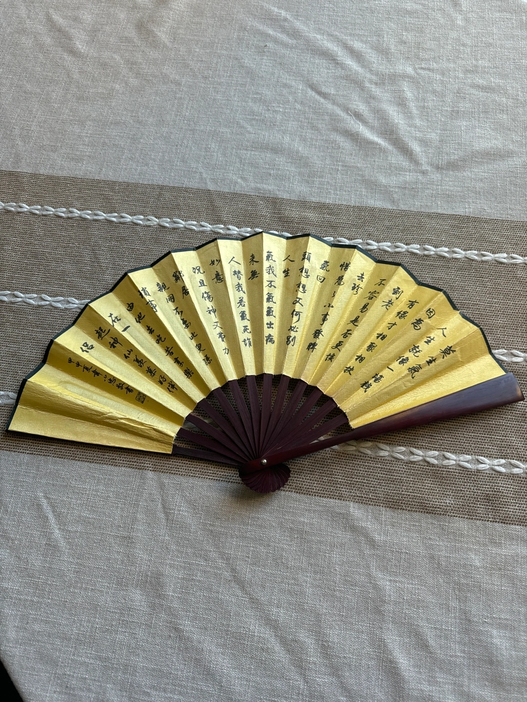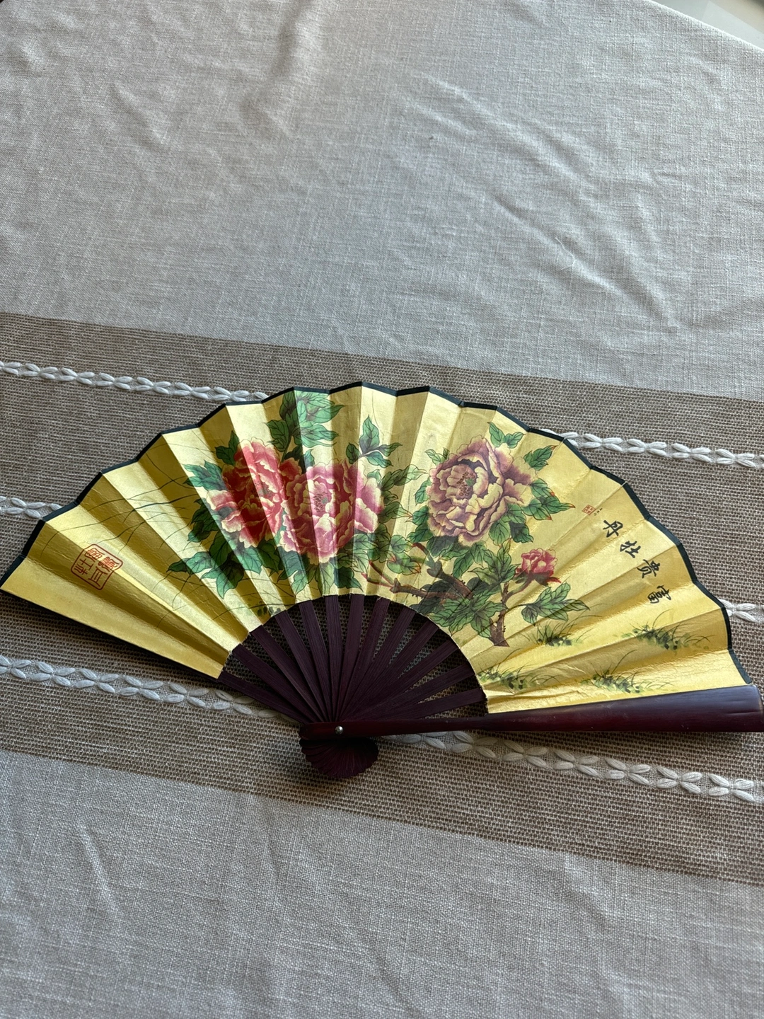 This is a beautiful folding hand fan with a gold and pink floral design. It has a wooden handle.