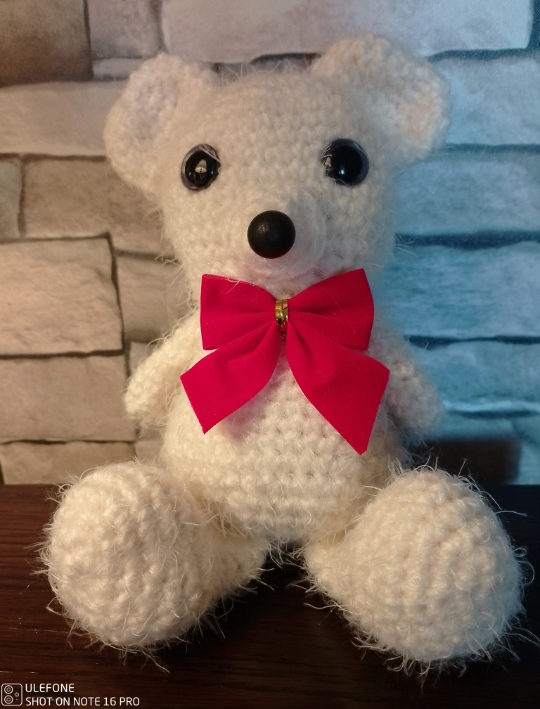 This is a crocheted teddy bear with black eyes and a red bow. It has a furry texture and is approximately 10 inches tall.