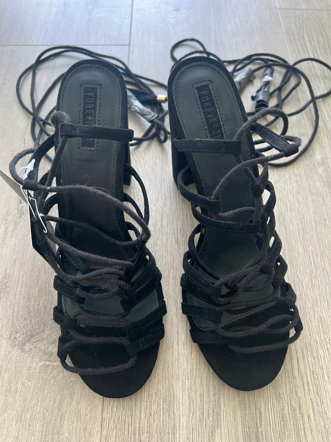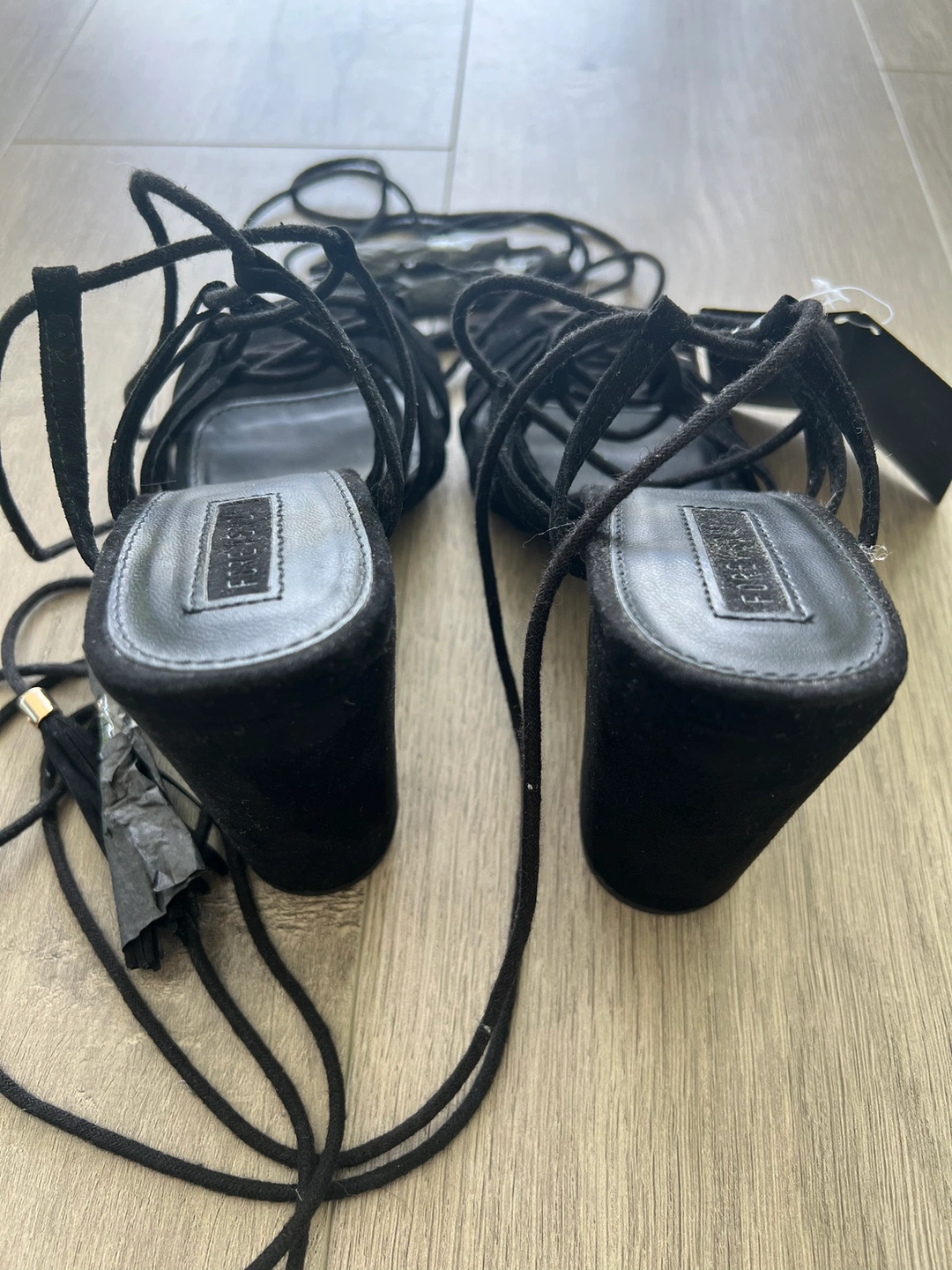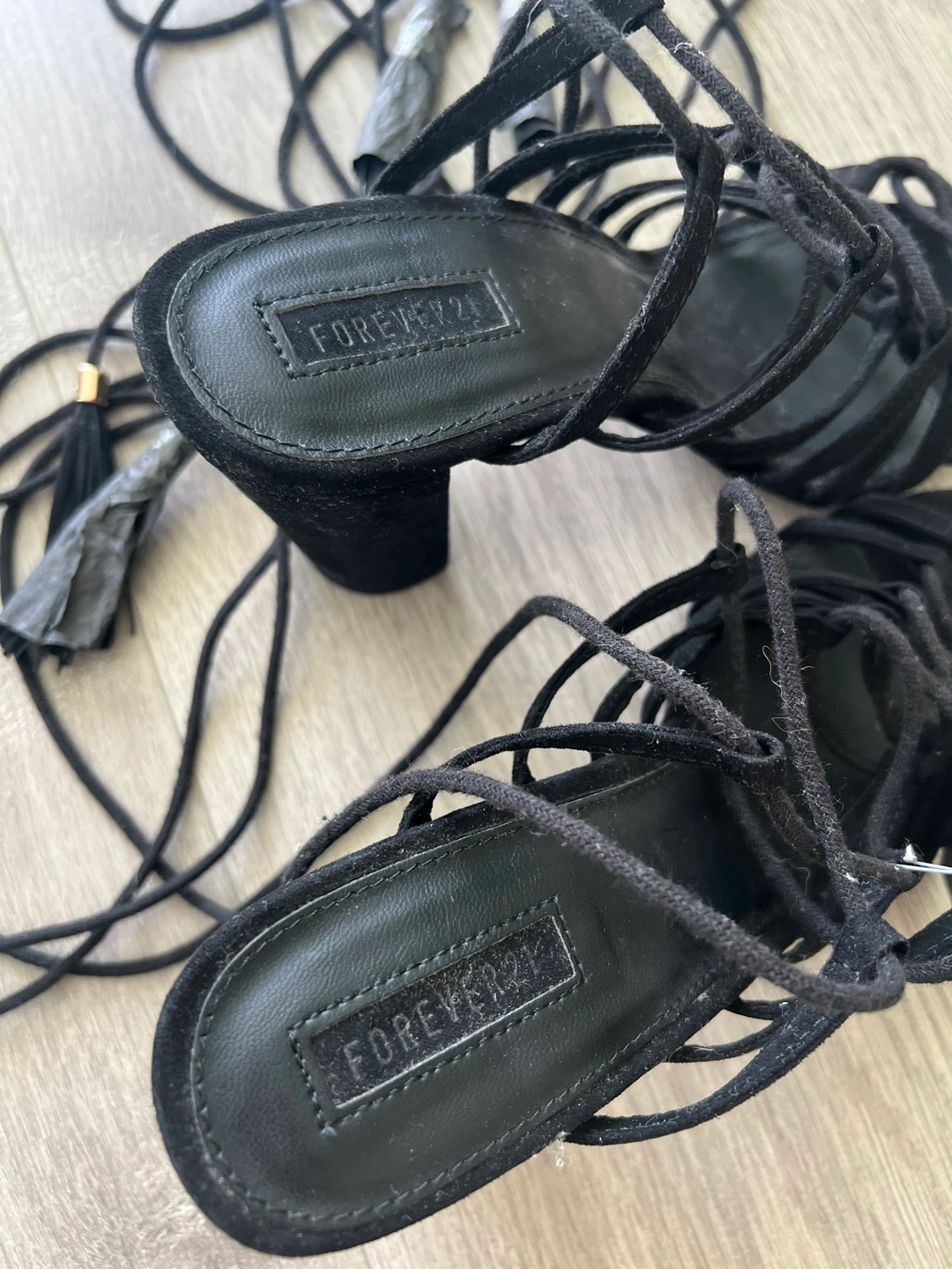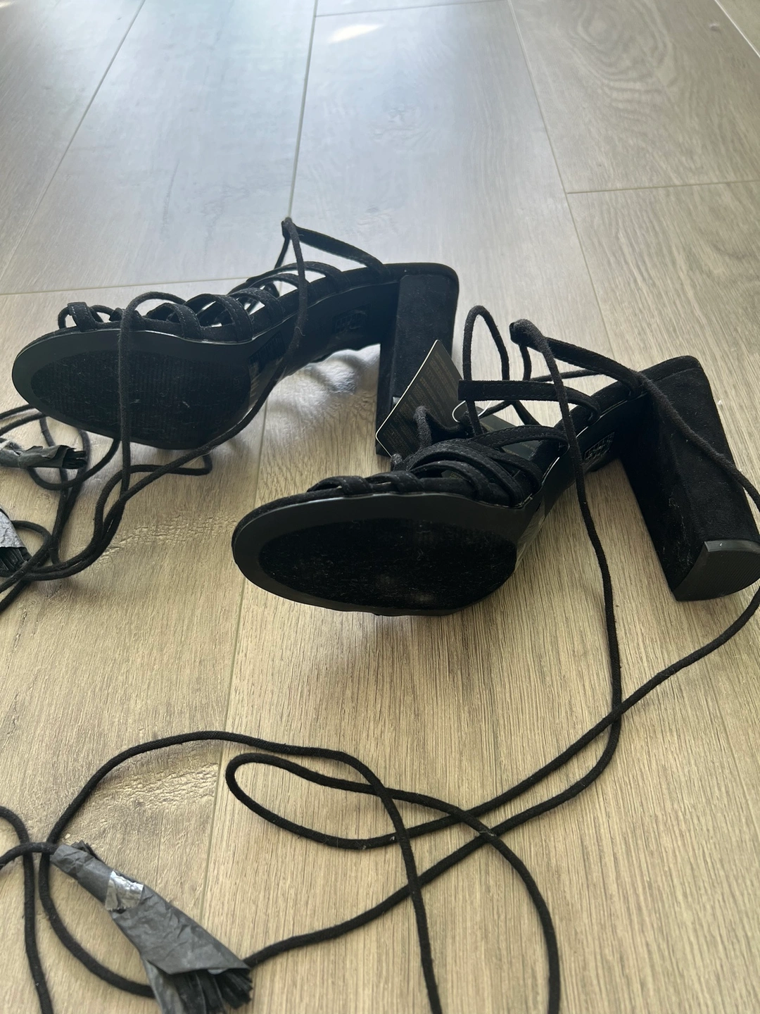 Black lace up heeled sandals with a chunky heel, black : golden tassel detail. Size 8.