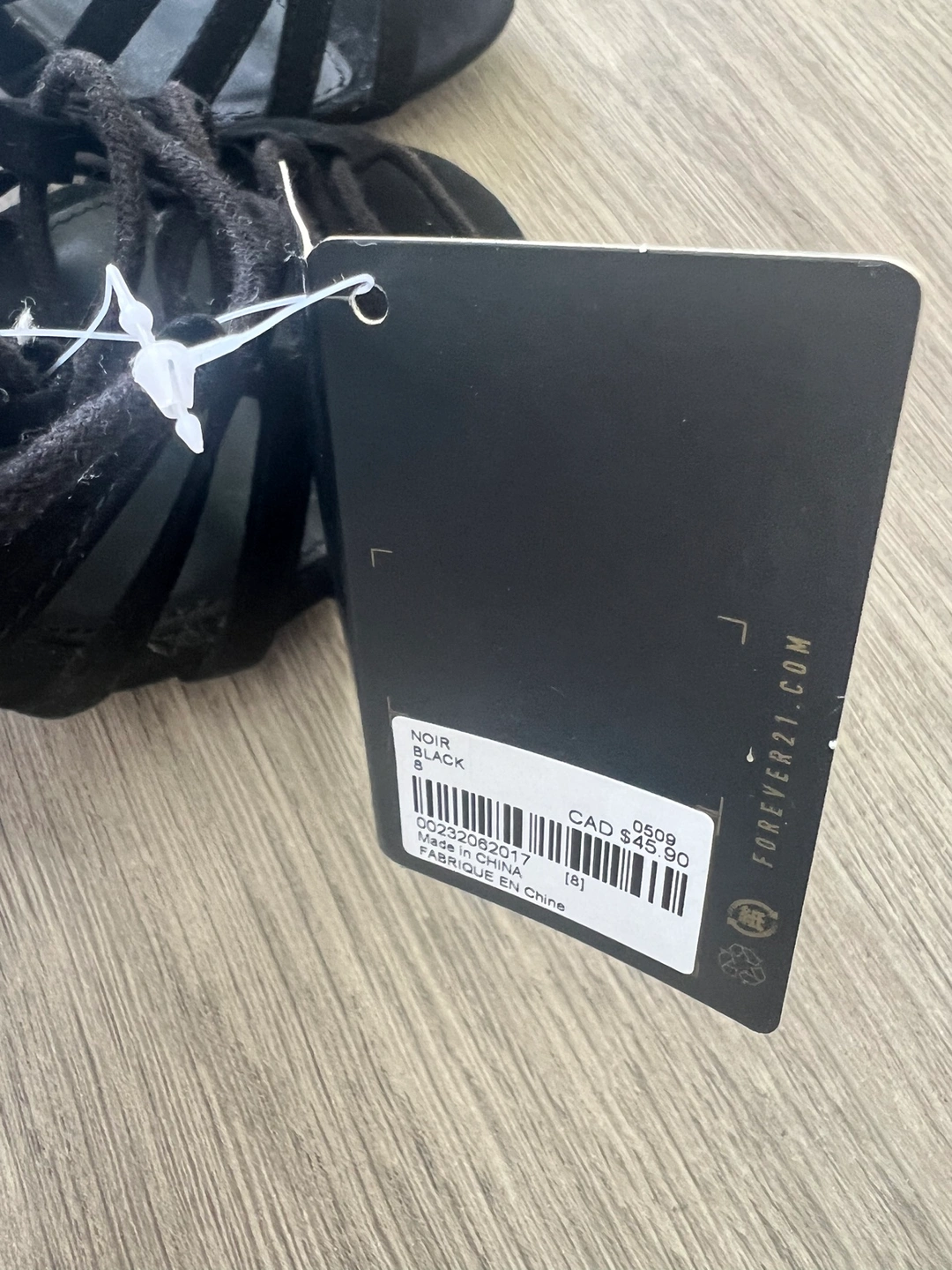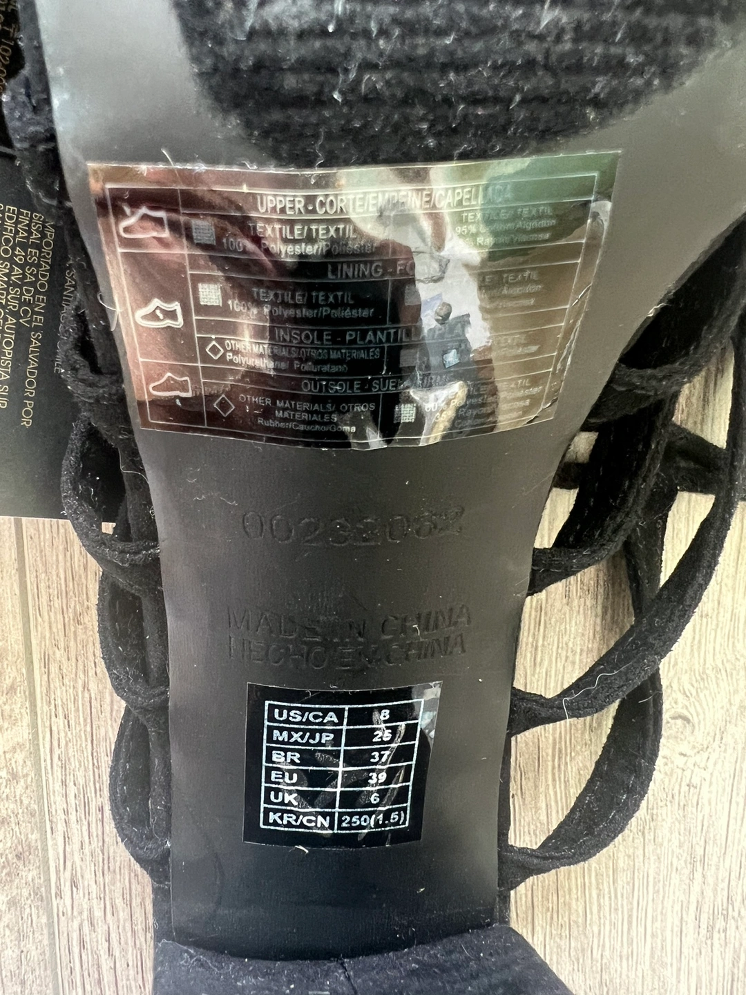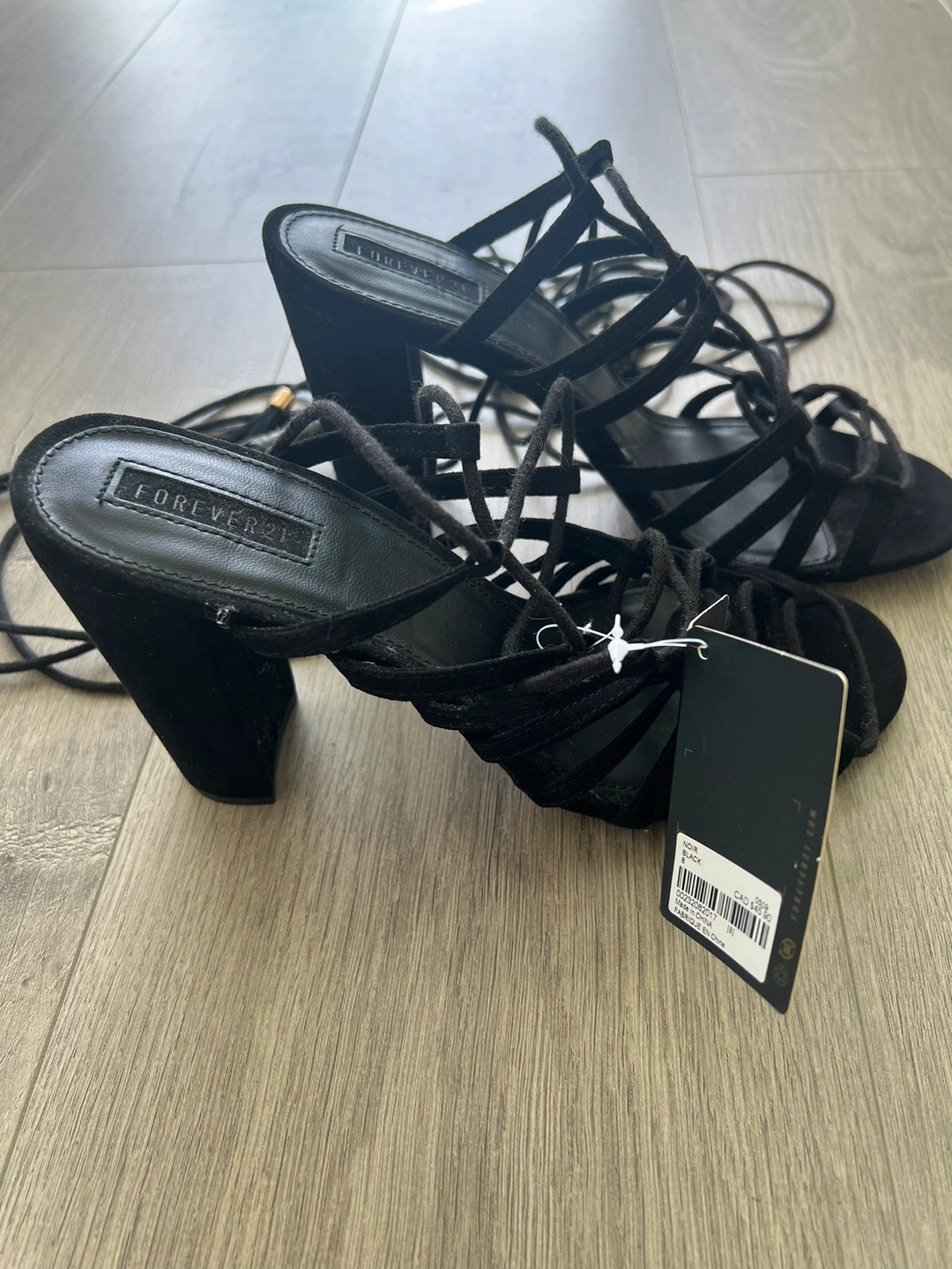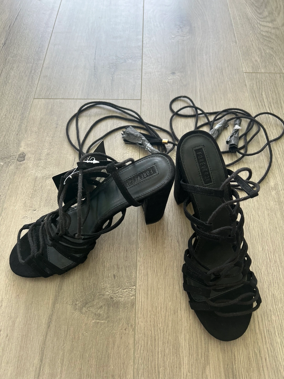 Black lace up heeled sandals with a chunky heel, black : golden tassel detail. Size 8.