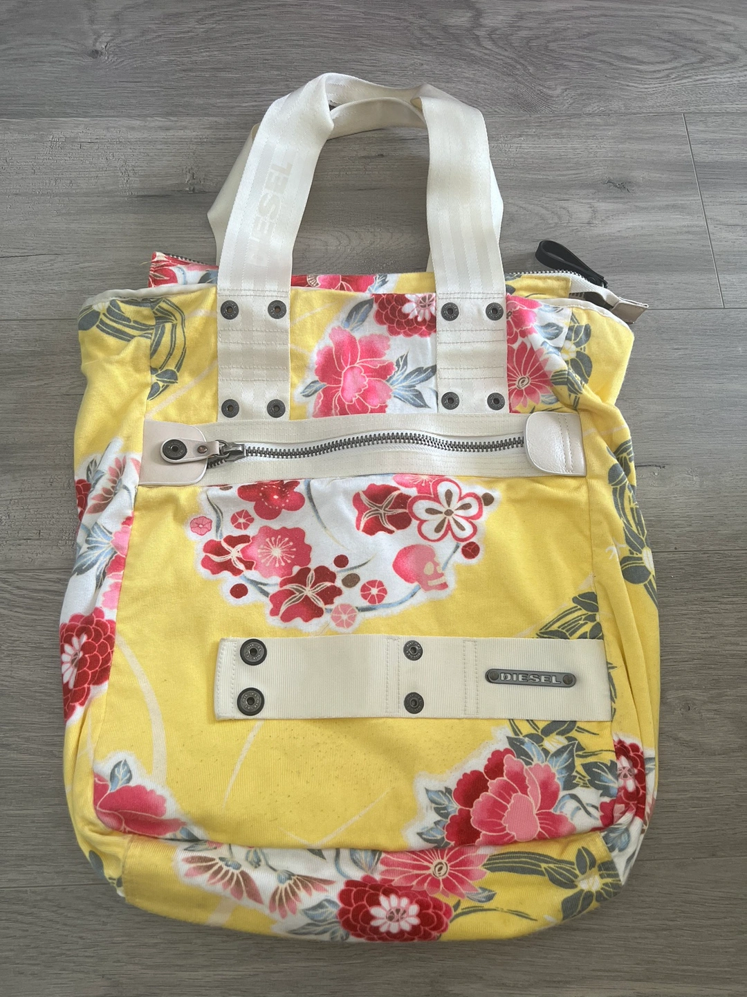 Large, yellow tote bag with a floral pattern. The bag has two handles and a zipper closure. The bag also has a front pocket.