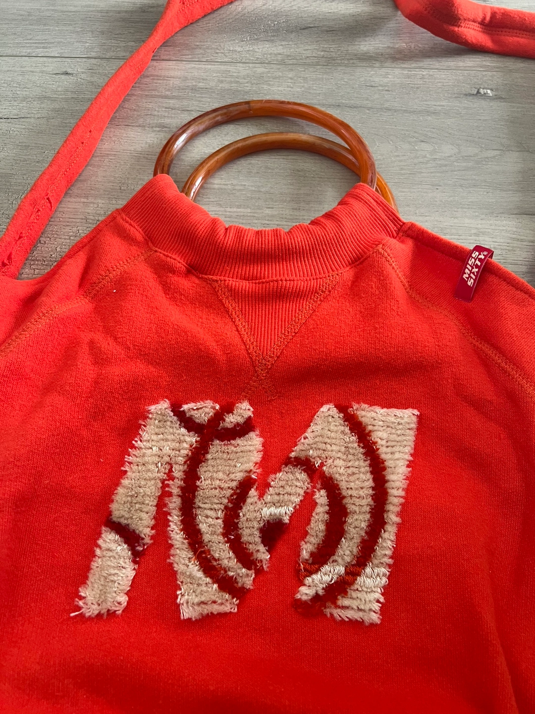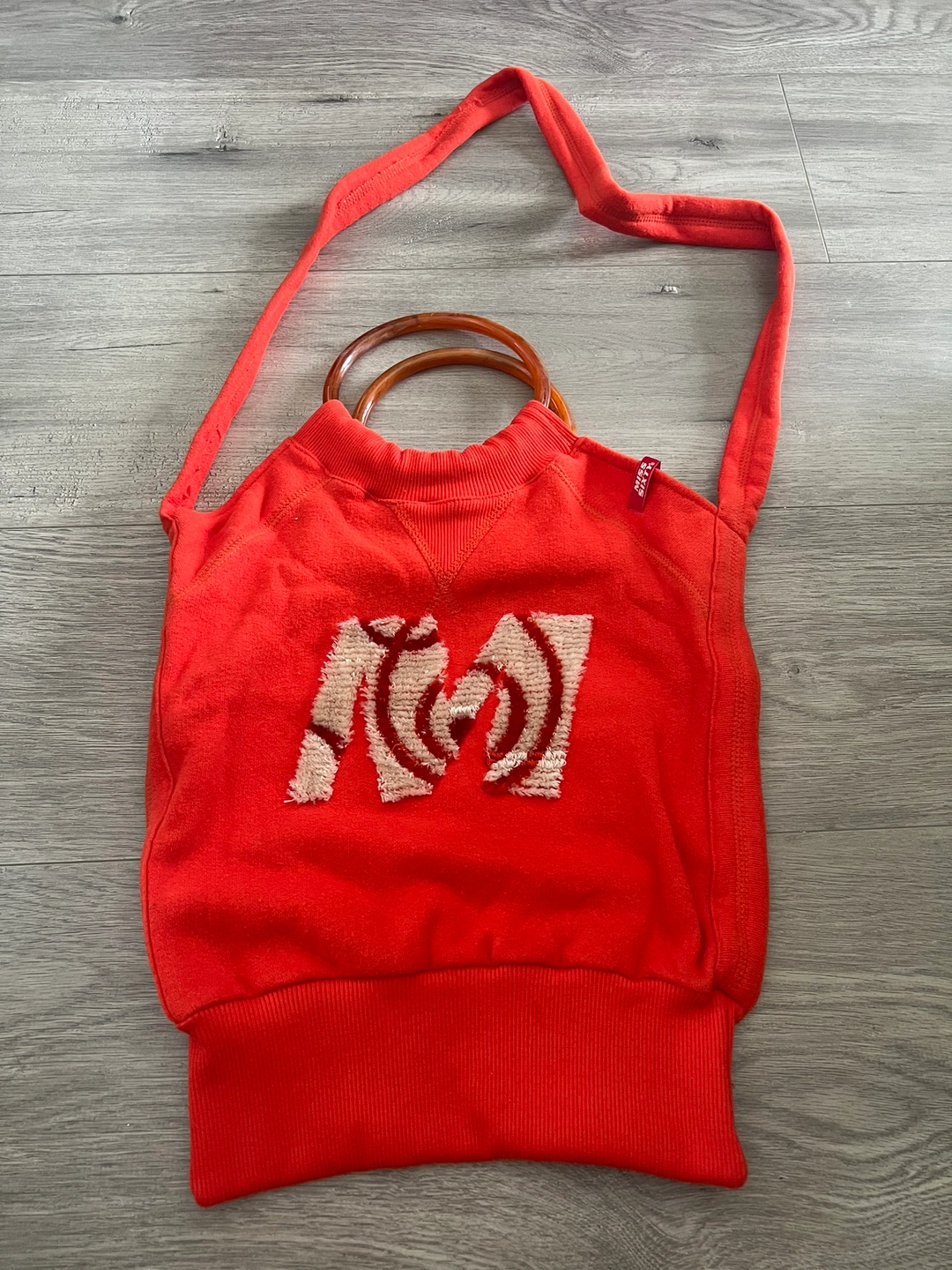 Red cotton sweater handbag / shoulder bag with a large M design on the front and two brown wooden handles.