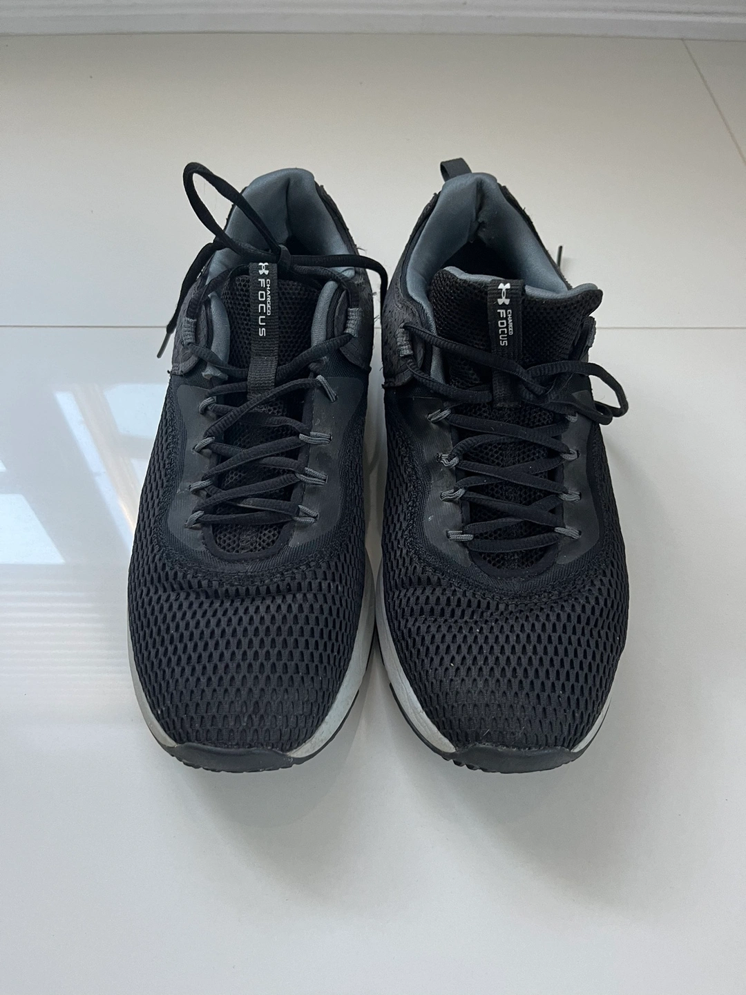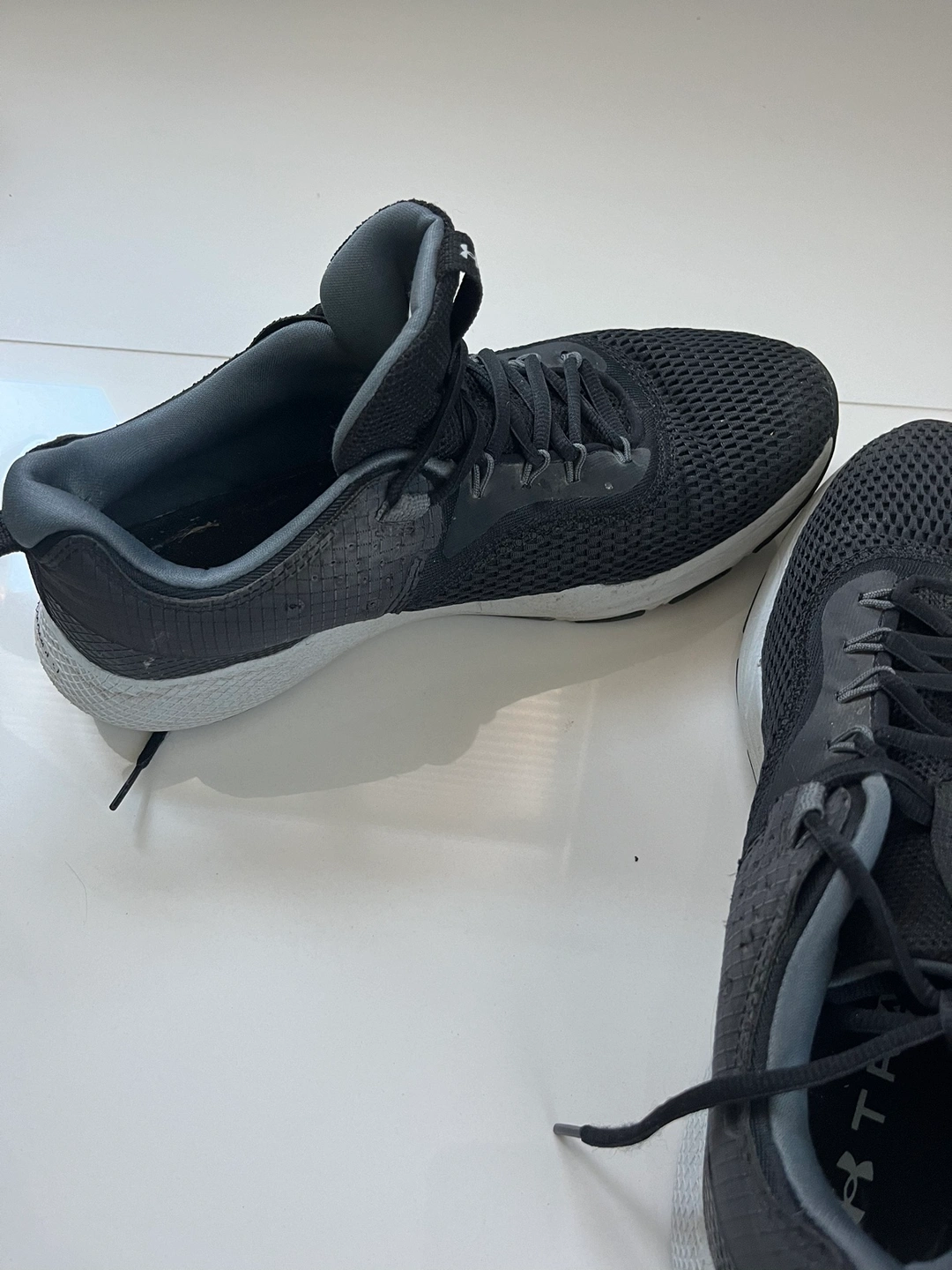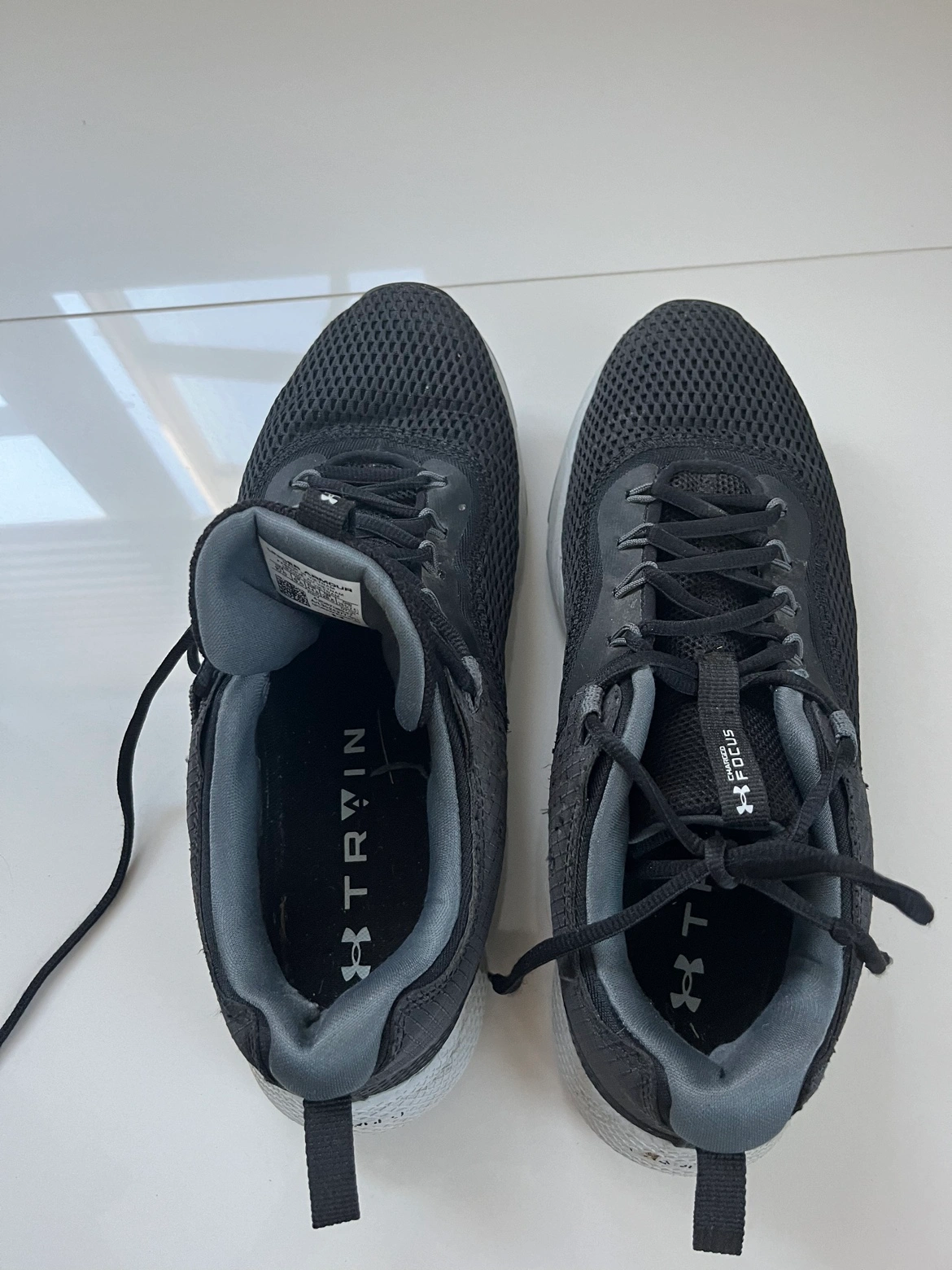 Really good condition and comfy. Black with charcoal trim. No holes and no excessive wear on outside heels. Slight wear on inside of left shoe but not significant. Fit more like a 10. Pick up Tuesdays through Thursdays. Cash only please