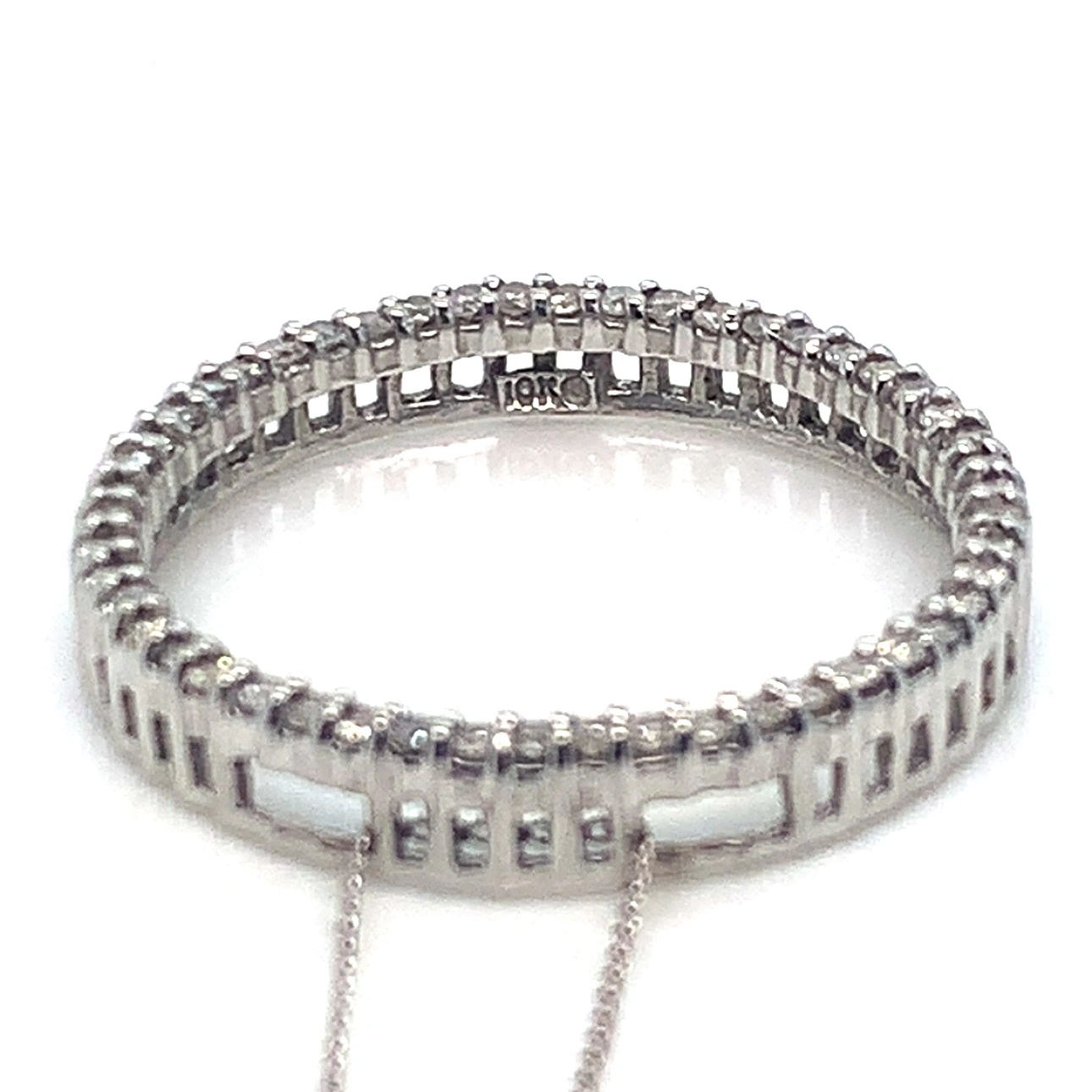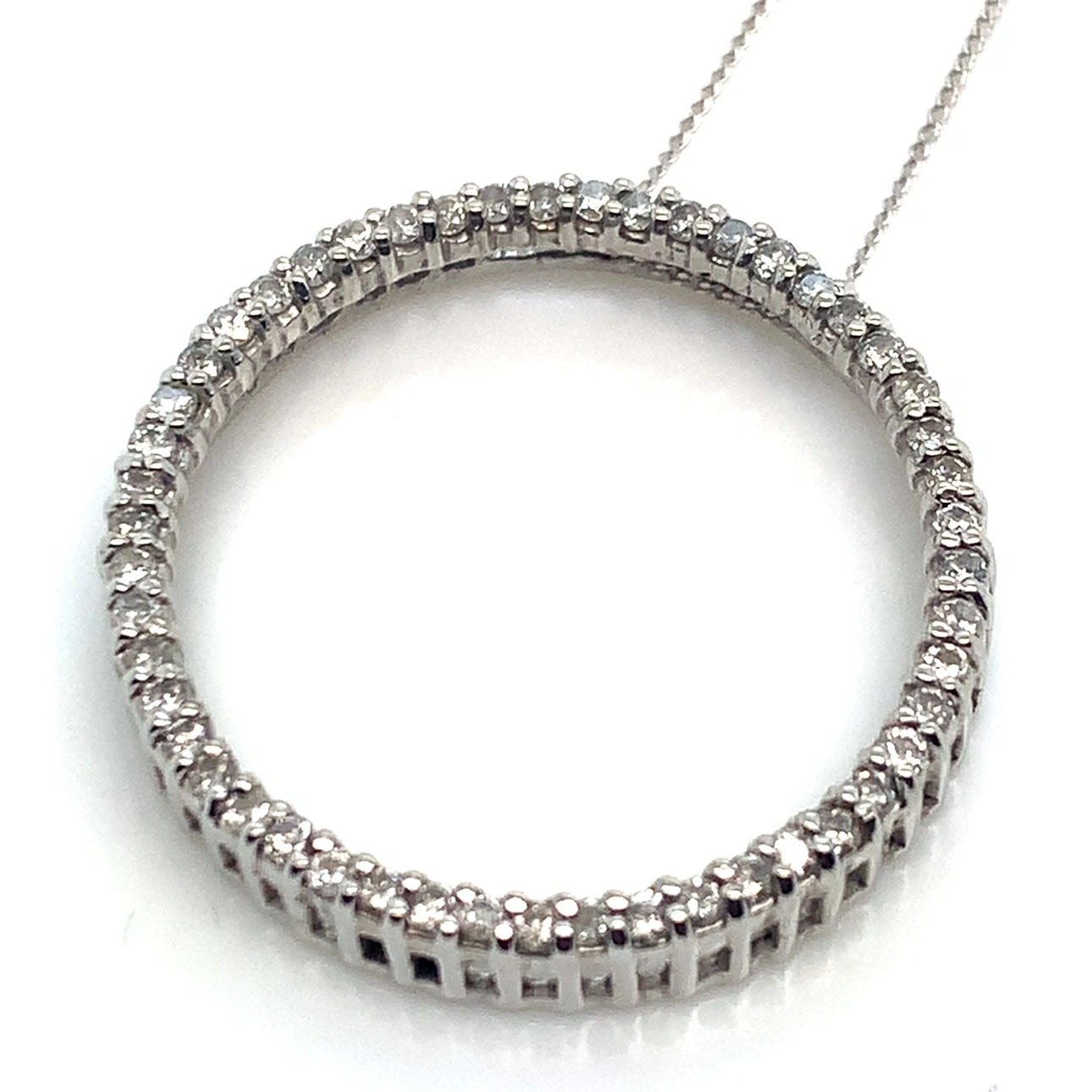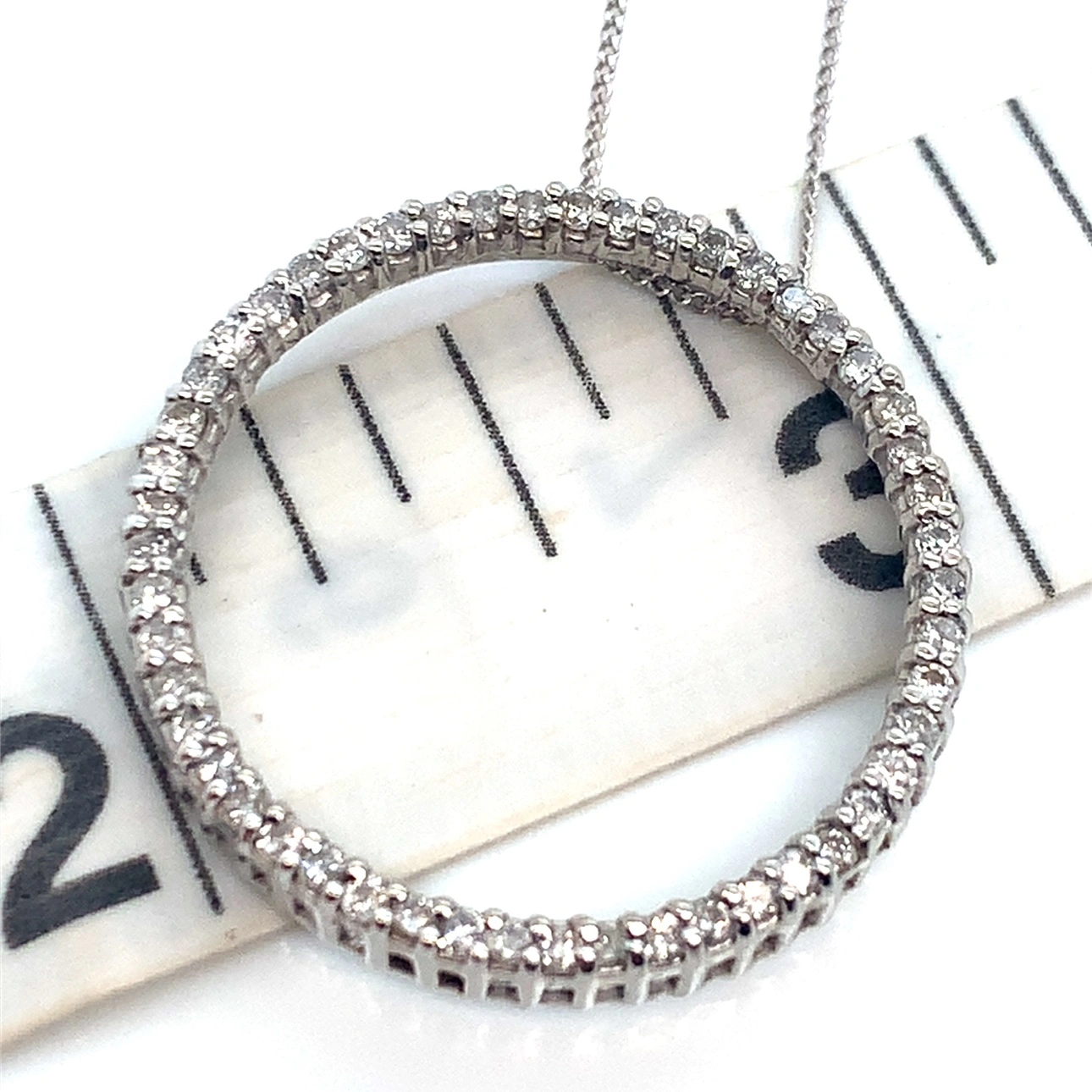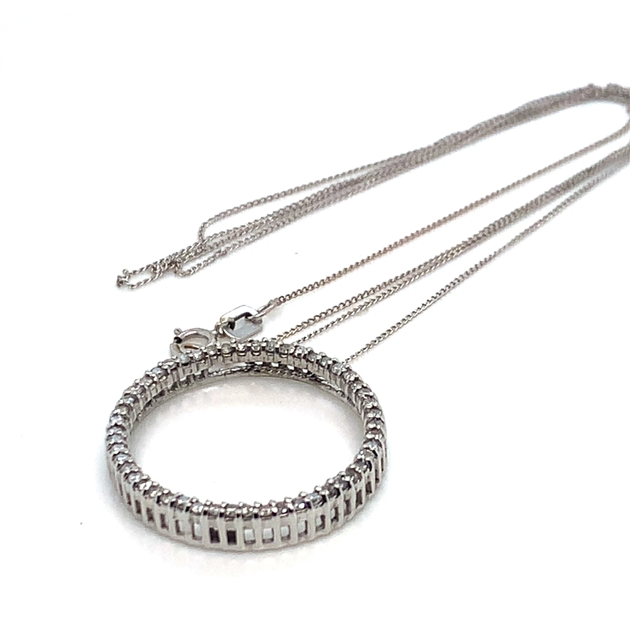 This is a beautiful 10K white gold diamond circle pendant necklace. It features a circle of small diamonds with a delicate chain. This is so comfy and my longest white gold necklace. This is the bottom necklace in the last photo.