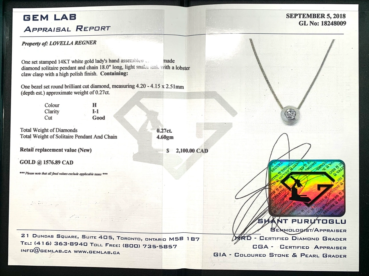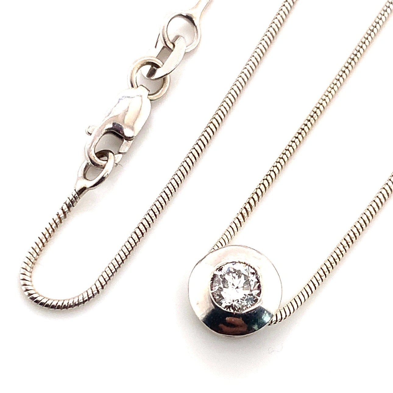 This is so beautiful in person. I paid $2100 plus tax for it. Item comes with GIA certificate. It is a snake chain with a round bezel set diamond pendant. The necklace is 18 inches long. Selling half of what I’ve paid for, hence price is firm.