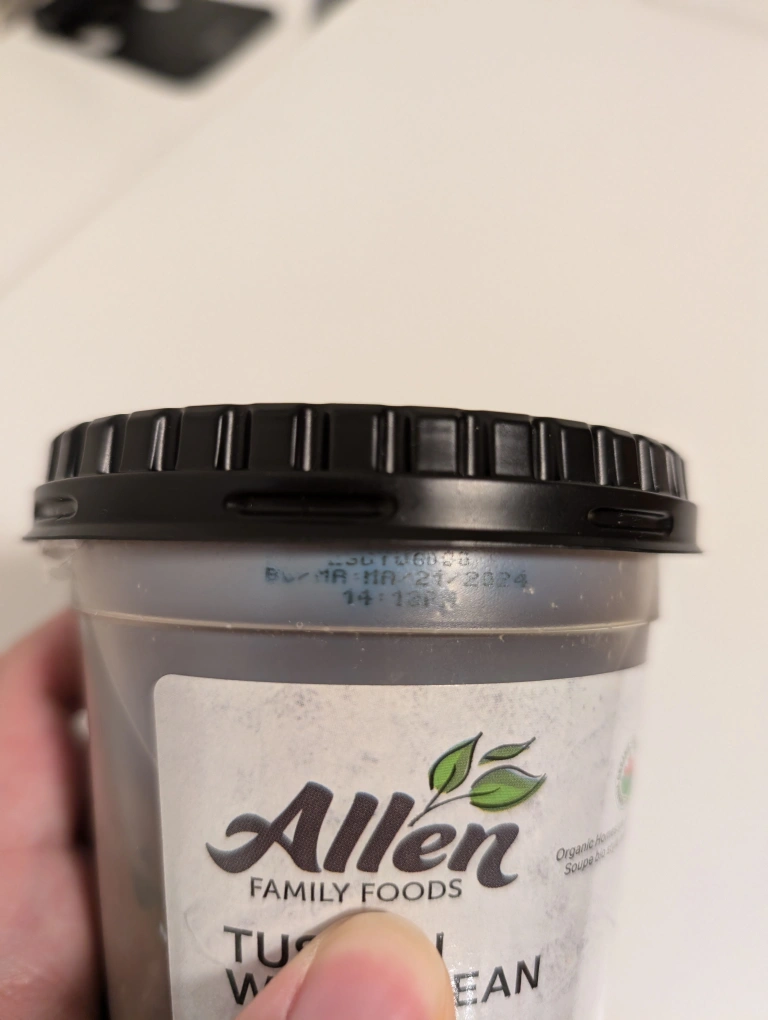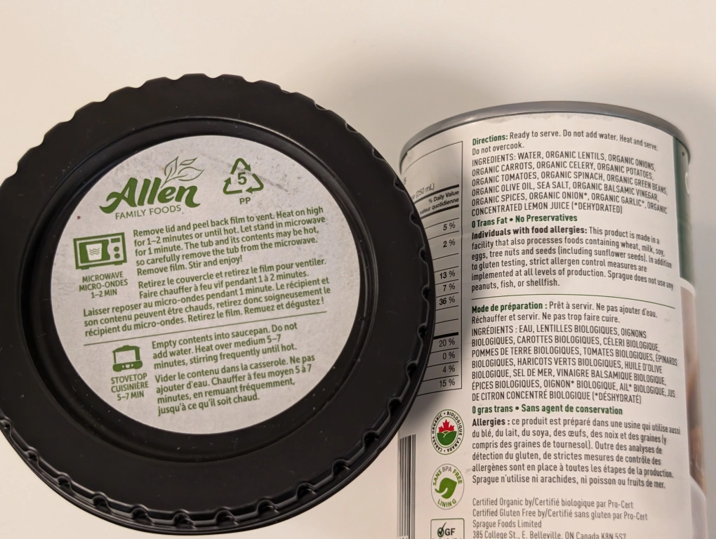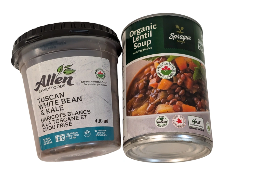 A 400 ml can of Allen Family Foods Tuscan White Bean & Kale soup.