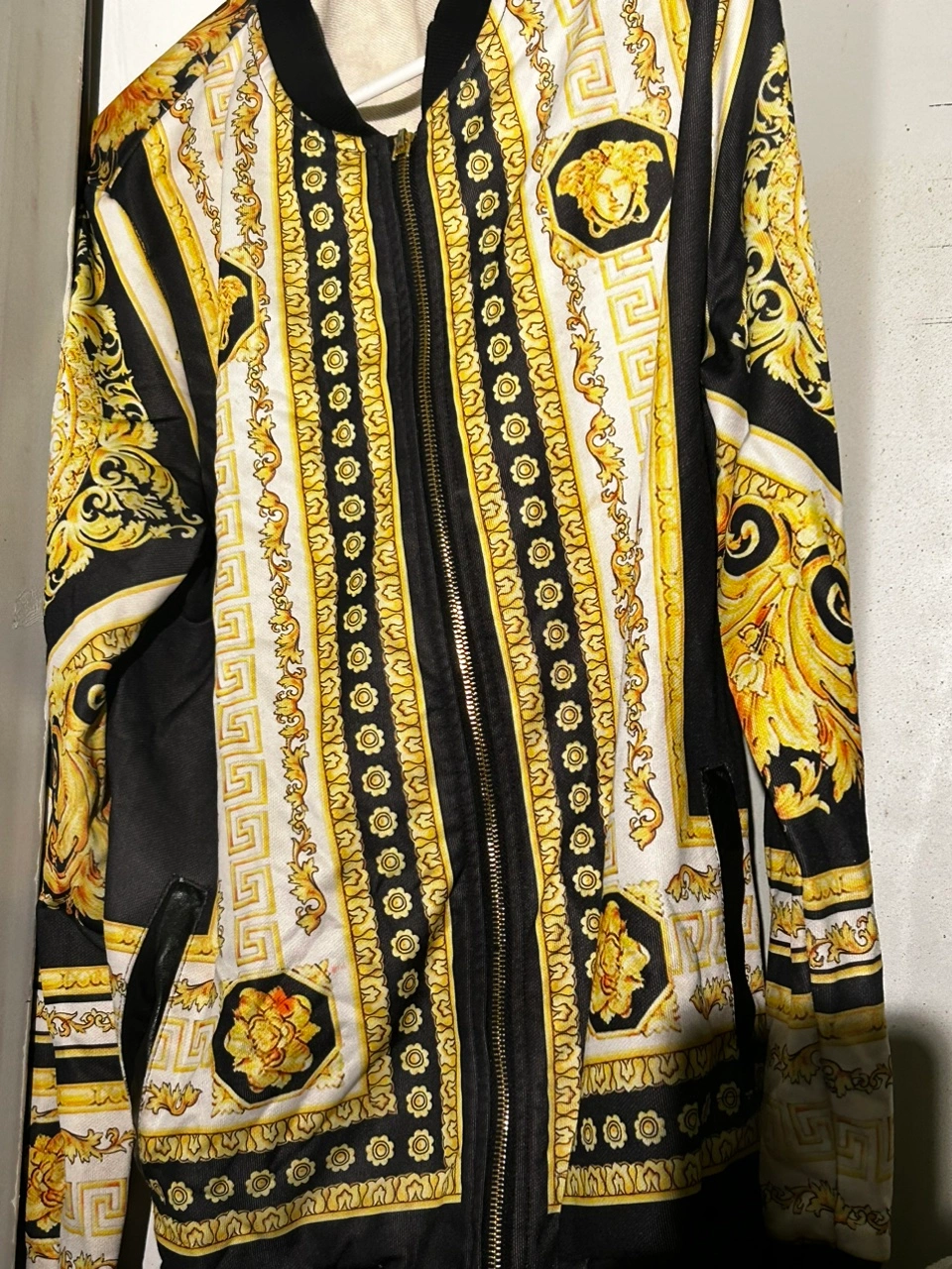 A black and gold bomber jacket with a zip up front. Versace jacket. XL small stain on the front of the jacket.