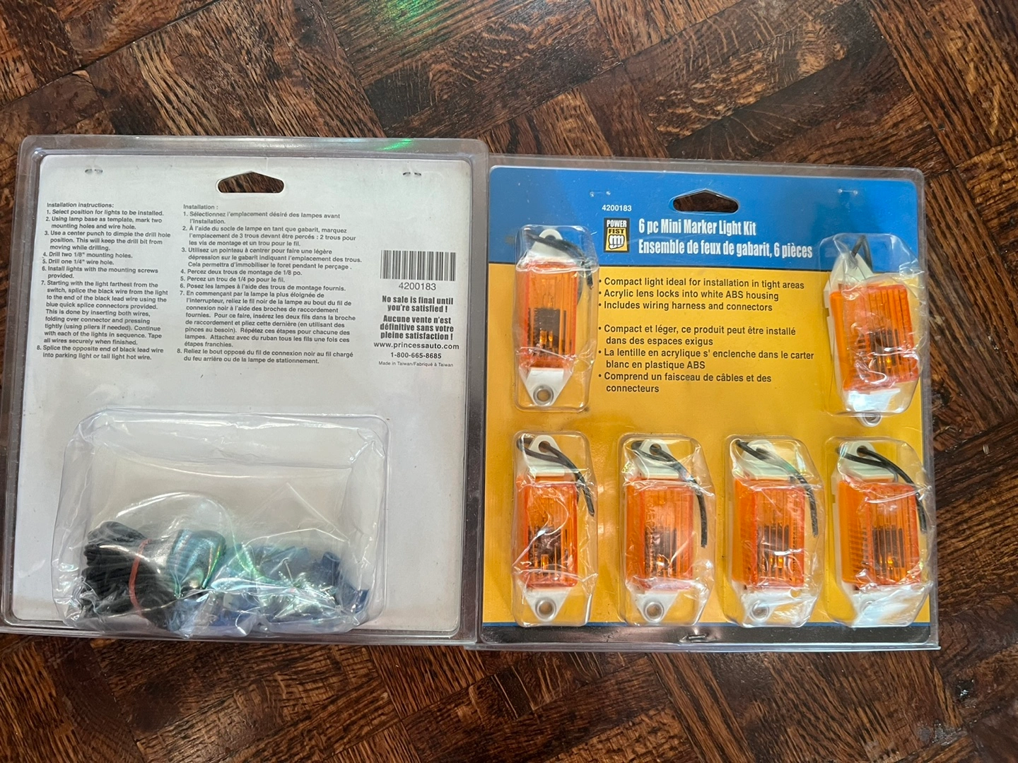 6 piece mini marker light kit with clear acrylic lens and white ABS housing. Includes wiring harness and connectors.