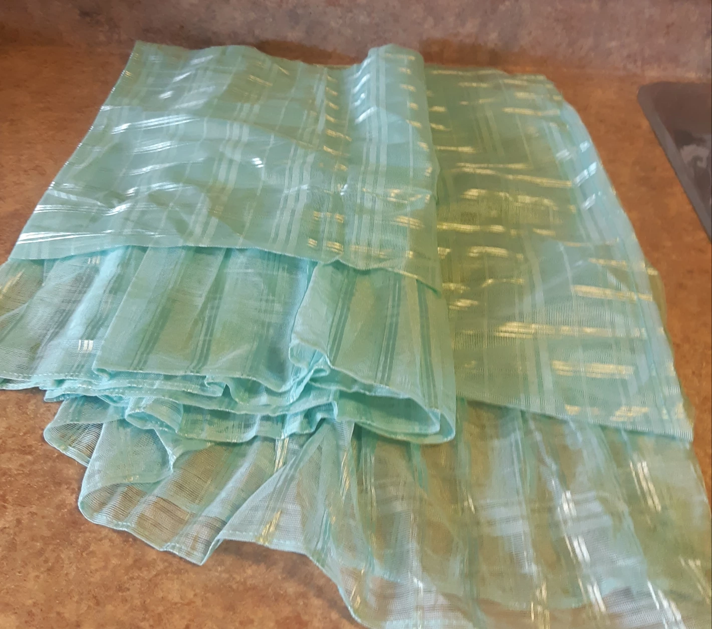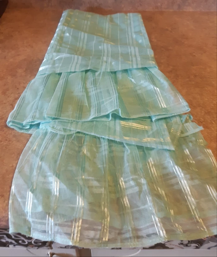 A teal sheer window valance only available for pickup with a plaid design and ruffles on the bottom.only available for pickup.