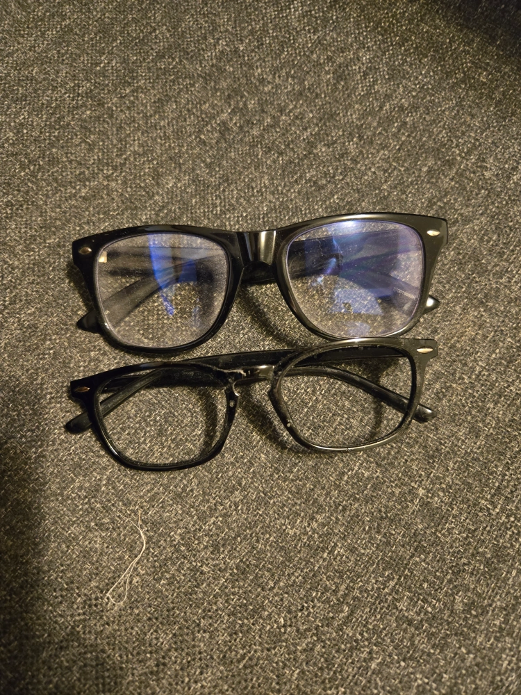 A pair of larger, square-framed eyeglasses and a pair of smaller, rectangular-framed eyeglasses, both black in colour. These were used as part of a Where's Waldo Halloween Costume. The smaller frame doesn't have any glass in it and the glass of the larger one is very very low prescription for reading