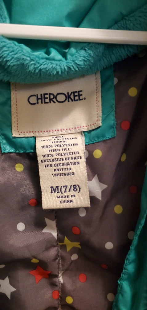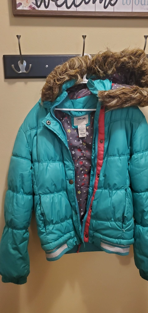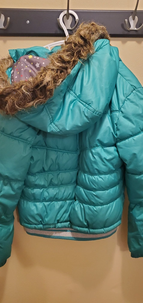 Teal puffer jacket with faux fur trim on the hood. Features a grey and white patterned interior lining. Size M(7/8). Made in China.