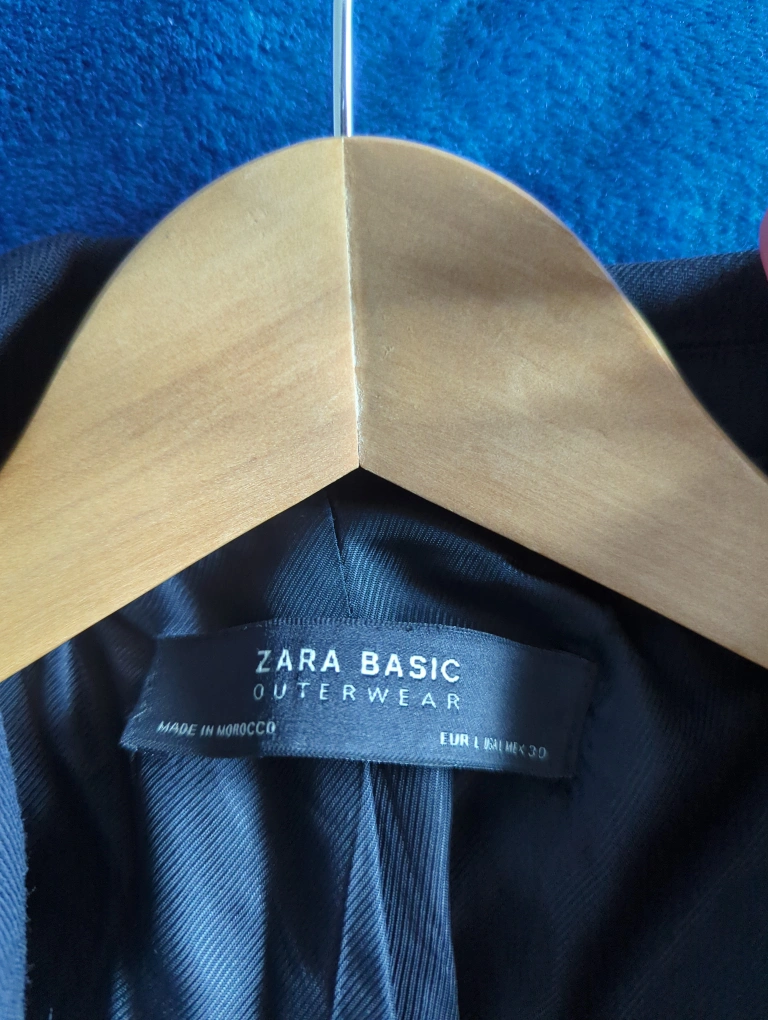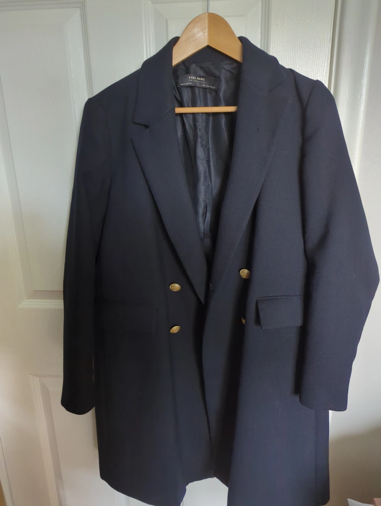 A stylish navy double-breasted peacoat featuring gold buttons and a classic silhouette. The coat has a relaxed fit and features pockets at the hips. cash only