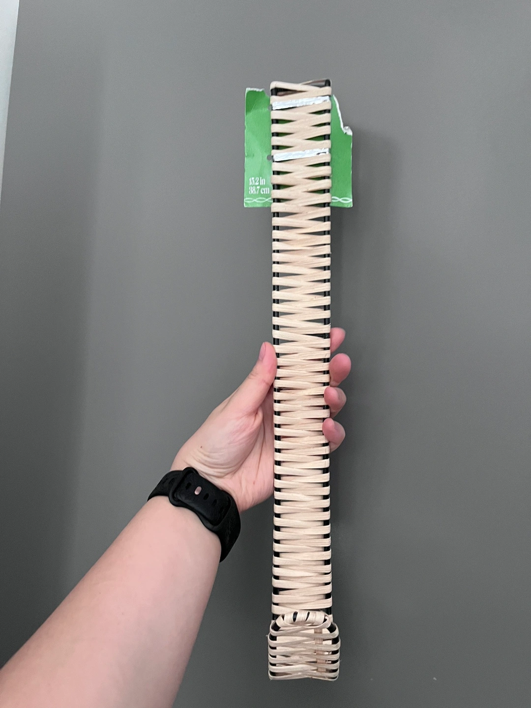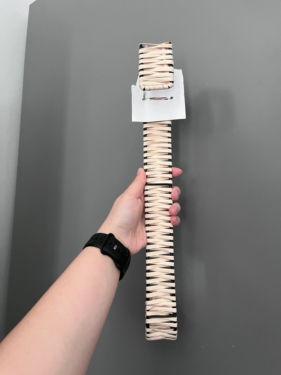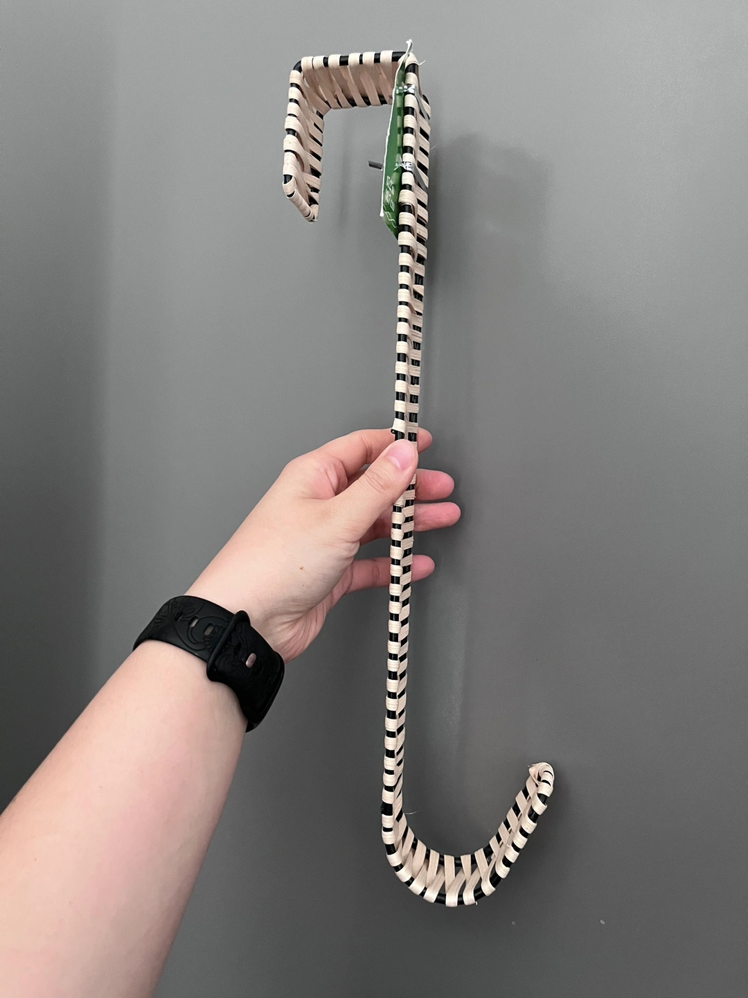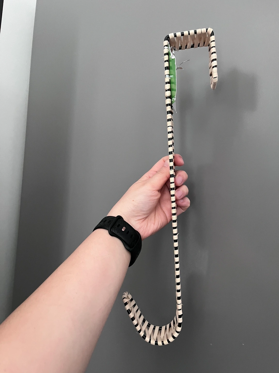 A cream and black woven over-the-door hook, 15.2 inches (38.7 cm) in length as per tag. Perfect for hanging items on the back of a door or maybe a wreath! Tag damaged but still on. New. Never got a chance to use it and don’t plan on it. Porch pick up in Markham.