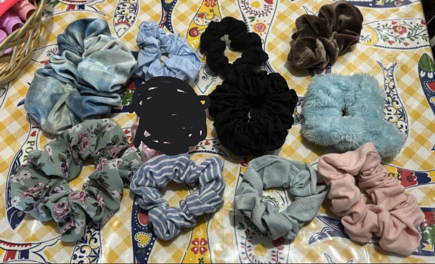 10 scrunchies in various colours, patterns, and textures. Includes velvet,cotton, and fuzzy scrunchies. We can make an arrangement if you are looking to buy some individually.