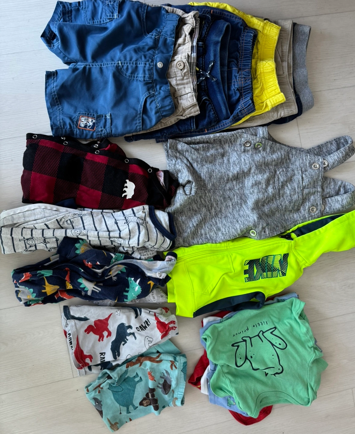 Sizing from 18-24 months Includes 1 pj pant, 1pj shorts, 4 short sleeve onesies, 3 sleepers(two are zipper one is buttons), 1 Nike hooded zip up sweater, 1 pair of overall shorts, 7 pairs of shorts Total pieces is 18