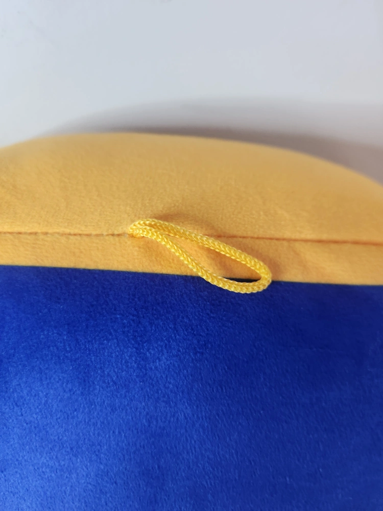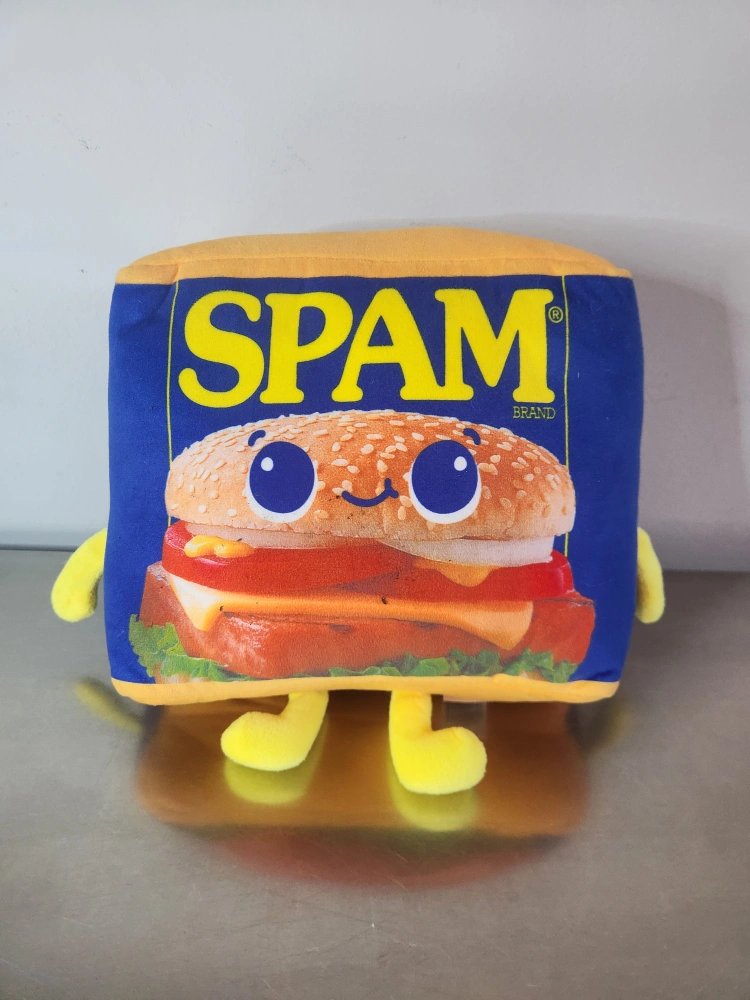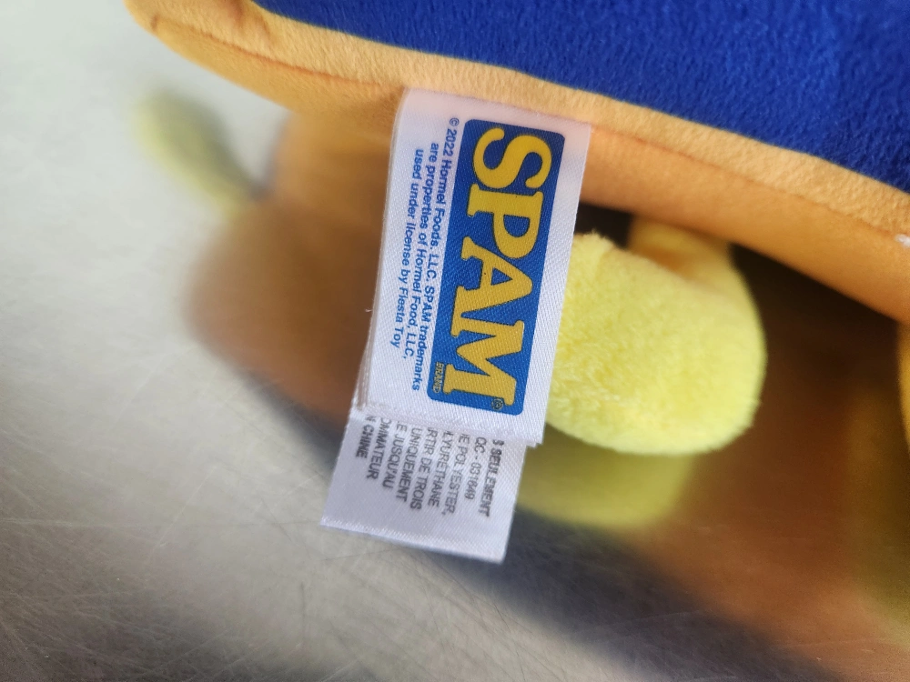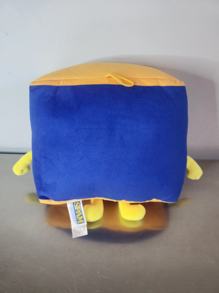 Plush toy shaped like a can of Spam. The toy has a smiling face and yellow arms and legs. The back of the toy is blue and yellow. It has a yellow loop to hang it.