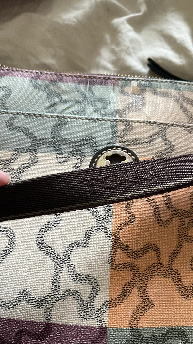 This is a colourful crossbody bag. It is made from a patterned canvas material. It has a long adjustable strap and a top zip closure. The bag features a small bear logo on the front.