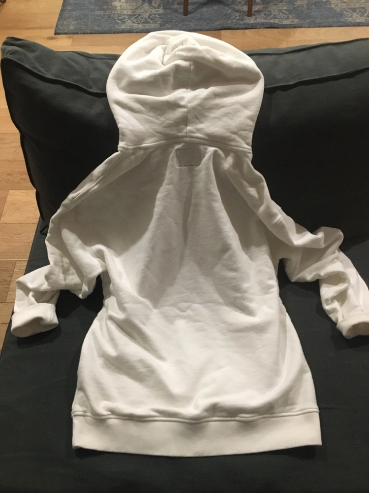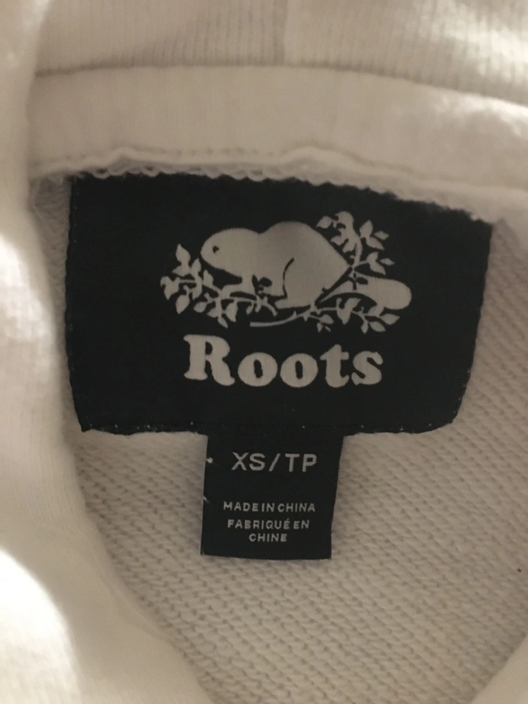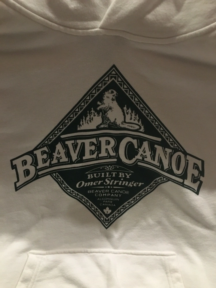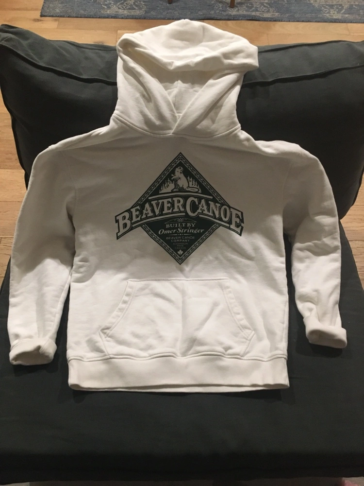 White Roots Beaver Canoe hoodie. The hoodie has a beaver logo on the front with the words "Beaver Canoe" and "Built by Omer Stringer". It is size XS Men’s / M Women’s. Paid $128 + tax and only worn and washed a half-dozen times.