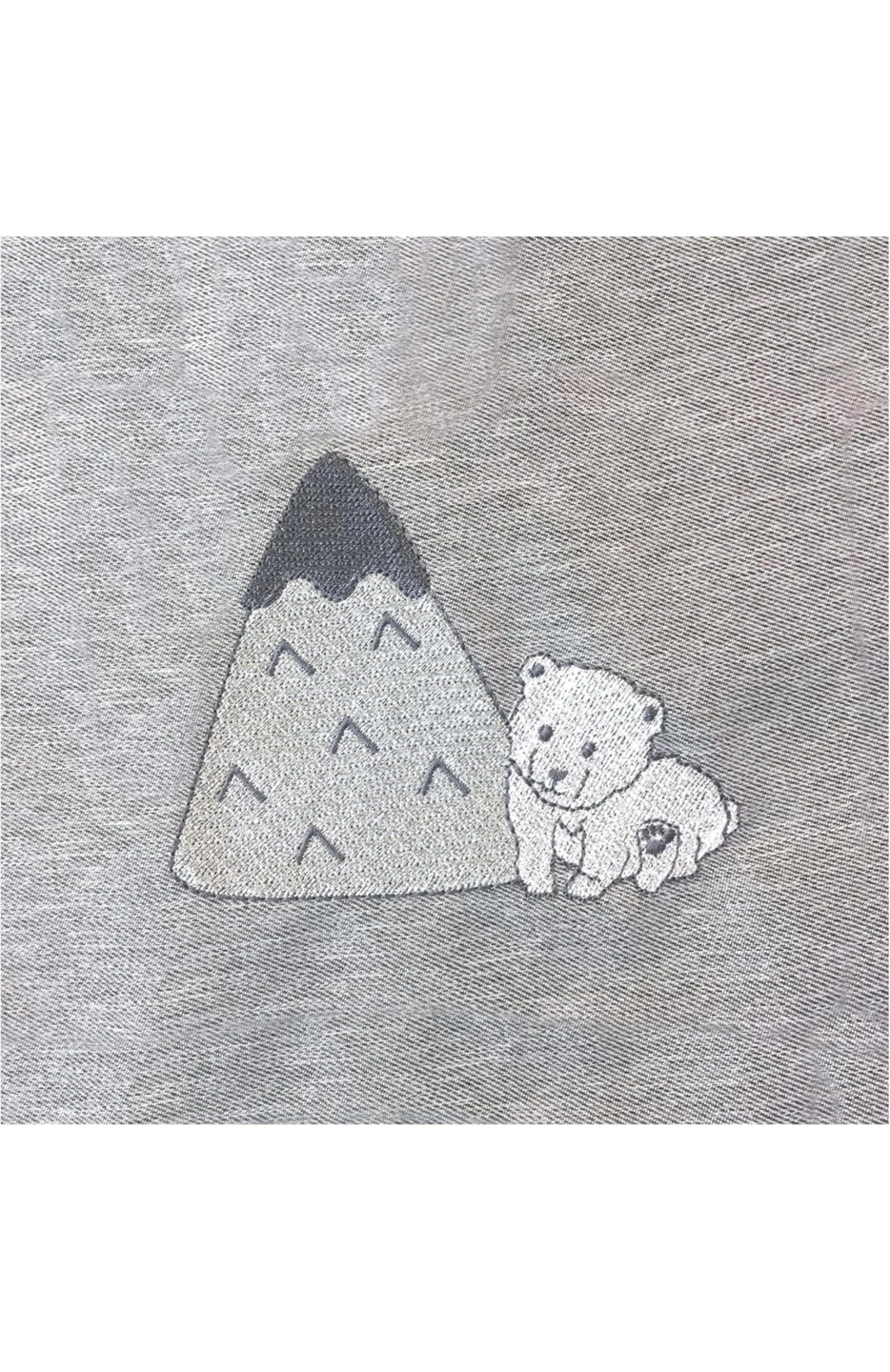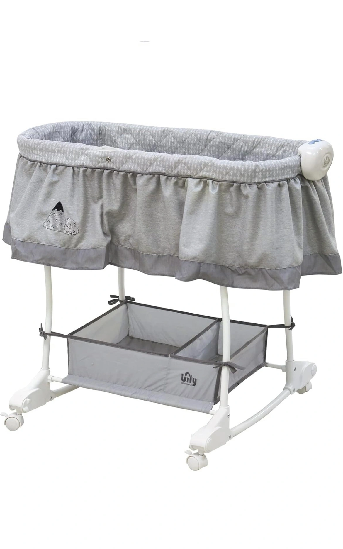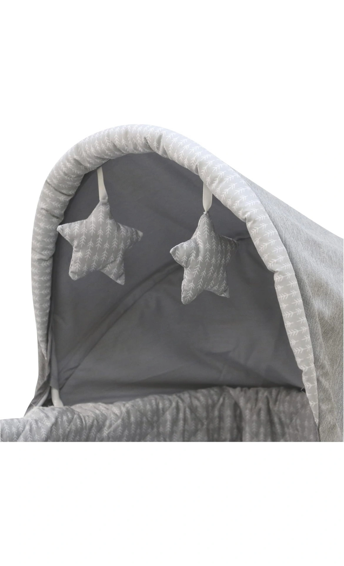 A grey cradle with a canopy. Features a small basket below the sleeping area.