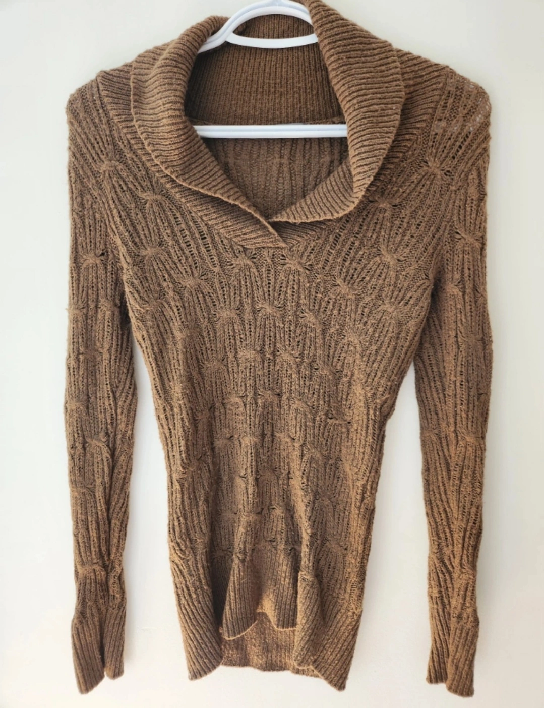 This is a brown knit sweater from Smart Set. It has a collar and long sleeves.