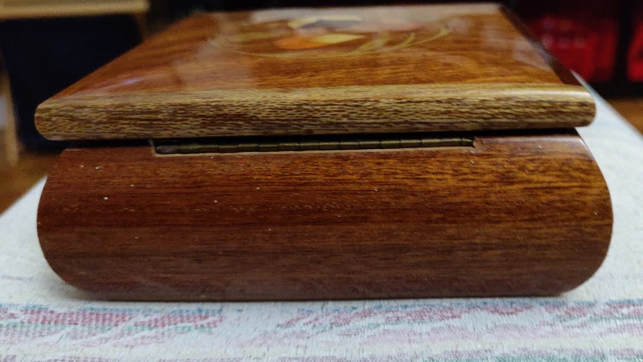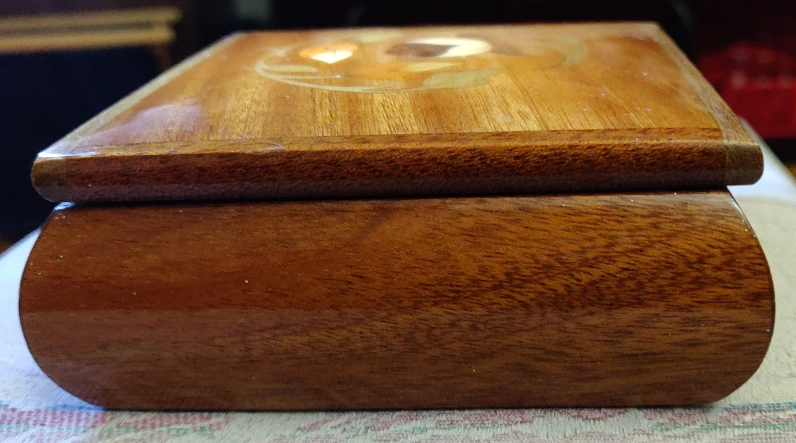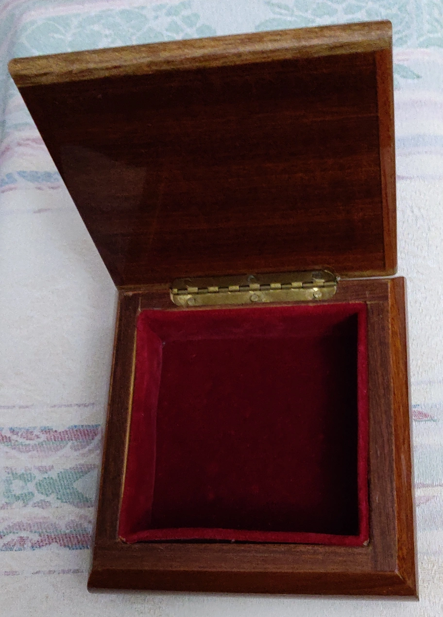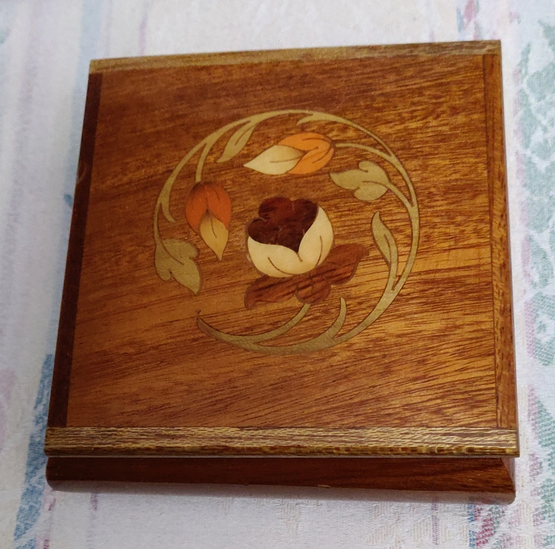 Small wooden box with a floral inlay design on the top. It has a red velvet interior and a brass hinge. The box measures 4"x4"x1.5".