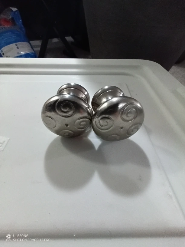 Set of two cabinet knobs with a swirl design. They are approximately 1.5 inches in diameter. The screws are included. Never used, solid high quality.