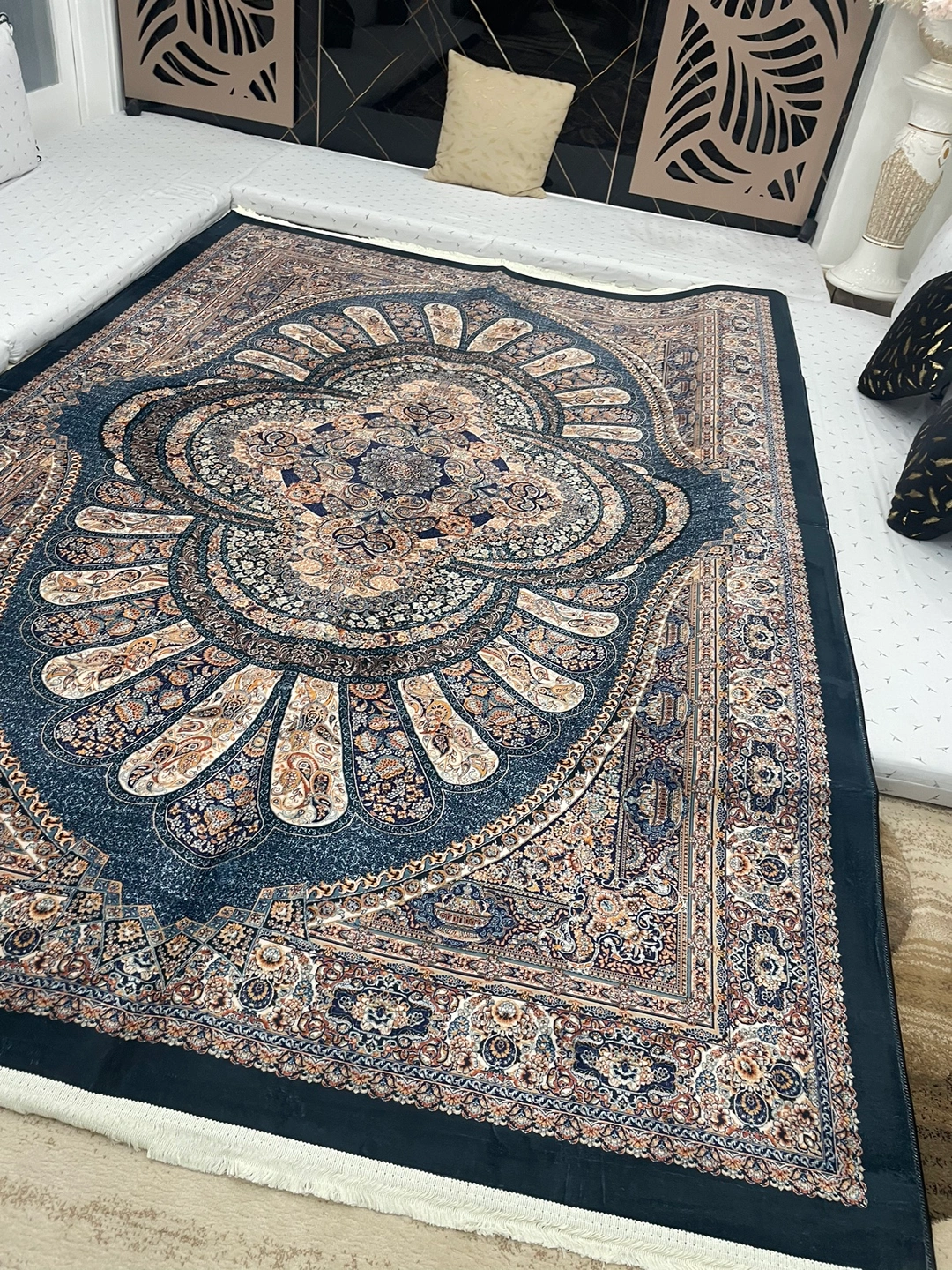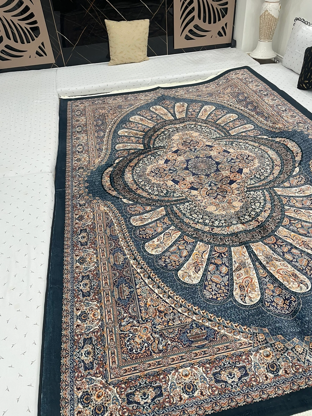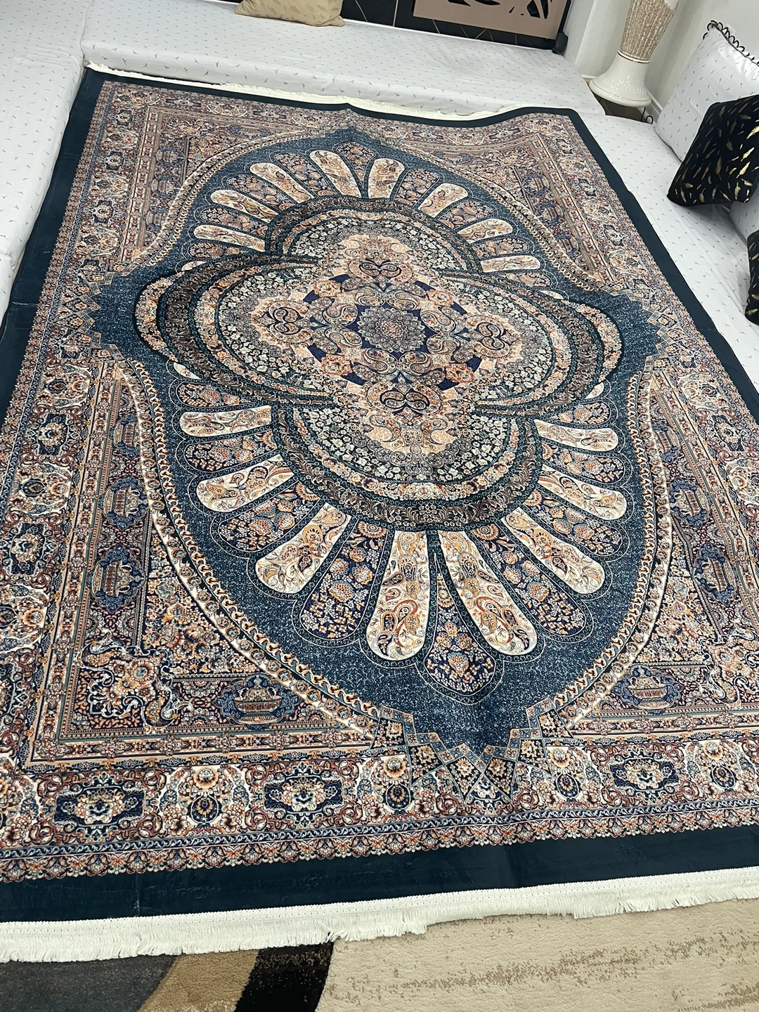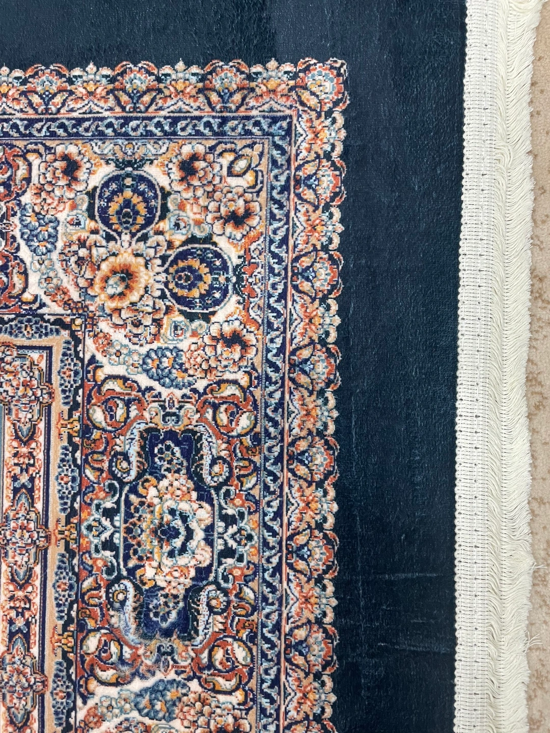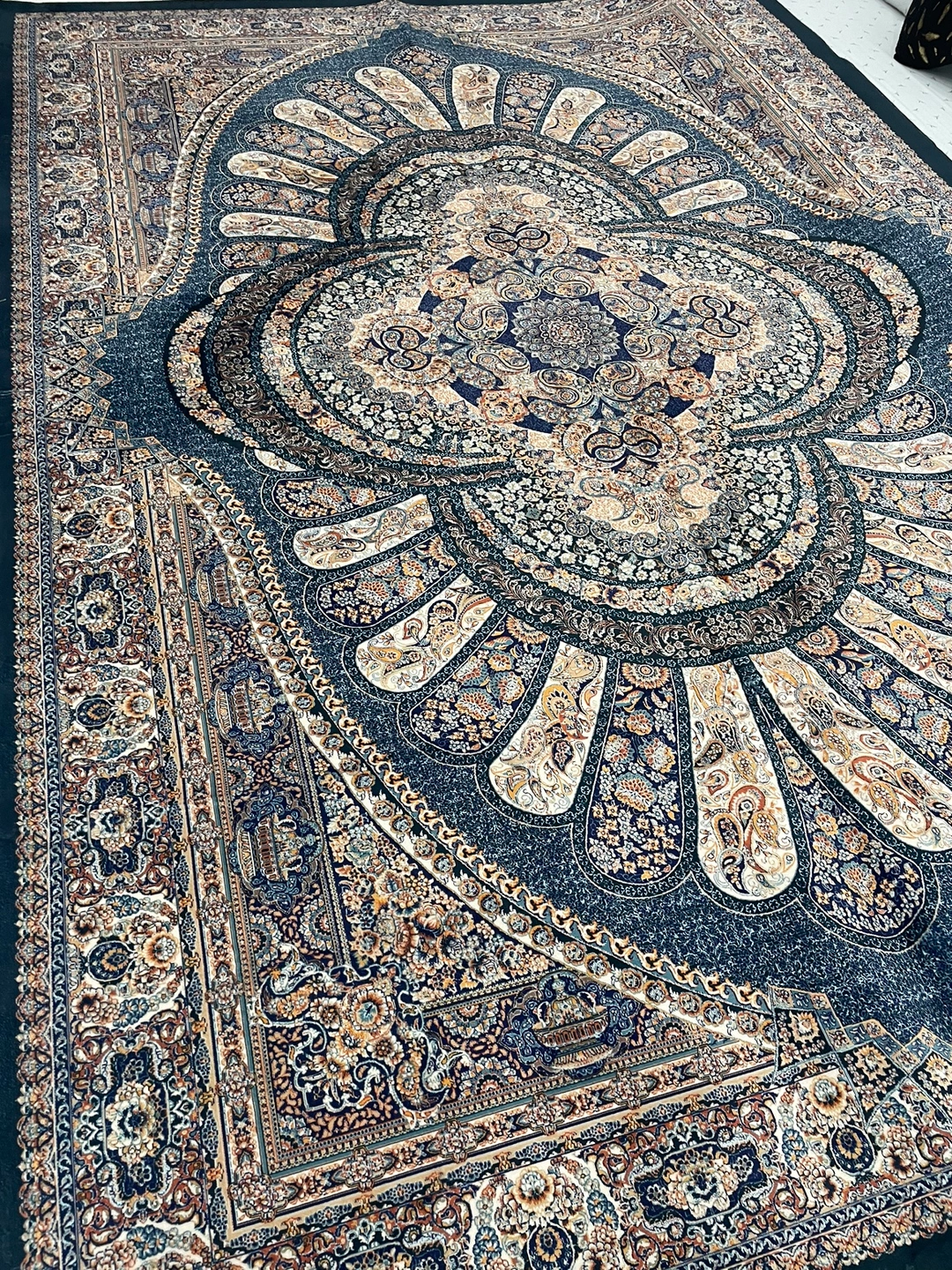 This rug is approximately 9x13 feet. It has a beautiful blue colour with brown and white floral patterns. It has a fringe border.