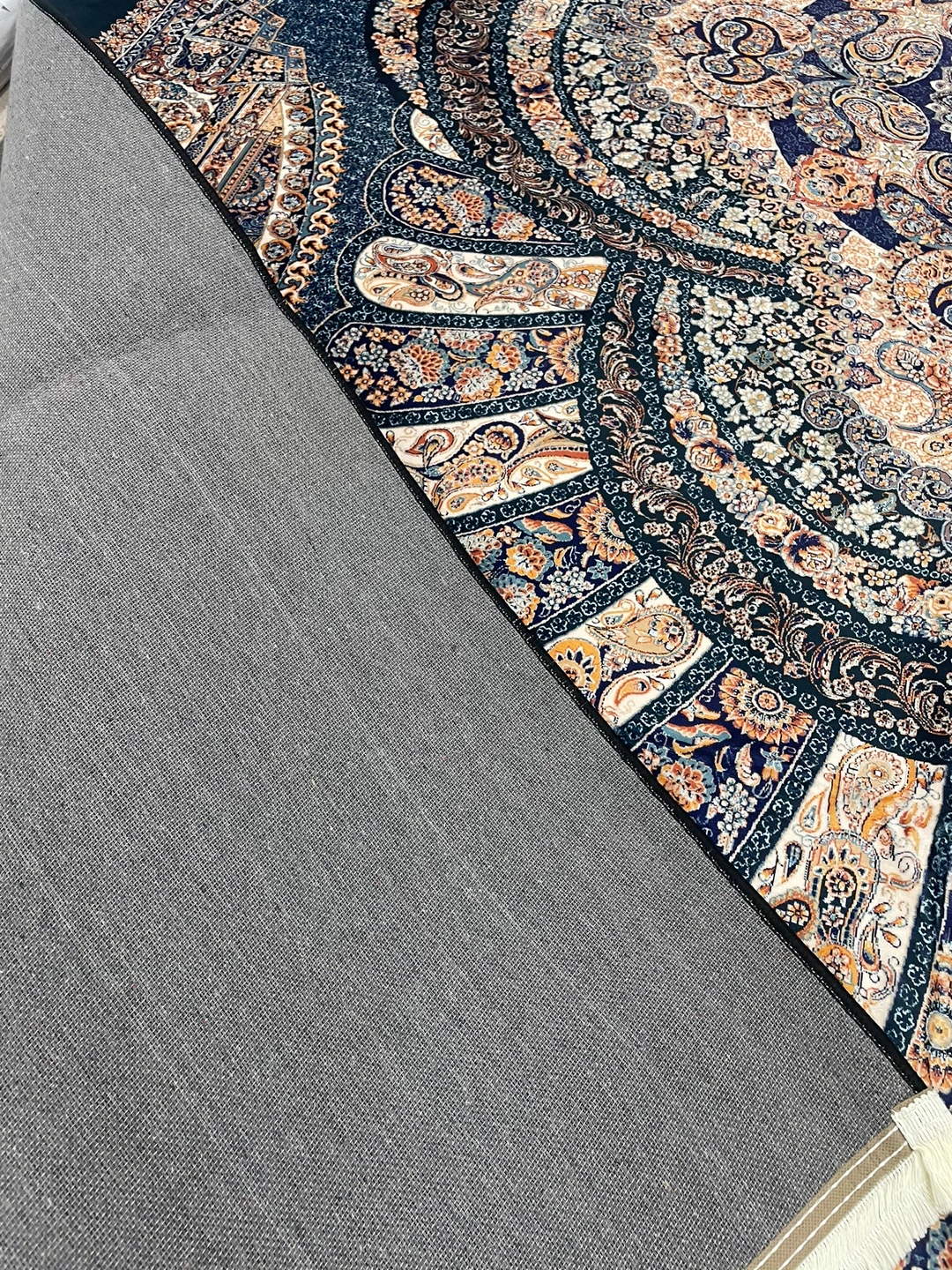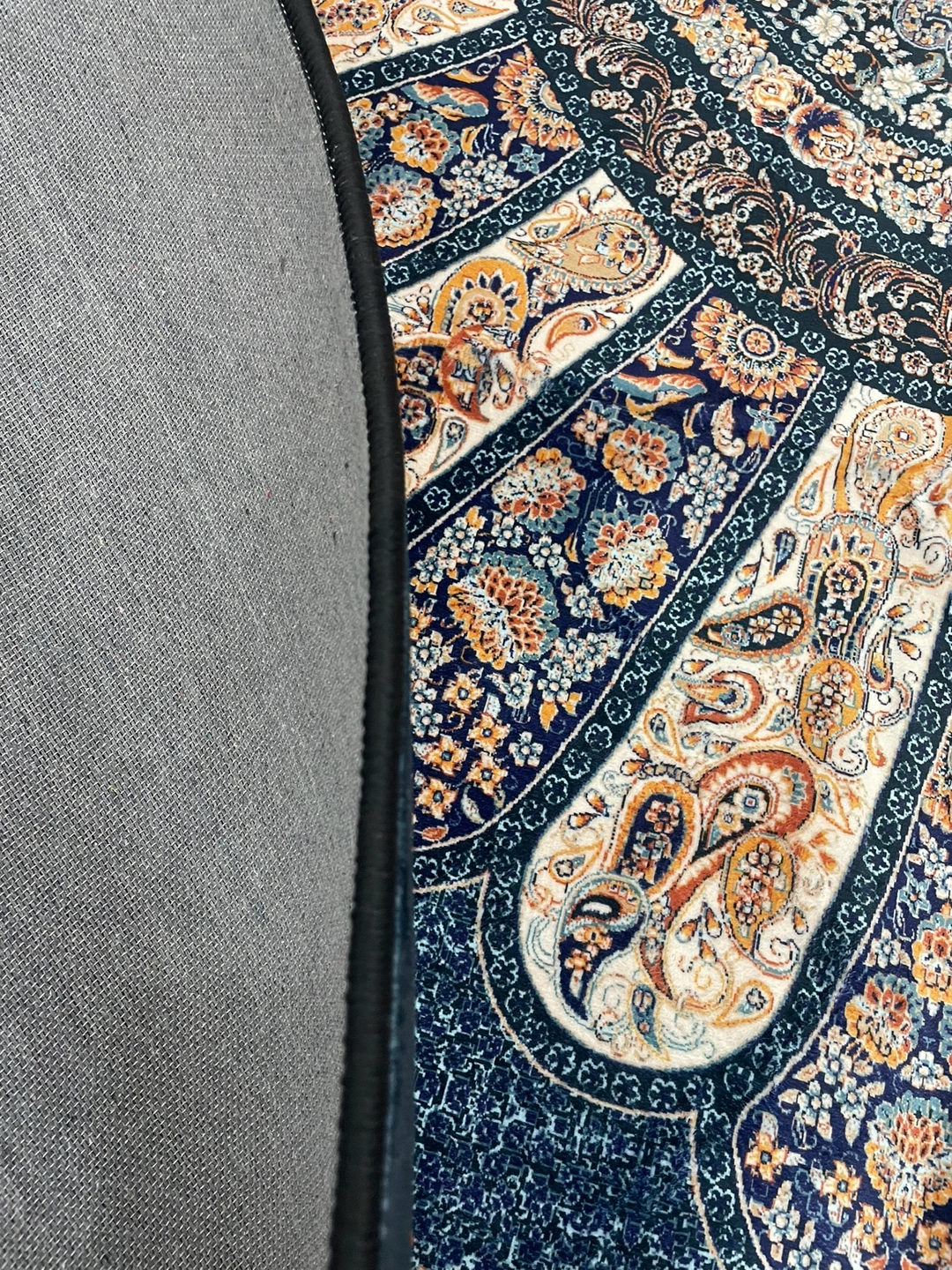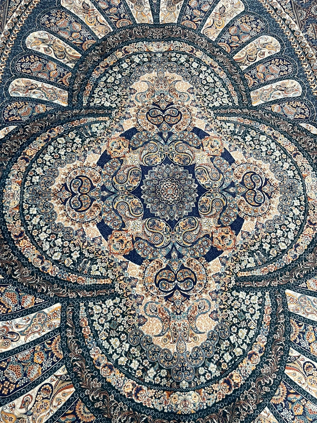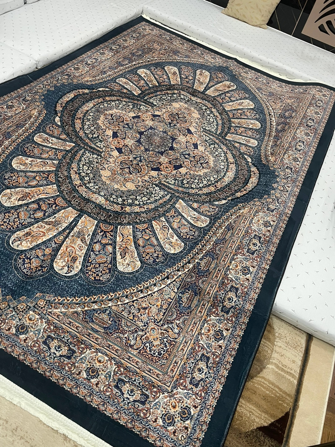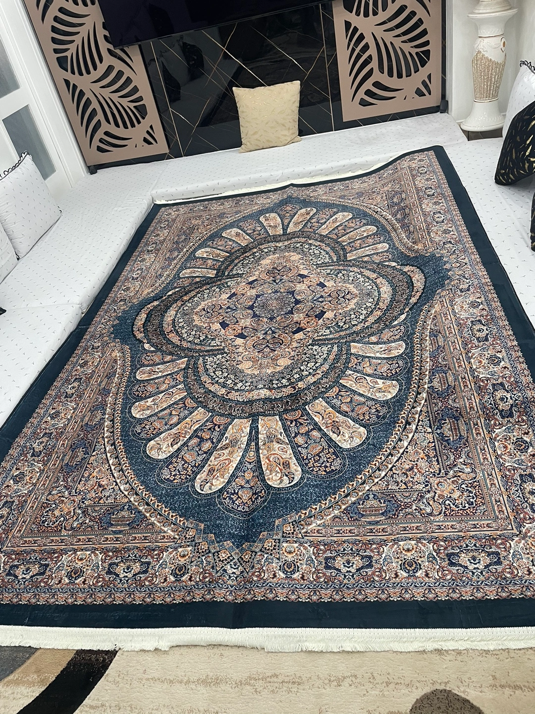 This rug is approximately 9x13 feet. It has a beautiful blue colour with brown and white floral patterns. It has a fringe border.