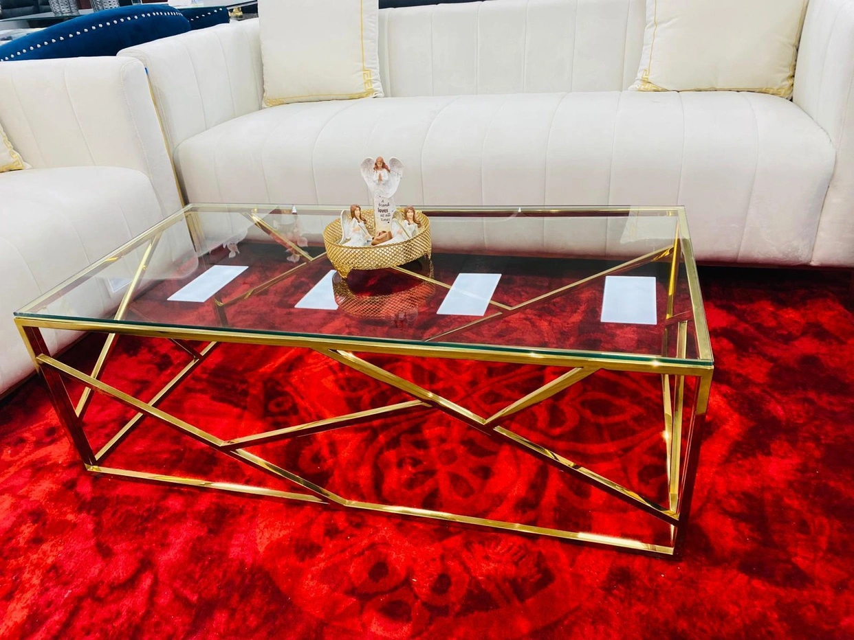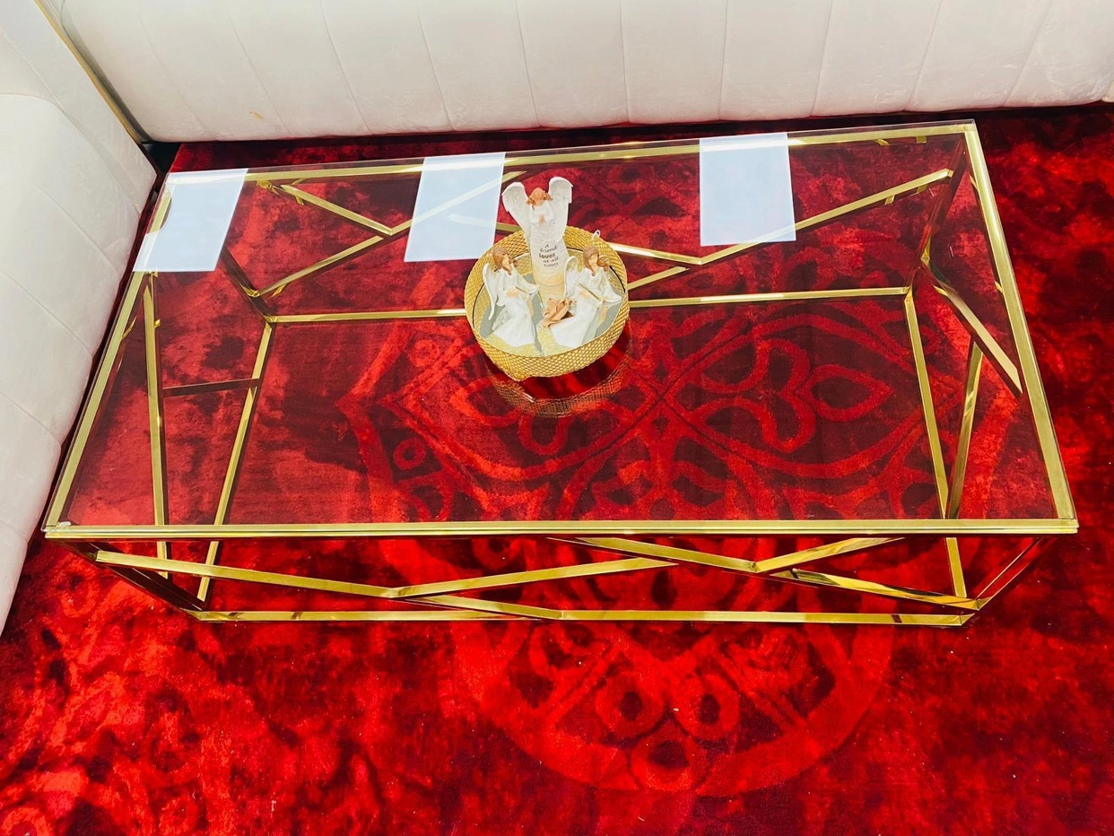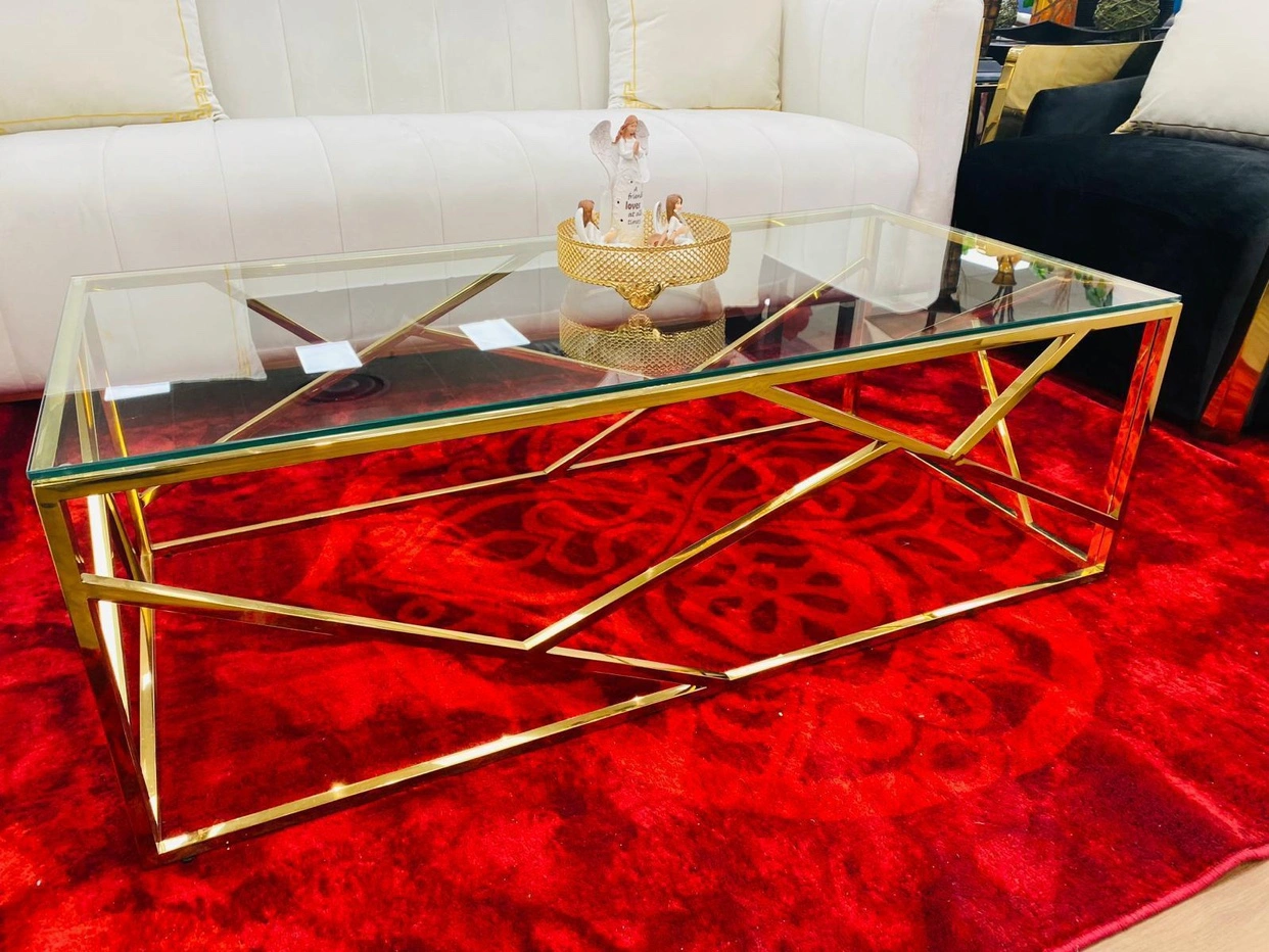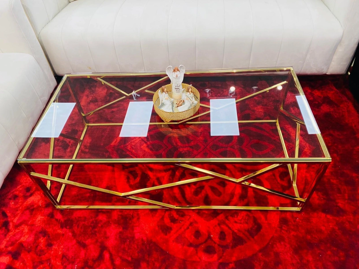 This modern coffee table features a glass top and a gold metal frame. The frame has a geometric design. It would make a great addition to your living room.