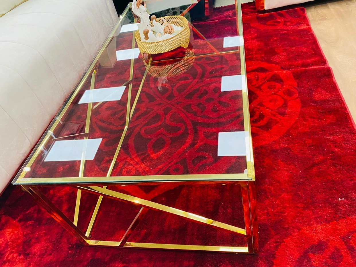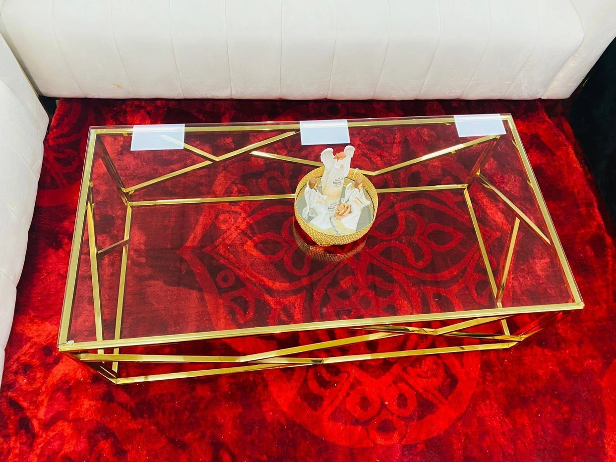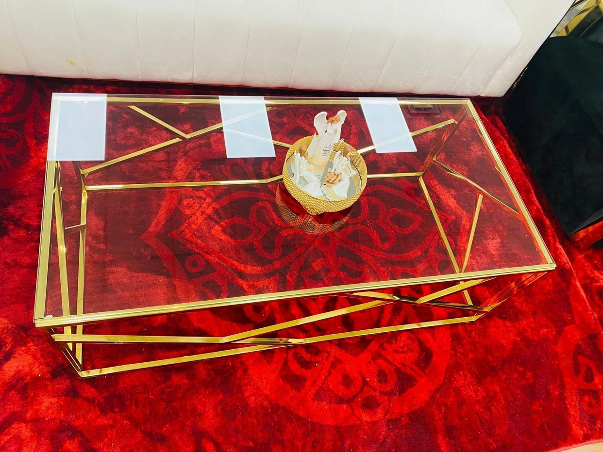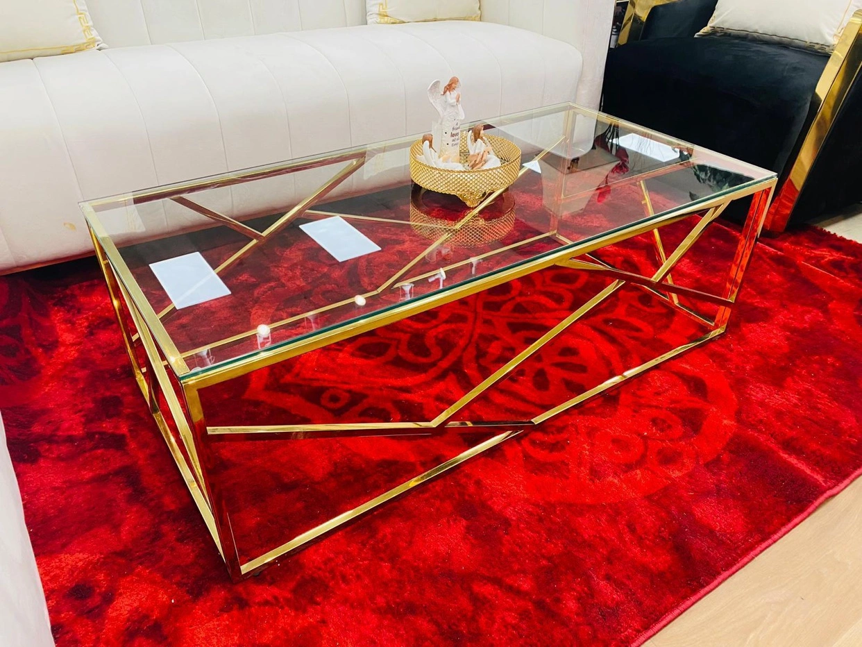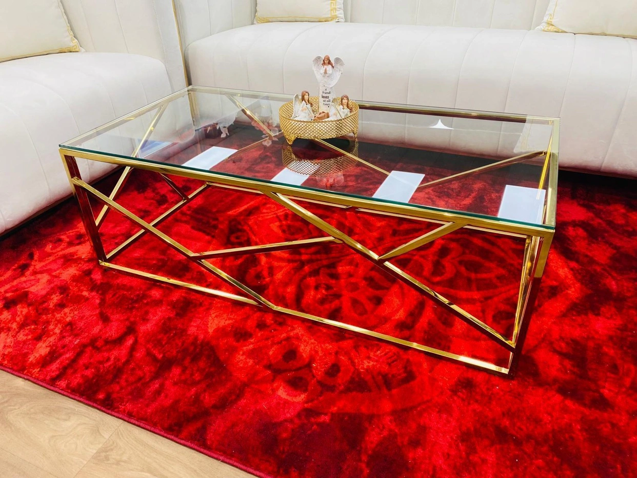 This modern coffee table features a glass top and a gold metal frame. The frame has a geometric design. It would make a great addition to your living room.