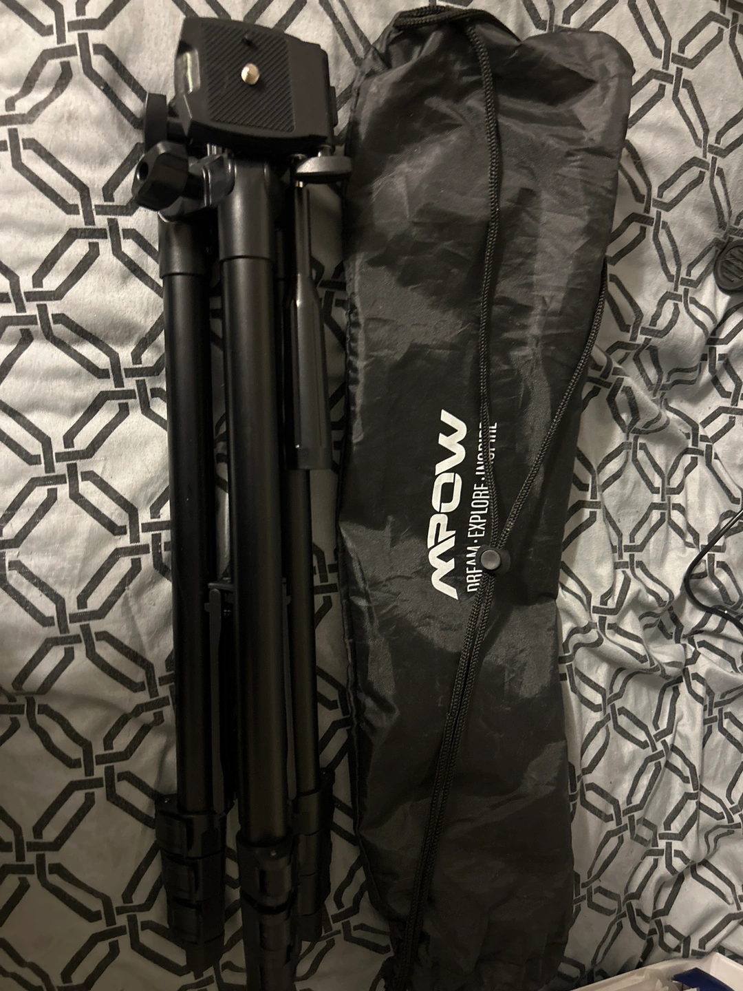 This tripod is black and comes with a carrying case. It is adjustable.