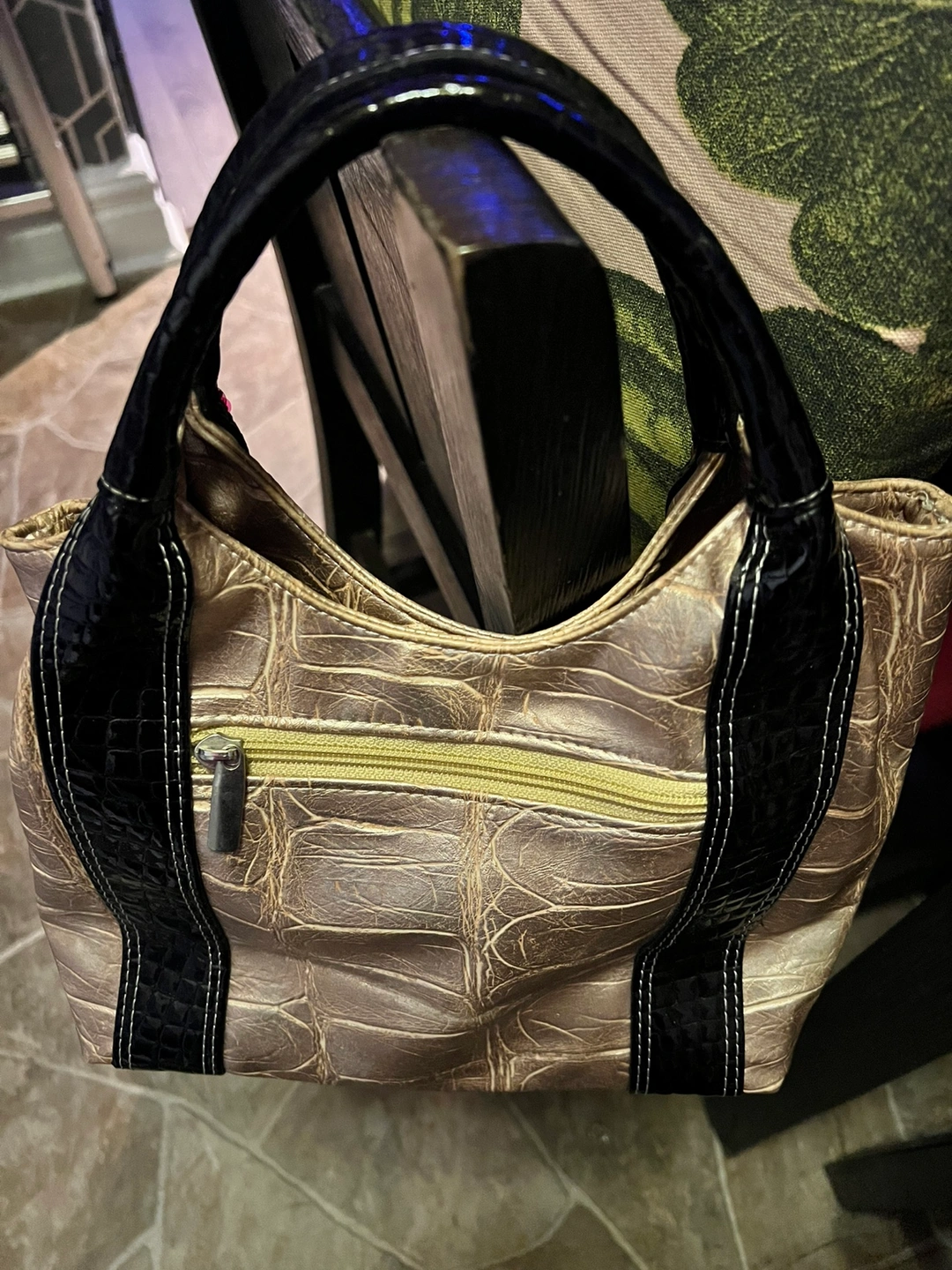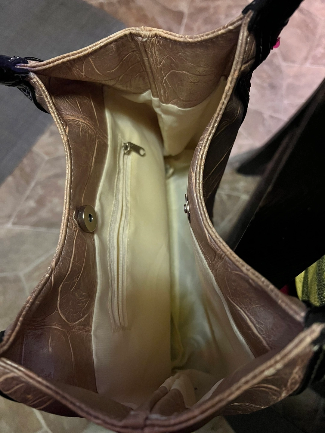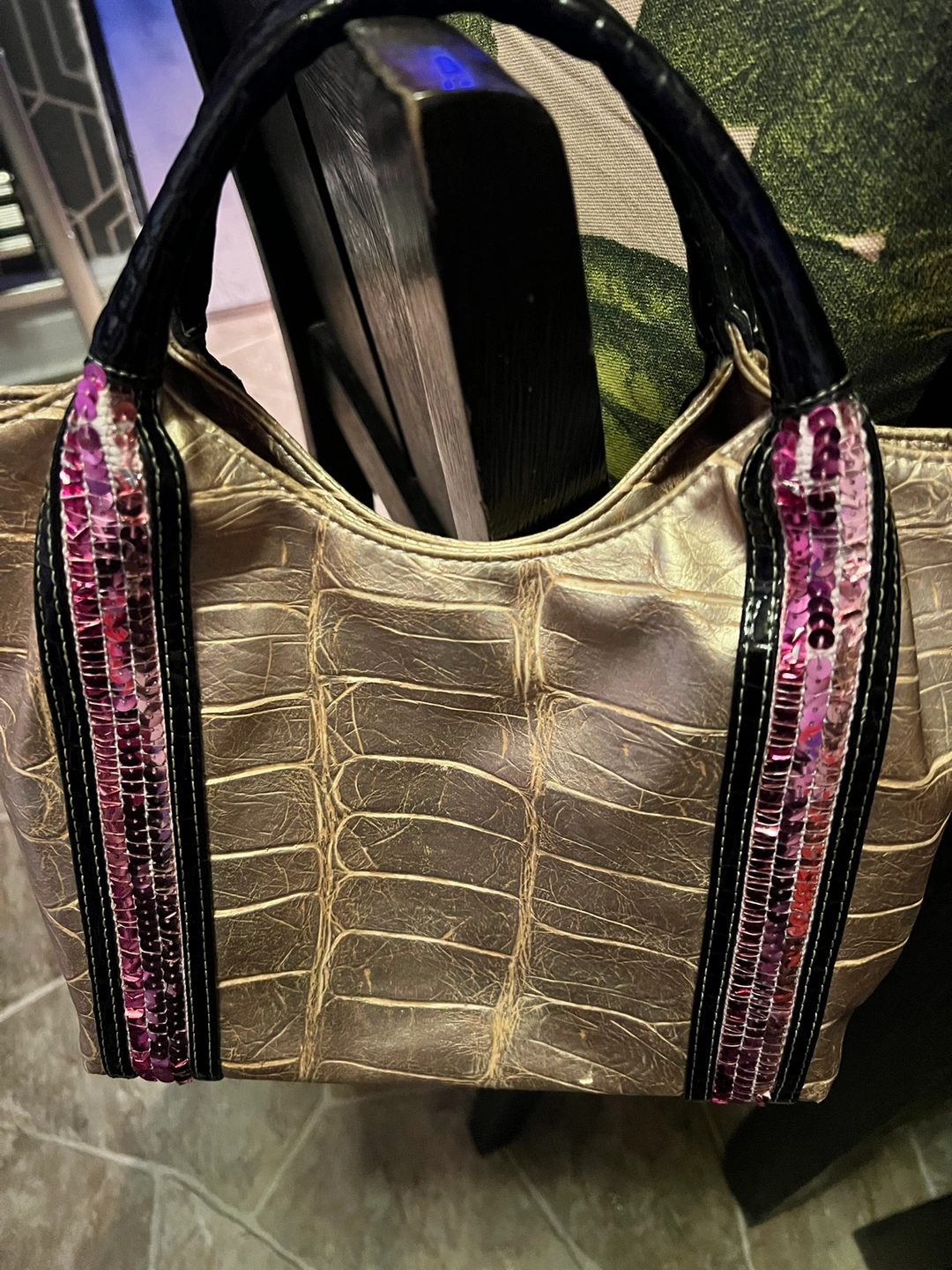 Gold handbag with black and pink accents. Features a zipper pocket on the inside.