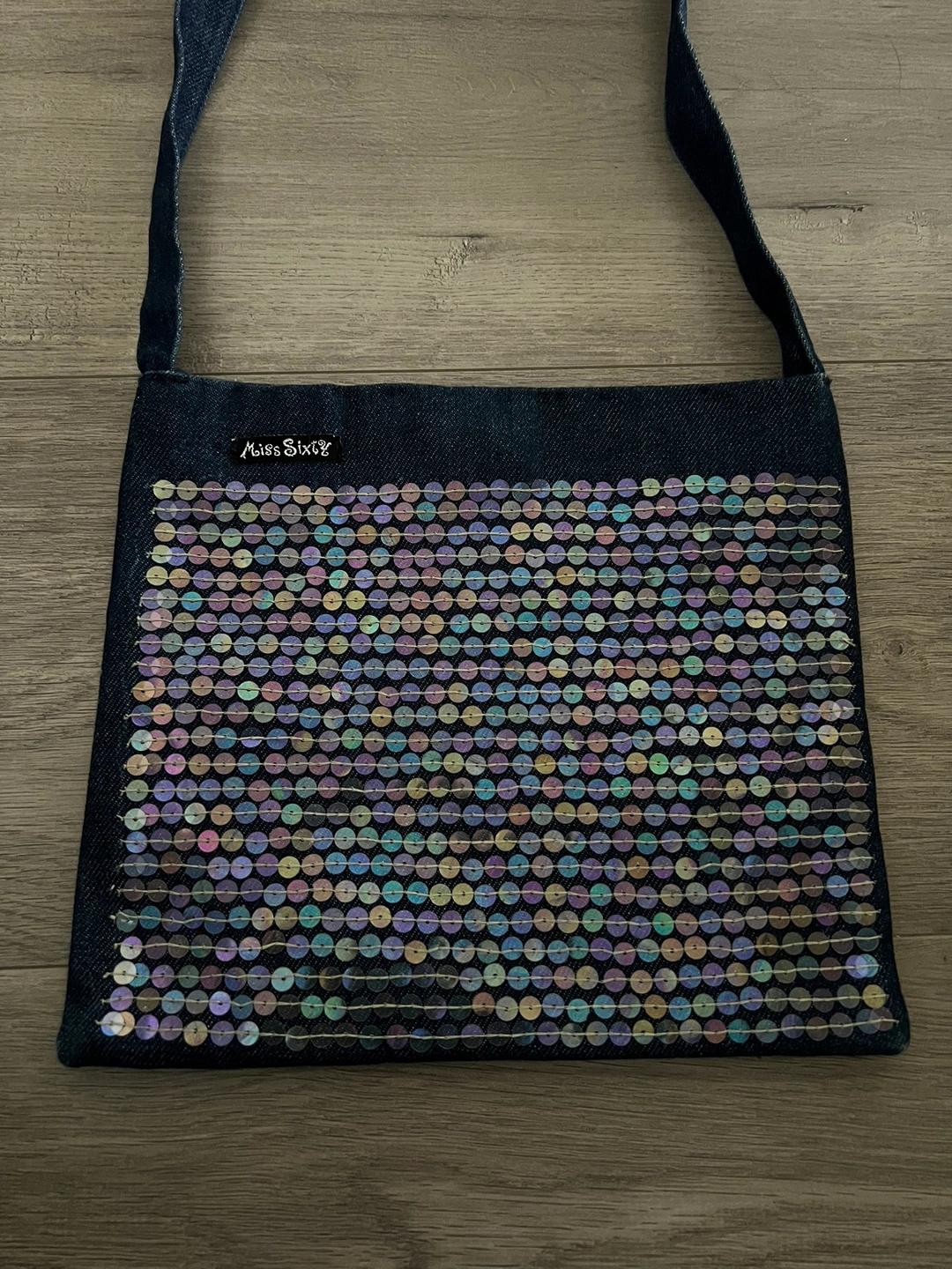 Denim cross body with a long strap and iridescent sequins. The bag is in good condition. It has a magnetic closure at the top. It is the perfect bag to add some sparkle to any outfit. By Italian Designer Label Miss Sixty