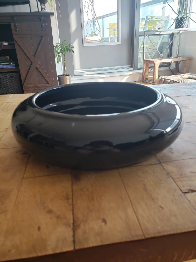 A large, black ceramic bowl with a wide, shallow base. It's perfect for a variety of uses, like holding fruit, treats/candy, displaying decorative pieces or for potting your plants.